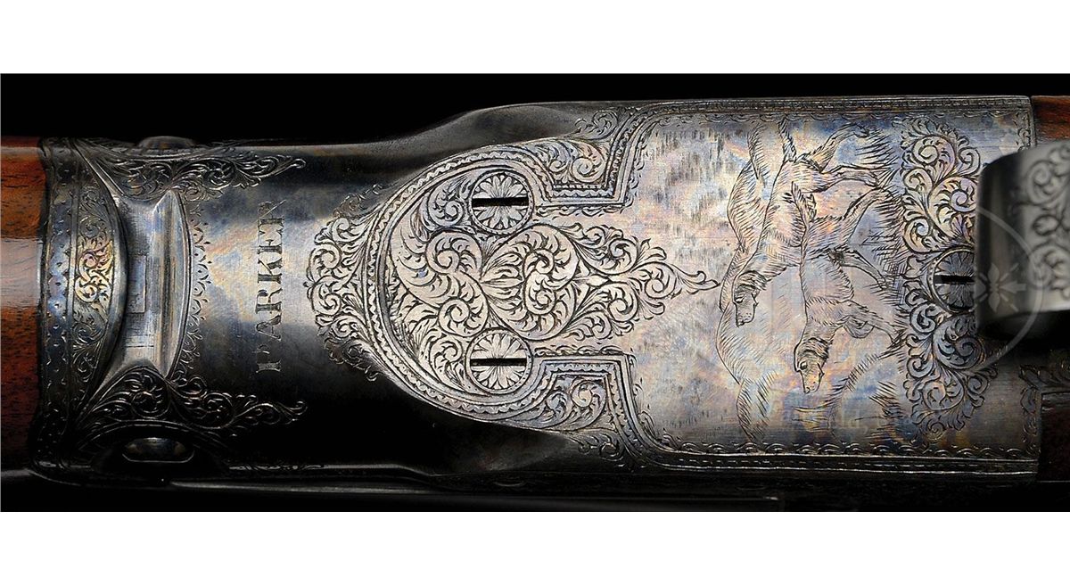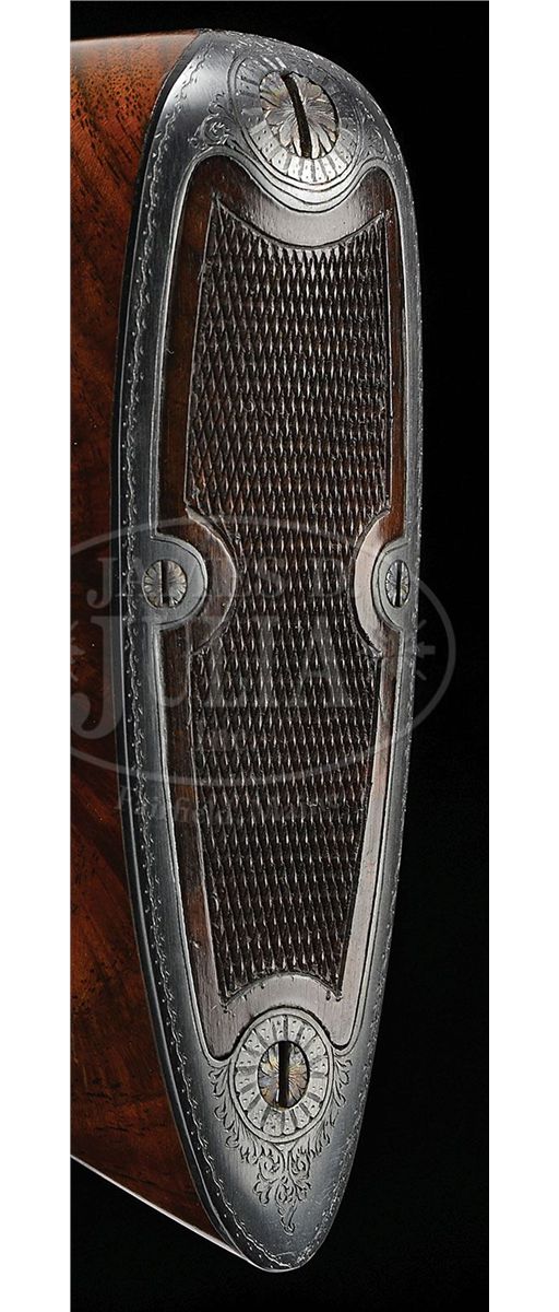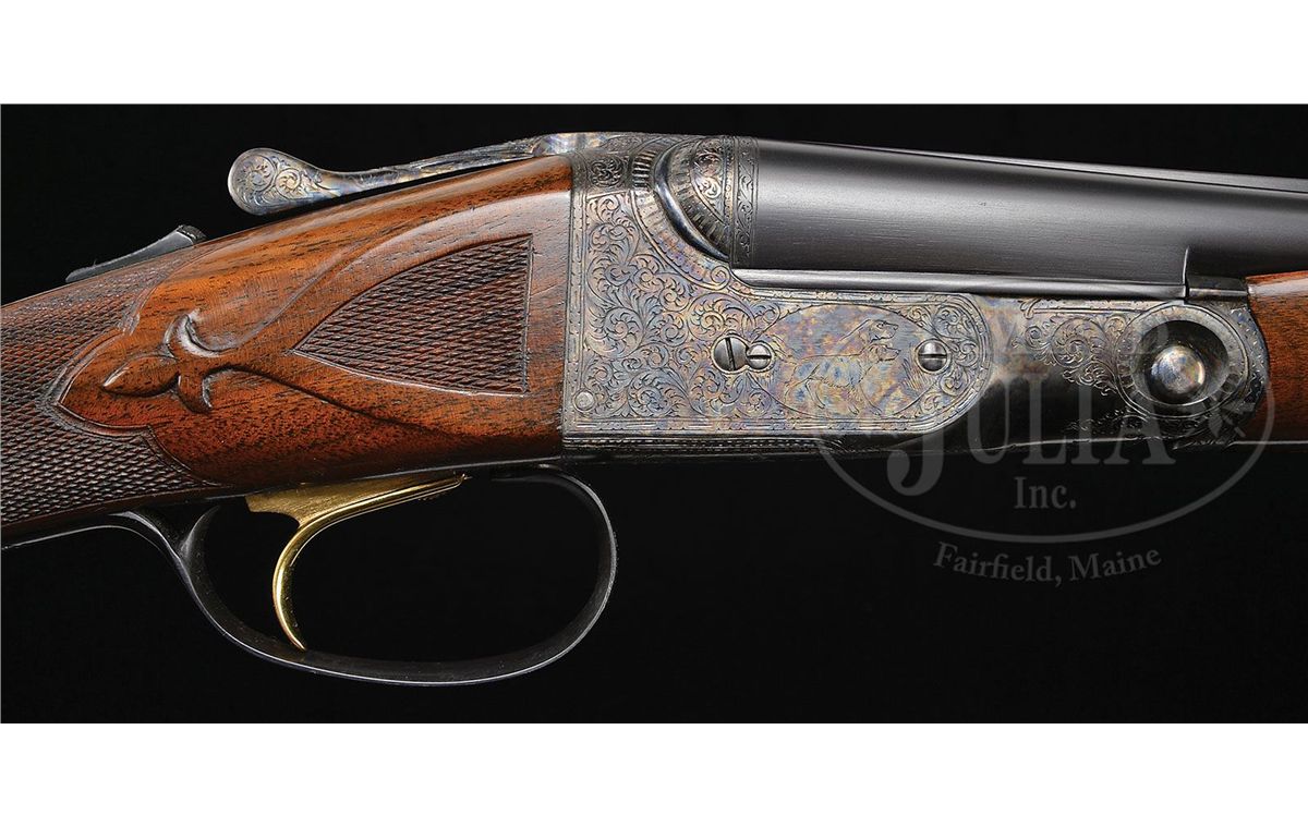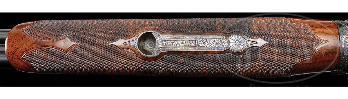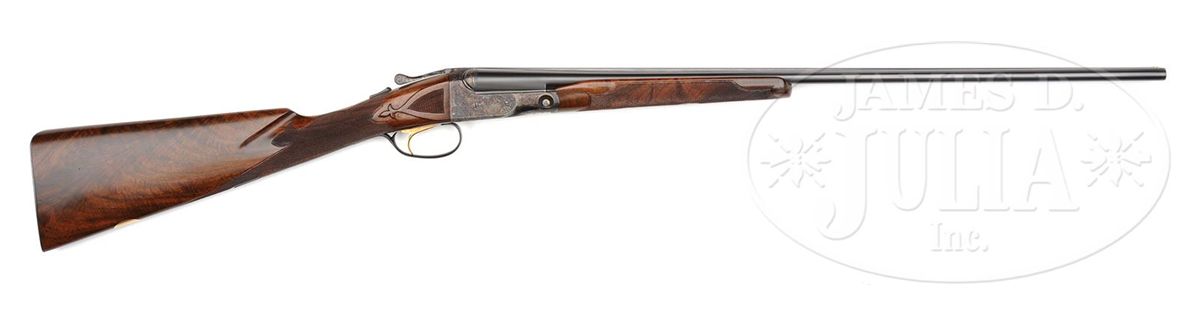 SN 240798. Cal. .410. 3" Chambers. 000 Frame. 26" Bbls. Starting with a VHE single trigger in .410, this attractive little gun was created by changing "steel" designation on rib to "Acme", changing stamp on bottom to an "A" within circle, changing marks on water table to "BH" and "5", filing in chevron on top lever, and filing in single bead around fences. Action is engraved in typical "B" style with medium scroll, two dogs on each side of action. Interesting scene of setters in hilly open prairie is on trigger plate, and "Parker" on bottom of action. Very fine, flame crotch figured American walnut buttstock measures 14-5/16" over skeleton steel buttplate. Checkered side panels have fleur-di-lis drop points. Checkering at grip is a faithful copy of typical "B" pattern with fancy mullered borders. A vacant gold oval is on toe line. Matching beavertail ejector forend does not have reinforcing bolt. Bore diameter at muzzles: left-.404, right -.405. Wall thickness: left -.033, right -.029. Drop at heel: 2-1/4", drop at comb: 1-1/2". Weight: 6 lbs. 5 oz. LOP: 14-5/16". CONDITION: Excellent, essentially new, as upgraded and refinished. Wood and metal retain essentially all of their new finishes. There are some minor light spots at breech end of left bbl. Color hardening is at essentially 100%. There are one or two light marks in finish of stocks. Bores are excellent. Action is tight. Ejectors are in time. Trigger works. These upgraded guns represent a considerable value in today's market, usually available at a fraction of their cost of production. 4-48975 MGM114