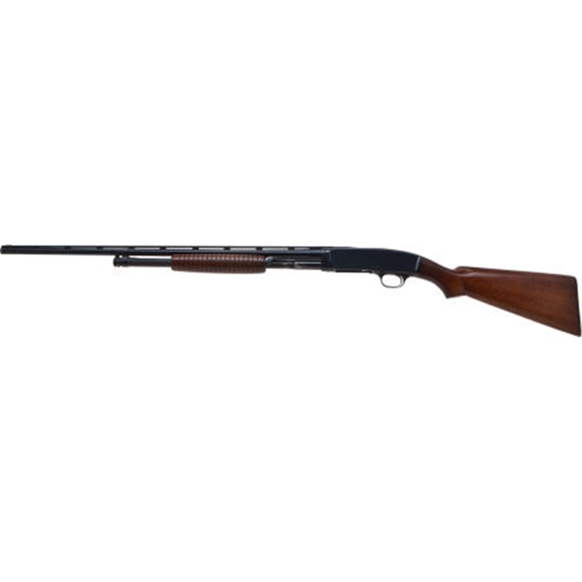 .410 Winchester Model 42 Slide Action Shotgun. Serial no. 11995. .410 bore. 26-inch barrel with Simmons ventilated rib. Barrel marked: Skeet. Oval rib posts. Rib marked: Simmons Gun Specialties Inc. Kansas, City, Mo. Blued slide action. Pistolgrip stock of straight grain walnut with maker's buttplate. Standard grooved fore-end. Data: Choke: 0.001 inches. (Cylinder). Pull: 14 inches. Condition: Excellent, as partially redone. Action and barrel show 96-98% reblued finish. Wood shows some nicks and scratches with losses to the finish. NRA FIREARMS FOR FREEDOM PROGRAM