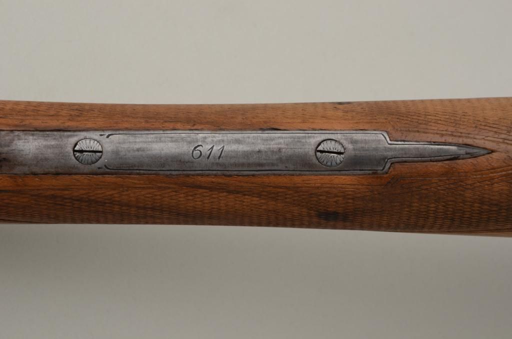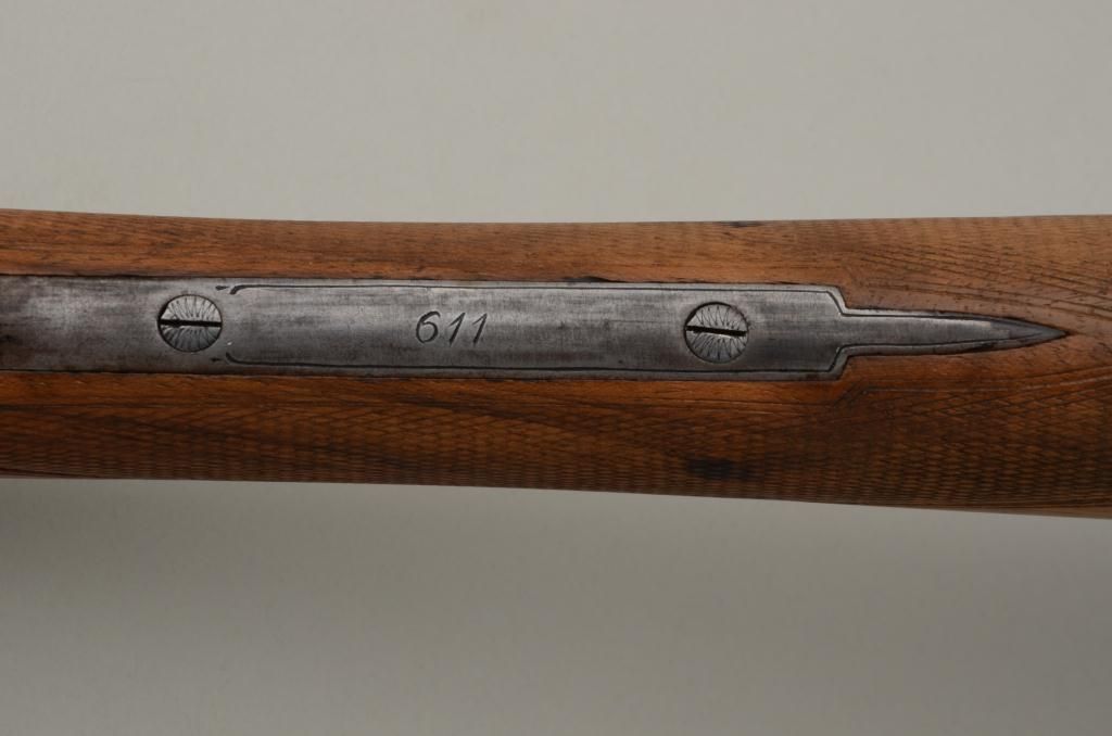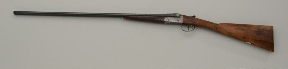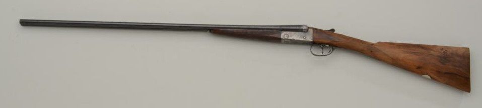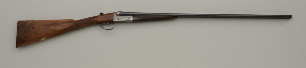 .410 gauge double barrel SxS shotgun marked 4160 on the rib with box lock action, automatic ejectors, English style straight stock, Belgian proofed, serial numbered 611 on trigger guard. The barrels measure 281/16” and the gun is 44 and nearly¾ inches in length. The arm is choked cylinder right and extra full left. The stock measures 14 ½ inches to the end of the checkered wood butt. The barrels retain approximately 75% to 85%original blue and the frame shows 40% to 60% case hardening naturally toning and aging with a small amount of scattered erosion and pitting on the barrels and frame. The box lock action shows a removable bottom platewhich retains most of its blue. The gun is proofed only with Belgian proofs of the smokeless era and shows 2 ¾” chambers with very good bores that may clean to excellent. The gun locks tight and there’s no mechanical problems. The stock has had some light sanding and stripping on the butt stock and needs a coat of finish. The forend shows a light refinishing and is good. A very attractive and light .410 with long barrels
