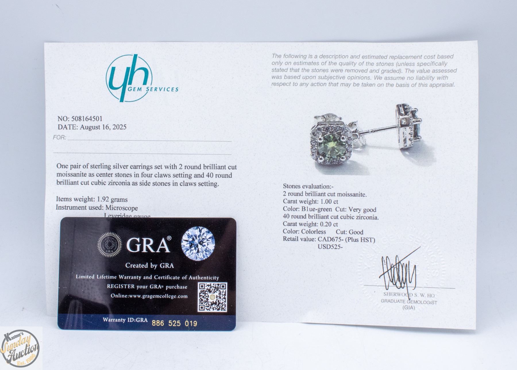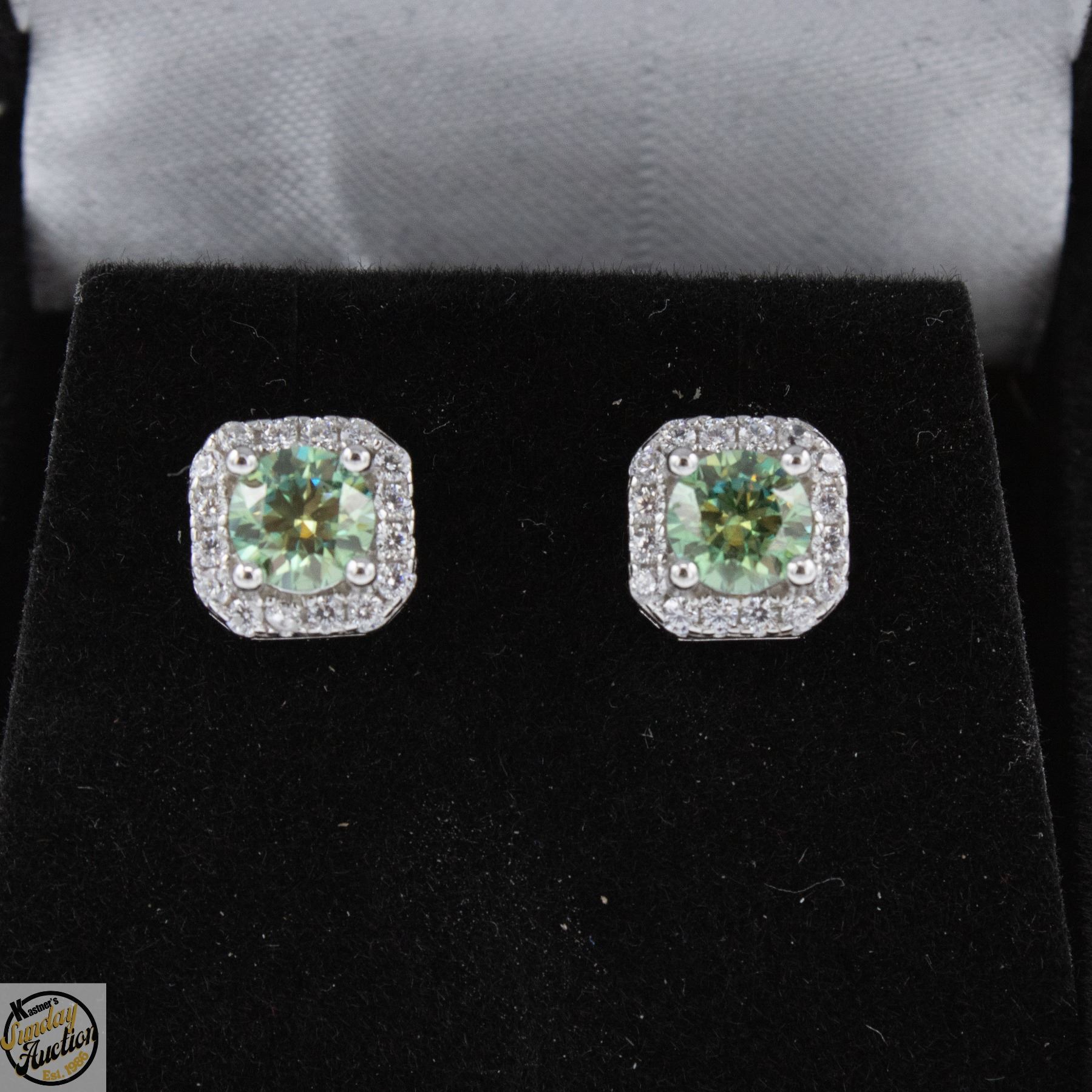 MOISSANITE STONE VVS BLUE GREEN COLOR WITH 40 ROUND BRILLIANT CUT CUBIC ZIRCONIA SET IN SQUARE HALO SET IN 925 SILVER EARRINGS RETAIL VALUE $675.00 **ALL ITEMS MUST BE REMOVED BY 5PM SATURDAY, APRIL 11TH 2026. ALL REMAINING ITEMS WILL BE SUBJECT TO A $6.00 PER DAY STORAGE CHARGE. ANY ITEMS REMAINING AFTER MONDAY, APRIL 27TH 2026 WILL BE CONSIDERED FORFEITED. NO REFUNDS WILL BE ISSUED FOR FORFEITED ITEMS. TO SCHEDULE A PICK UP APPOINTMENT CLICK HERE