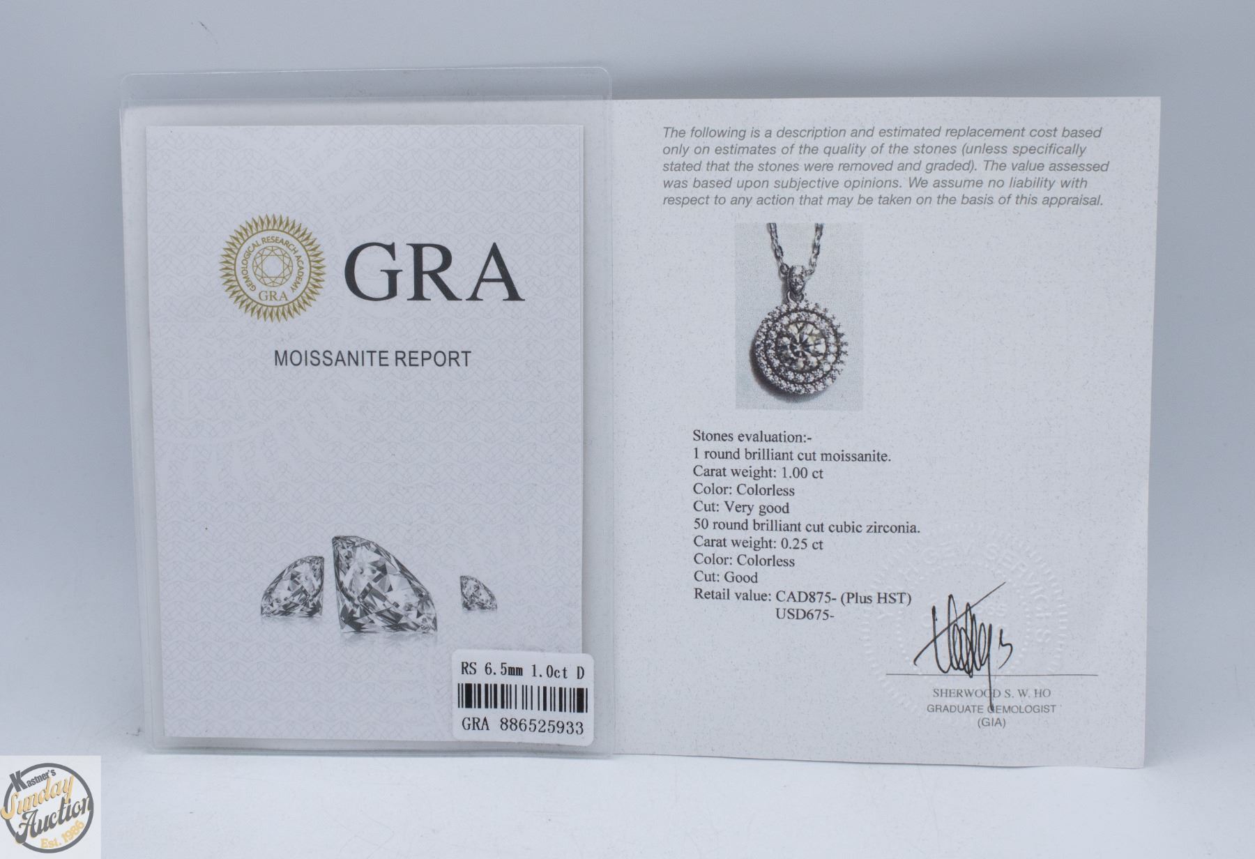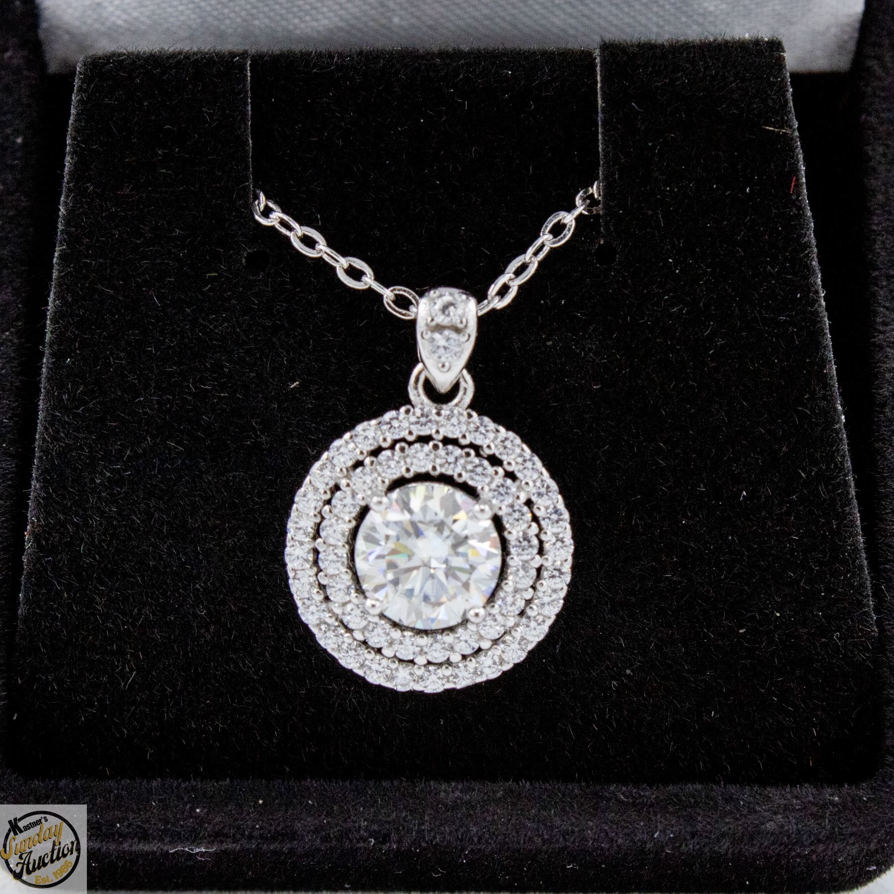 MOISSANITE STONE VVS D COLOR WITH 50 ROUND BRILLIANT CUT CUBIC ZIRCONIA SET IN DUAL HALOS SET IN 925 SILVER PENDANT RETAIL VALUE $875.00 **ALL ITEMS MUST BE REMOVED BY 5PM SATURDAY, APRIL 11TH 2026. ALL REMAINING ITEMS WILL BE SUBJECT TO A $6.00 PER DAY STORAGE CHARGE. ANY ITEMS REMAINING AFTER MONDAY, APRIL 27TH 2026 WILL BE CONSIDERED FORFEITED. NO REFUNDS WILL BE ISSUED FOR FORFEITED ITEMS. TO SCHEDULE A PICK UP APPOINTMENT CLICK HERE