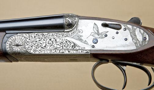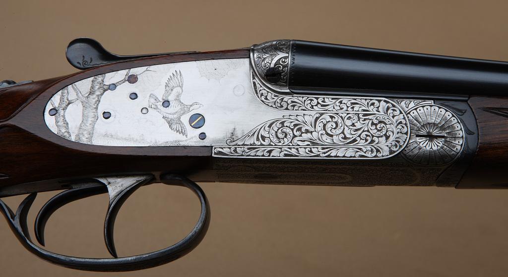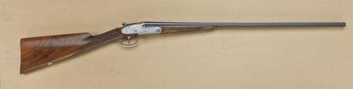 410ga full detachable sidelock double-barrel sidelock by John Powell #45 Church St. Reigate, Surrey, England. The gun shows 27-1/8” barrels, double-triggers, auto ejectors, English style straight pistol gripstock, checkered butt, articulated or hinged front trigger, satin finish frame that is nicely engraved with scrolls and game birds. The gun is choked “Full” (right) and “Extra Full” (left). The condition is fine toexcellent with 98-99% original finish. The stock is satin finished and also is fine to excellent. The stock measures 15-1/4” from the front trigger to the end of the checkered wood butt. The barrels show a fullcomplement of British Nitro and European proofs for 3” loads. The gun is fitted with a splinter forend and is contained within its original Luggage type case with Powell label in lid. We are not familiar with this makerbut we would speculate that he imports some continental parts and finishes the arms in England from the appearance. The gun is contained within a Nirolli high-quality velvet-lined and leather-covered case. Serial