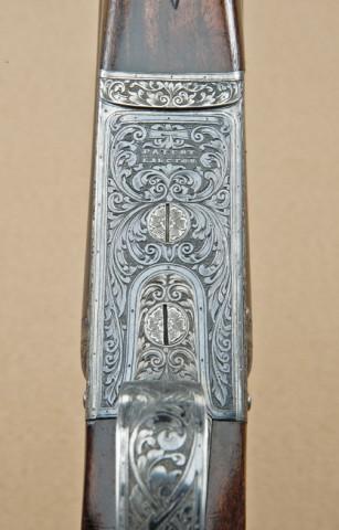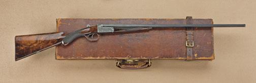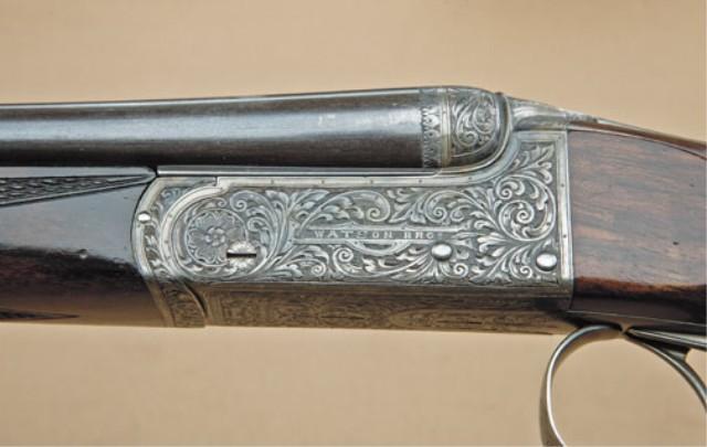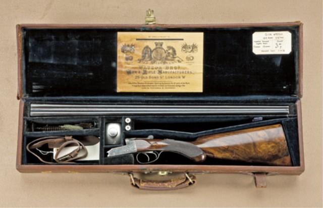 410ga side by side boxlock shotgun by Watson Brothers, 29 Old Bond St, London. 26” barrels, rounded pistol grip, English style checkered butt, double triggers, automatic ejectors, in its original luggage case with Watson Brothers label in lid, serial #8725. The gun shows nicely engraved action in floral designs and is marked “Patent Ejector” on bottom of frame. The gun shows 75-85% original blue on barrels, thinning at the edges with some just starting erosion, pinprick pitting, a few marks. The frame shows 60-80% case hardening that is dulling and drifting to silver with light colors mixed in. The triggerguard and bottom plate show 50-60% thinning blue. The select checkered walnut stocks are very good plus with just some minor mars, slight scratches, normal aging in good crisp checkering. The gun measures 14-1/2” from the front trigger to the end of the wood. The gun is nitro proofed for 2-1/2” shells and choked Improved Modified (left) and Cylinder (right). The gun weight 4.4lbs. The case is lined in blue velveteen in good condition with normal fraying and aging, full label in lid in good condition and shows information for gun #8725. The exterior of the case is embossed “Edward