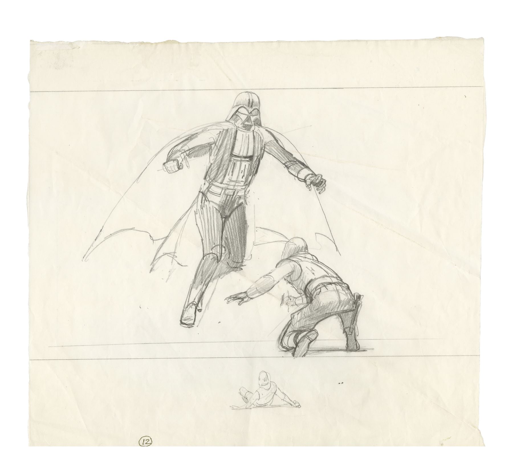 This graphite sketch on white paper depicts Vader in the air, his cape billowing behind him, over a crouched Luke Skywalker. An additional sketch of a smaller figure, fallen backwards on the ground, appears toward the bottom of the page along with the number "12." The piece exhibits a small stain along the top edge as well as creasing and minor smudging from handling and age. Dimensions: 12.25" x 13.25" (31.25 cm x 33.75 cm)