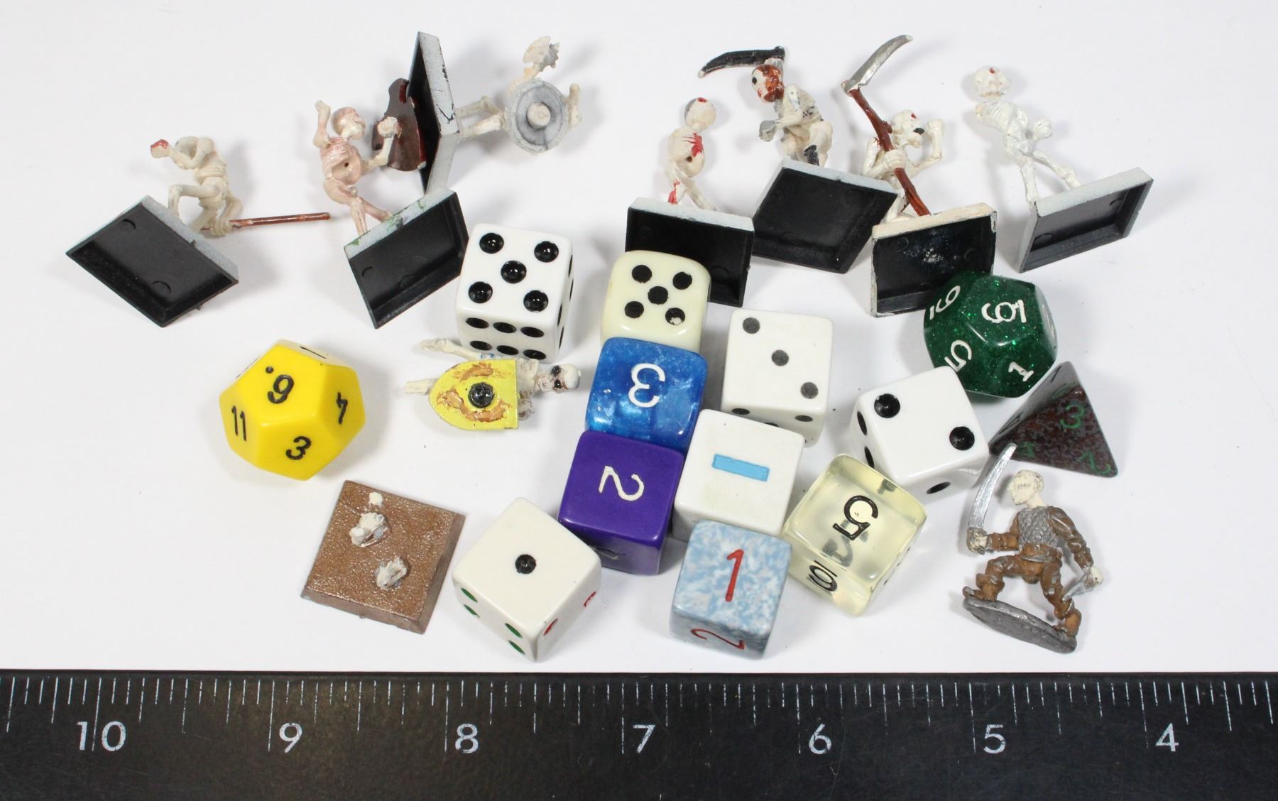 ASSORTED DICE LOT WITH MINIATURE FIGURS