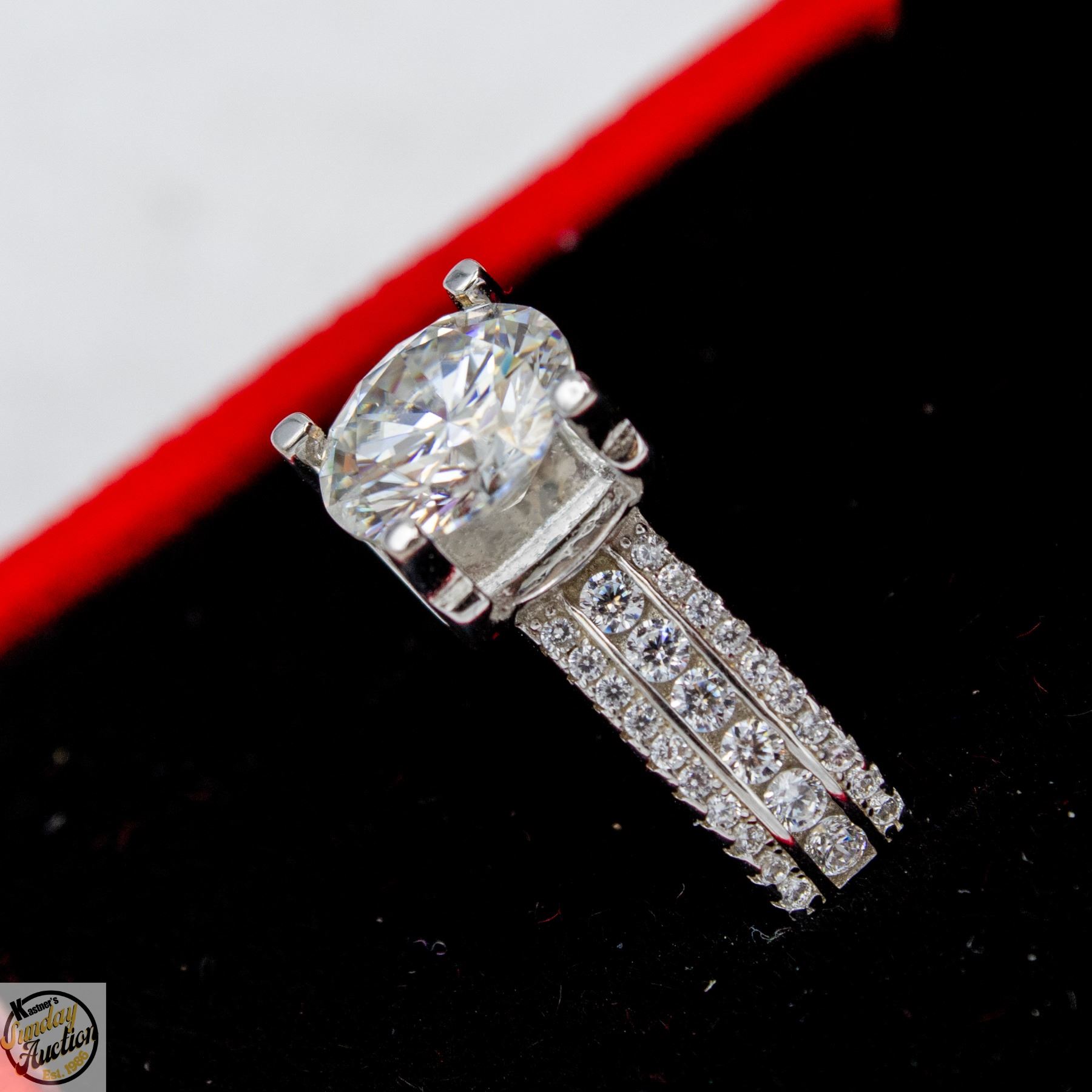 CUT MOISSANITE STONE VVS D COLOR WITH 52 ROUND BRILLIANT CUT CUBIC ZIRCONIA SET IN 3 ROWS IN SHANKS SET IN 925 SILVER RING SIZE 6 RETAIL VALUE $1,050.00 **ALL ITEMS MUST BE REMOVED BY 5PM SATURDAY, APRIL 18TH 2026. ALL REMAINING ITEMS WILL BE SUBJECT TO A $6.00 PER DAY STORAGE CHARGE. ANY ITEMS REMAINING AFTER MONDAY, MAY 4TH 2026 WILL BE CONSIDERED FORFEITED. NO REFUNDS WILL BE ISSUED FOR FORFEITED ITEMS. TO SCHEDULE A PICK UP APPOINTMENT CLICK HERE
