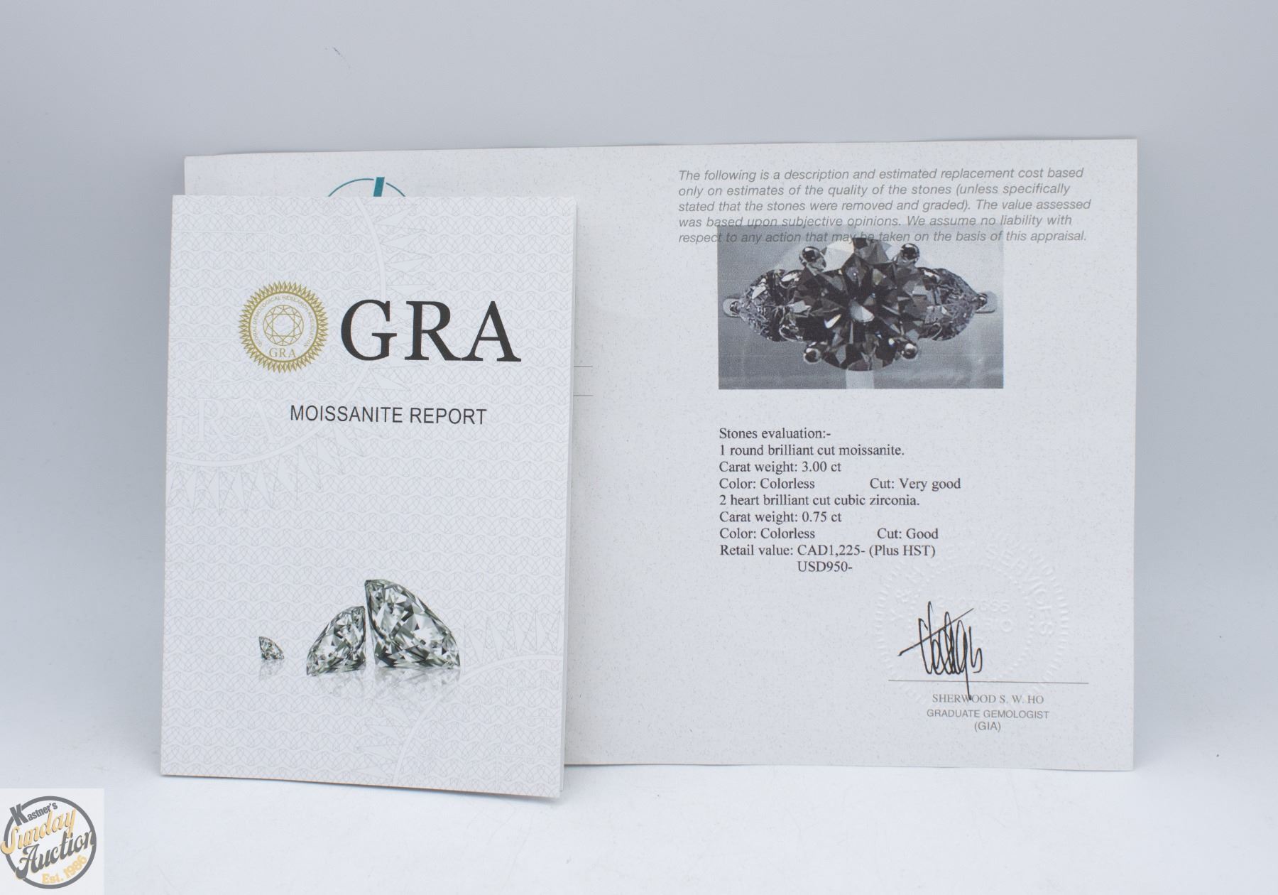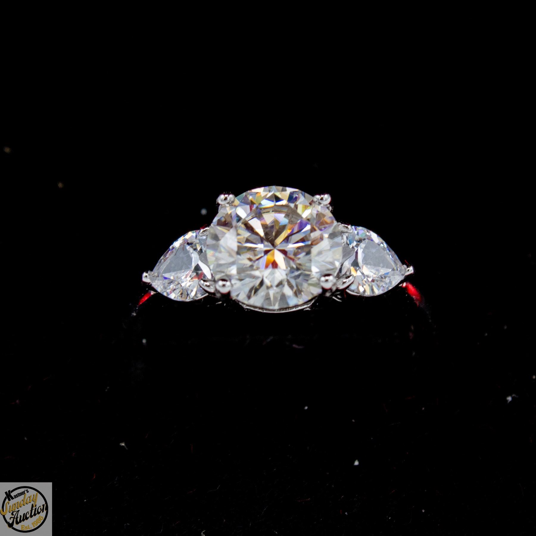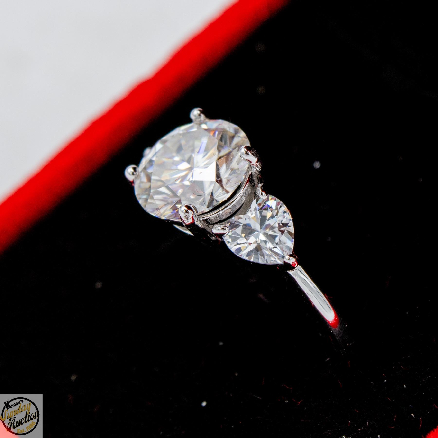 CUT MOISSANITE STONE VVS D COLOR SET IN CENTER WITH HEART SHAPED BRILLIANT CUT CUBIC ZIRCONIA SET ON EITHER SIDE SET IN 925 SILVER RING SIZE 9 RETAIL VALUE $1,225.00 **ALL ITEMS MUST BE REMOVED BY 5PM SATURDAY, APRIL 18TH 2026. ALL REMAINING ITEMS WILL BE SUBJECT TO A $6.00 PER DAY STORAGE CHARGE. ANY ITEMS REMAINING AFTER MONDAY, MAY 4TH 2026 WILL BE CONSIDERED FORFEITED. NO REFUNDS WILL BE ISSUED FOR FORFEITED ITEMS. TO SCHEDULE A PICK UP APPOINTMENT CLICK HERE