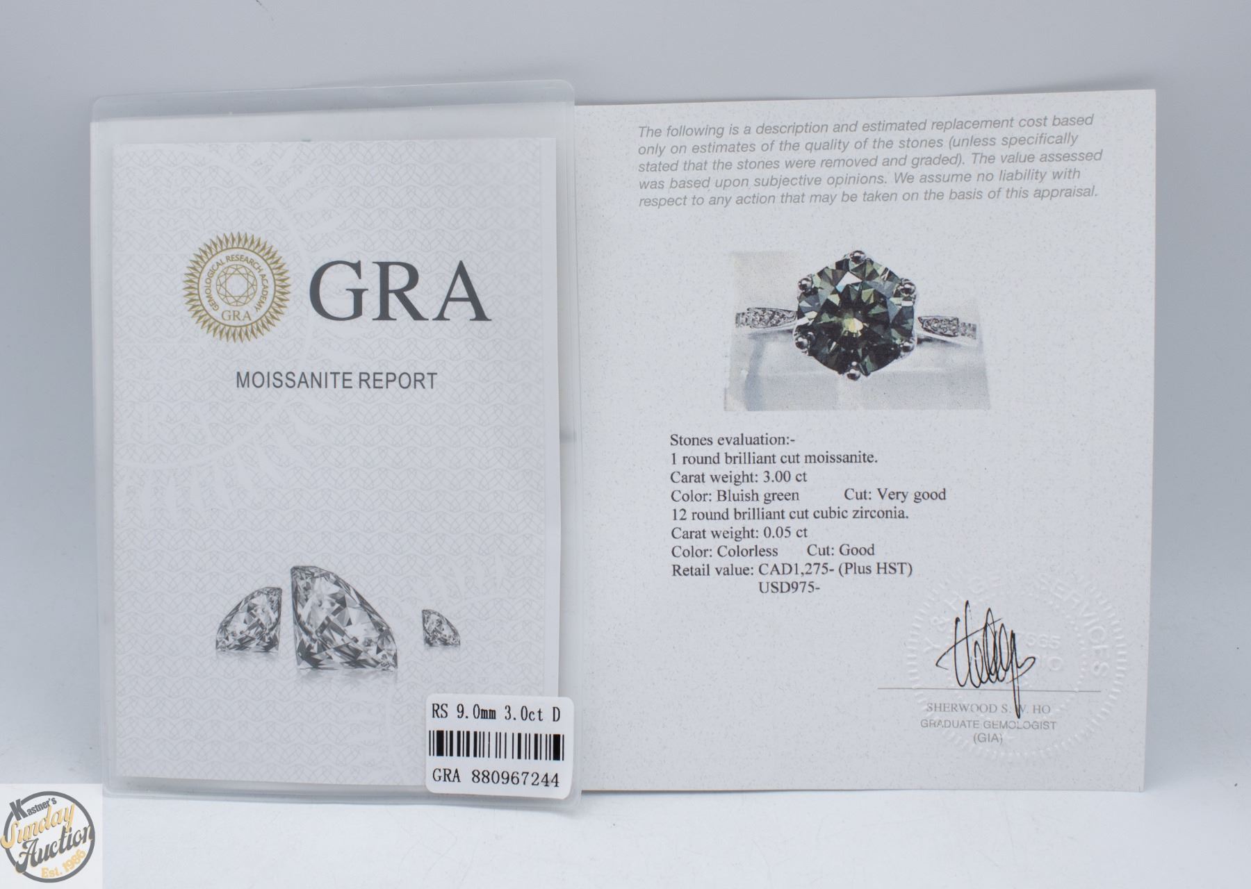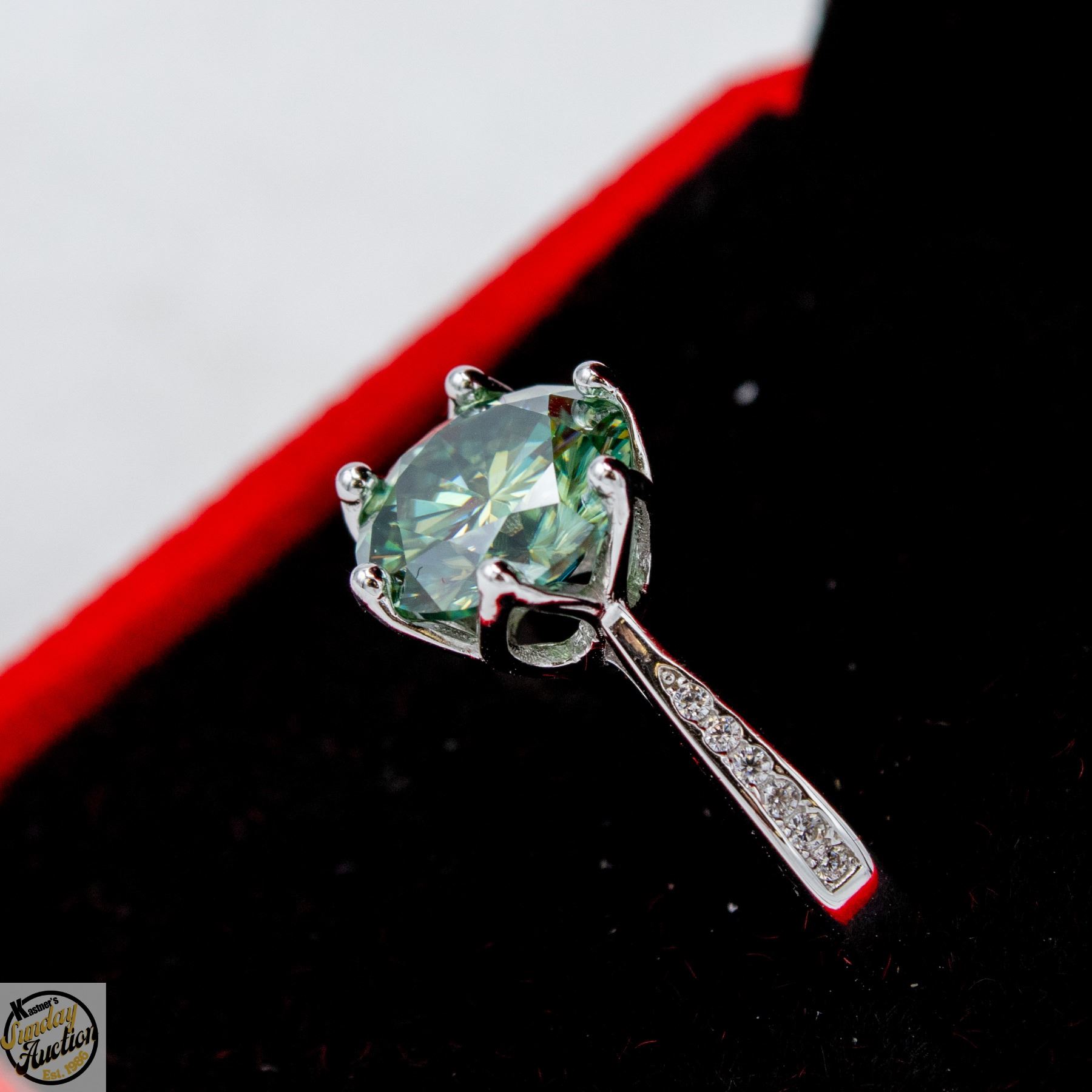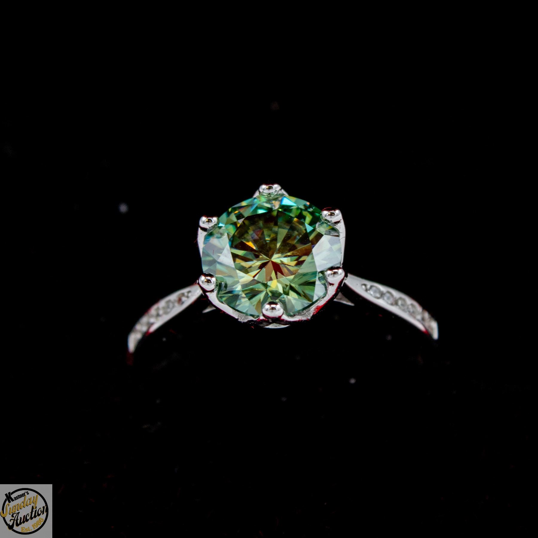 CUT MOISSANITE STONE VVS FANCY BLUE-GREEN COLOR WITH 12 ROUND BRILLIANT CUT CUBIC ZIRCONIA SET IN SHANKS SET IN 925 SILVER RING SIZE 8.25 RETAIL VALUE $1,275.00 **ALL ITEMS MUST BE REMOVED BY 5PM SATURDAY, APRIL 18TH 2026. ALL REMAINING ITEMS WILL BE SUBJECT TO A $6.00 PER DAY STORAGE CHARGE. ANY ITEMS REMAINING AFTER MONDAY, MAY 4TH 2026 WILL BE CONSIDERED FORFEITED. NO REFUNDS WILL BE ISSUED FOR FORFEITED ITEMS. TO SCHEDULE A PICK UP APPOINTMENT CLICK HERE