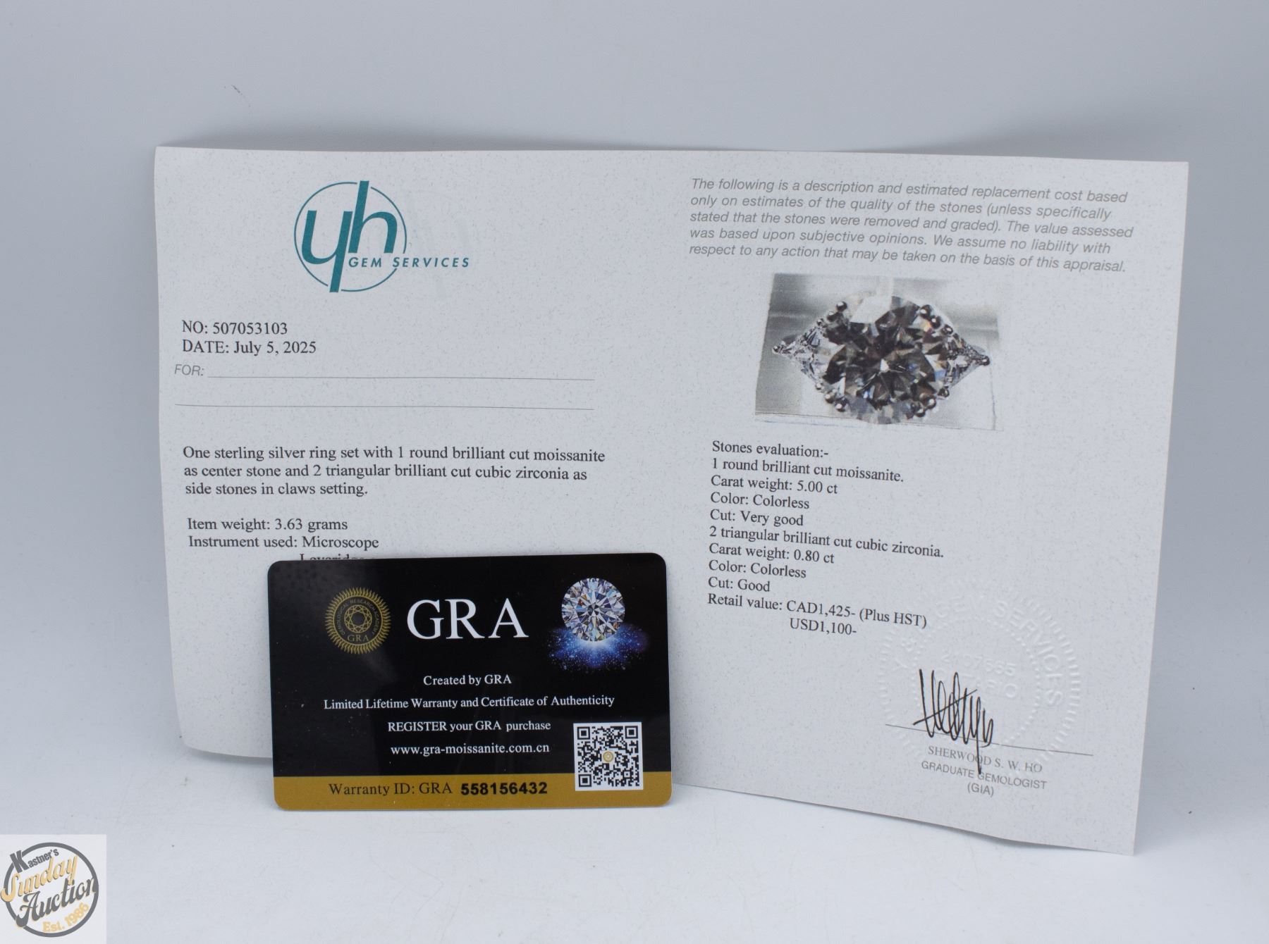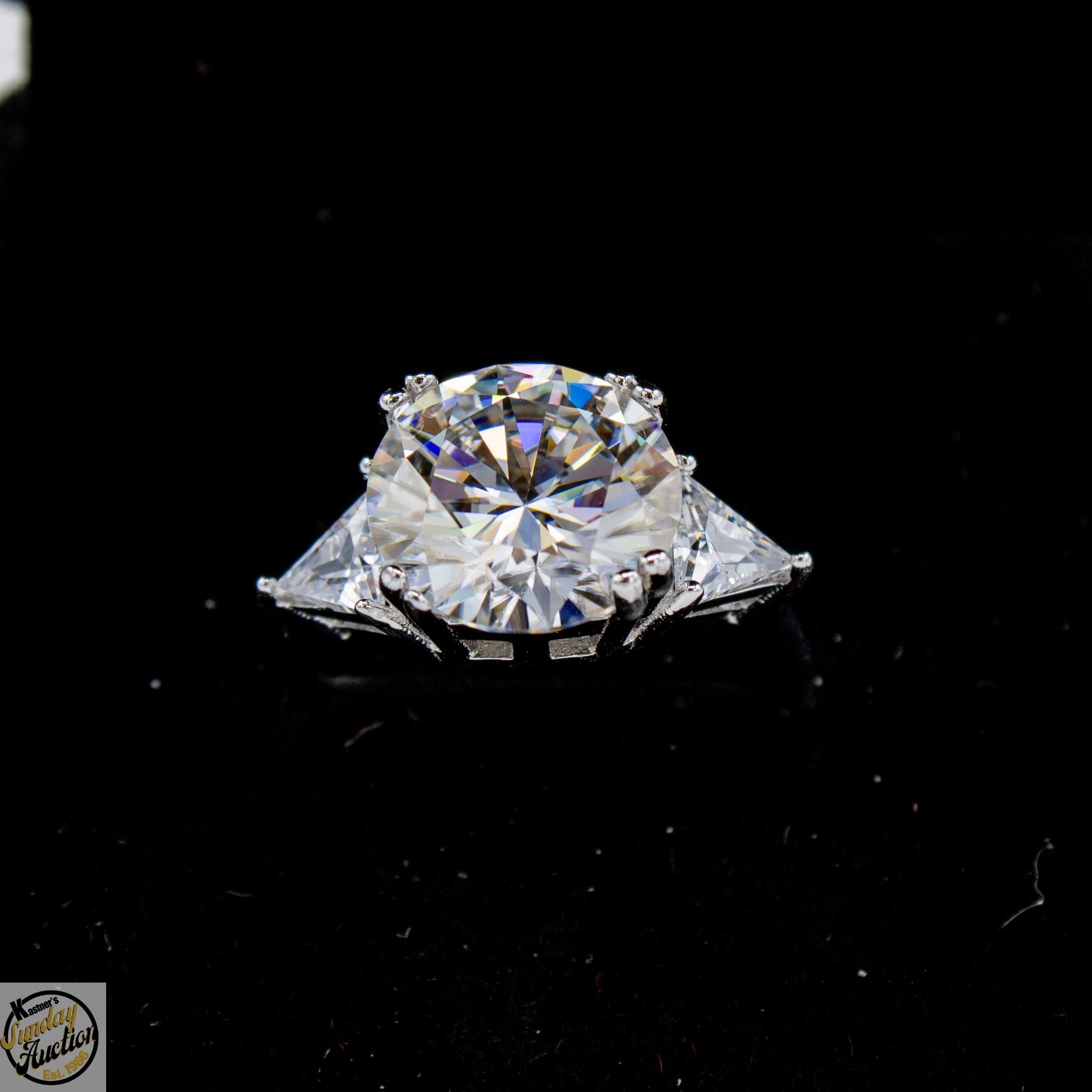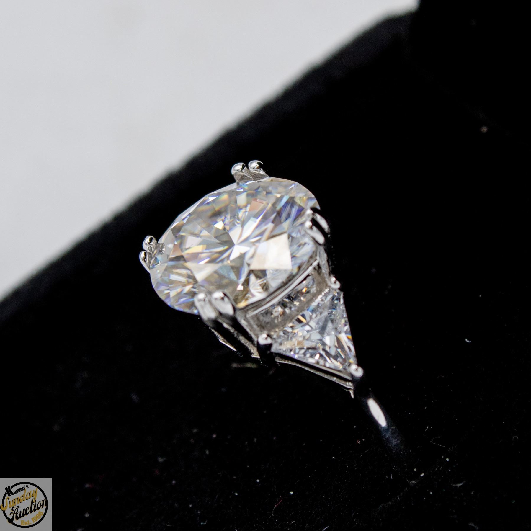 BRILLIANT CUT MOISSANITE STONE VVS D COLOR SET IN CENTER WITH TRIANGULAR BRILLIANT CUT CUBIC ZIRCONIA SET ON EITHER SIDE SET IN 925 SILVER RING SIZE 6 RETAIL VALUE $1,425.00 **ALL ITEMS MUST BE REMOVED BY 5PM SATURDAY, APRIL 18TH 2026. ALL REMAINING ITEMS WILL BE SUBJECT TO A $6.00 PER DAY STORAGE CHARGE. ANY ITEMS REMAINING AFTER MONDAY, MAY 4TH 2026 WILL BE CONSIDERED FORFEITED. NO REFUNDS WILL BE ISSUED FOR FORFEITED ITEMS. TO SCHEDULE A PICK UP APPOINTMENT CLICK HERE