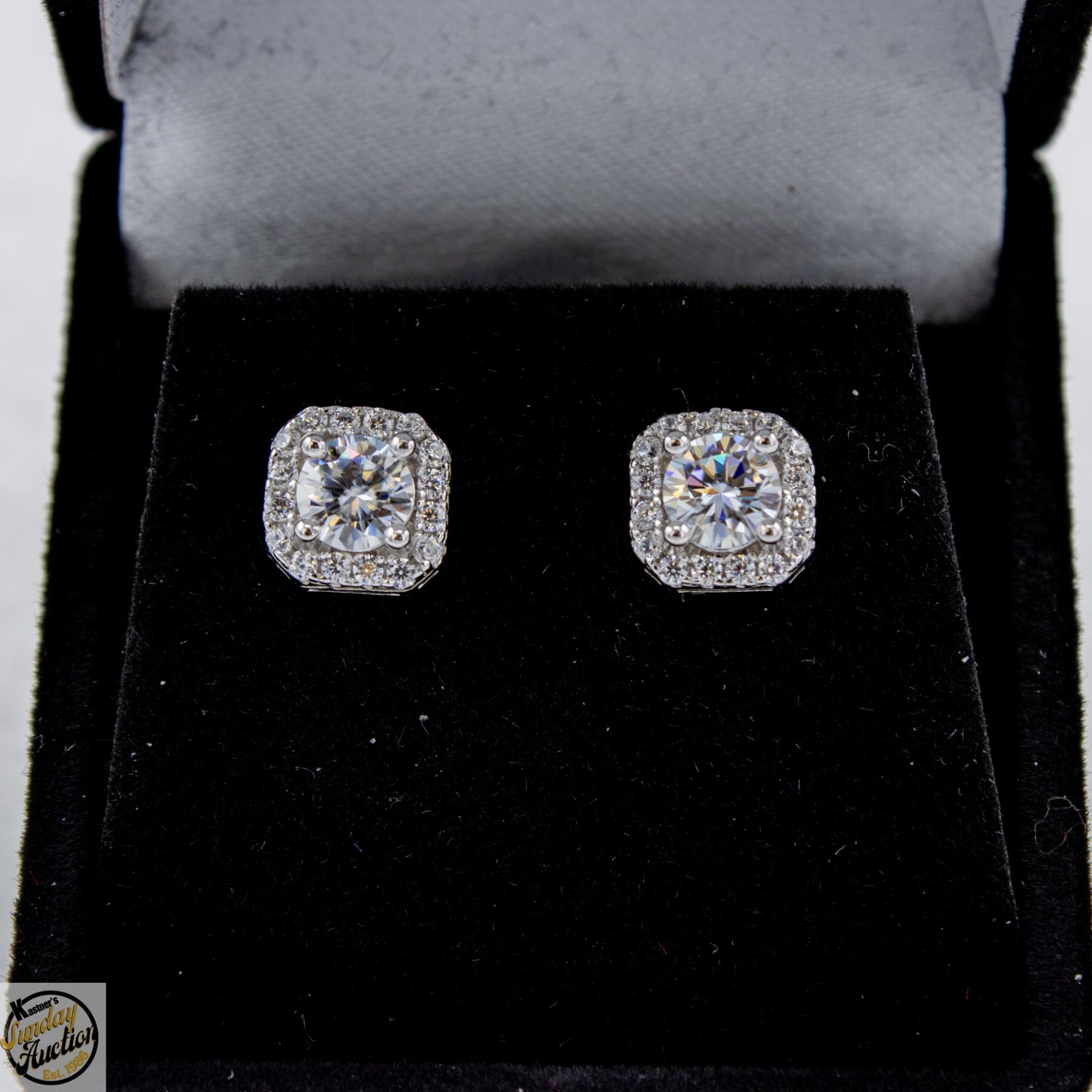 BRILLIANT CUT MOISSANITE STONE VVS D COLOR WITH 36 ROUND BRILLIANT CUT CUBIC ZIRCONIA SET IN SQUARE HALO SET IN 925 SILVER EARRINGS RETAIL VALUE $850.00 **ALL ITEMS MUST BE REMOVED BY 5PM SATURDAY, APRIL 18TH 2026. ALL REMAINING ITEMS WILL BE SUBJECT TO A $6.00 PER DAY STORAGE CHARGE. ANY ITEMS REMAINING AFTER MONDAY, MAY 4TH 2026 WILL BE CONSIDERED FORFEITED. NO REFUNDS WILL BE ISSUED FOR FORFEITED ITEMS. TO SCHEDULE A PICK UP APPOINTMENT CLICK HERE