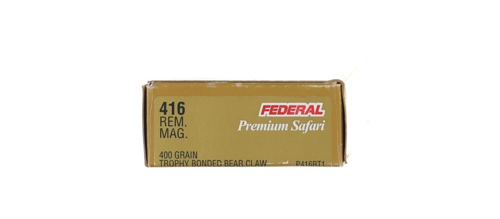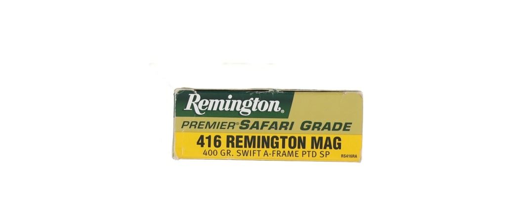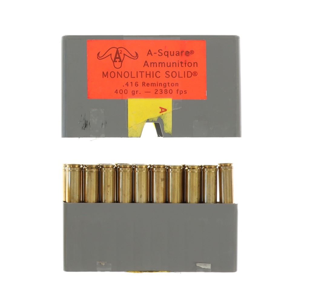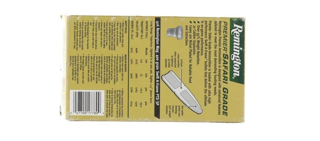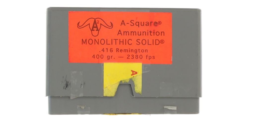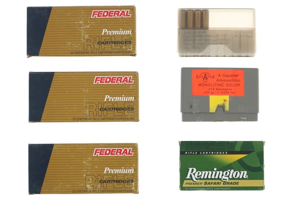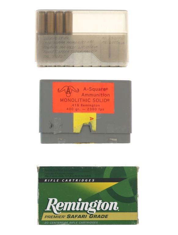 Featured in this lot is this .416 Rigby and Magnum ammunition. There is one box of A-Square .416 Remington monolithic solid ammunition. The next shows a little less than half a box of Norma Primer CCL-250 .416 Rigby rounds of ammunition. There are three full boxes of Federal Premium Safari .416 cartridges. The last is a full box of Remington premier Safari Grade .416 cartridges. The condition of this collection of ammunition and scope shows good condition of the ammunition the .416 CAL Rigby ammo is a little less than half full and one of the .416 CAL Monolithic Solid rounds is missing from the box, with the other three cases complete; the scope looks to be in good condition. The measurements of these ammunition boxes range from 3 3/4" x 6 1/8" x 1 3/8" to 8 3/8" x 3 3/4" x 1 1/2" and the scope measures 13 3/4" x 2 1/2" x 2 1/2". The collective weight of this collection is 12lb 2oz.