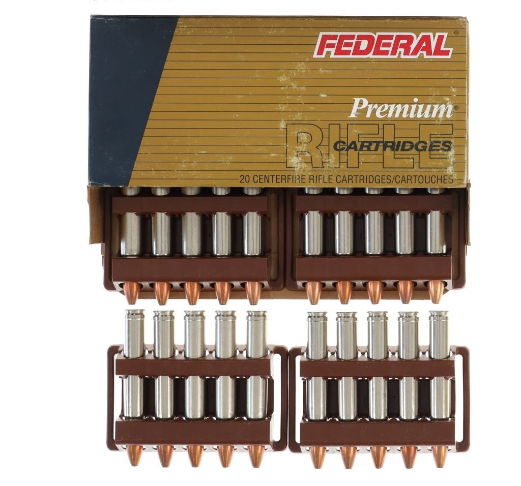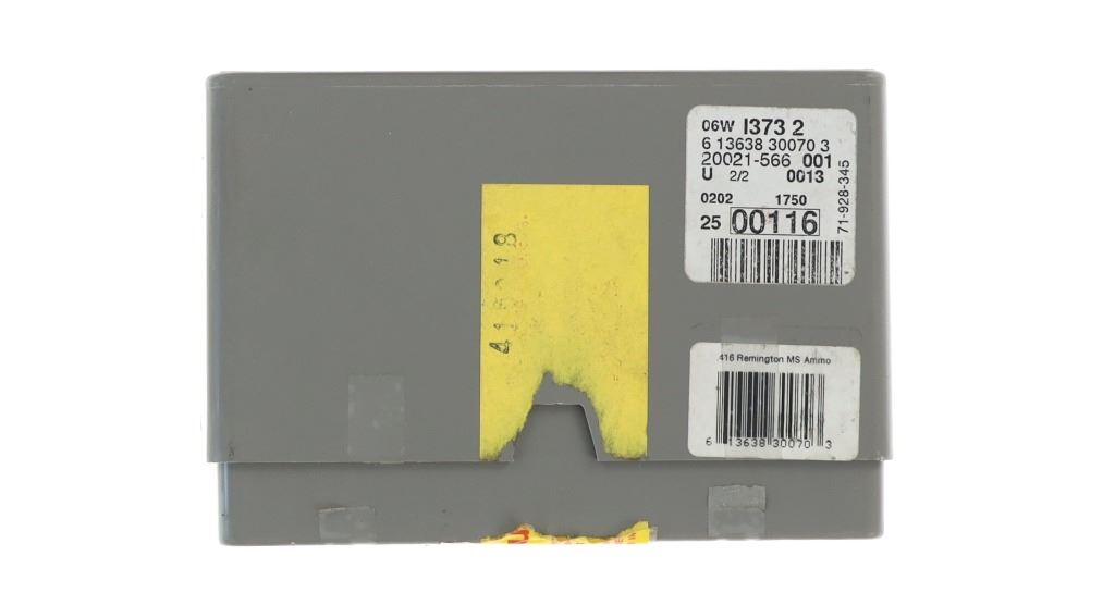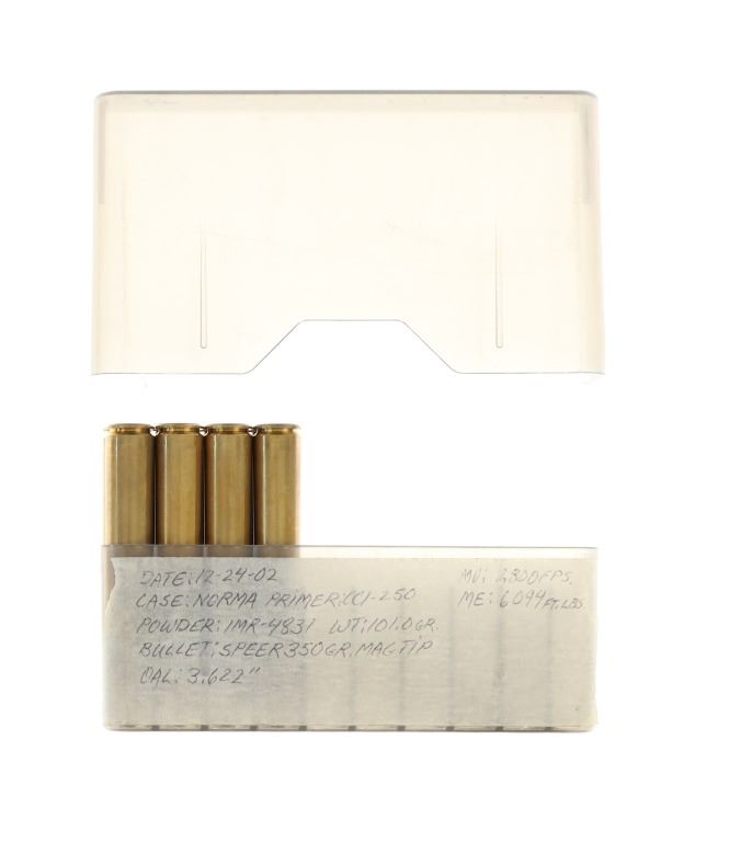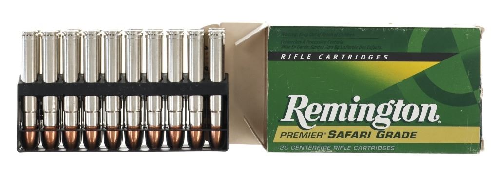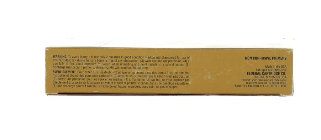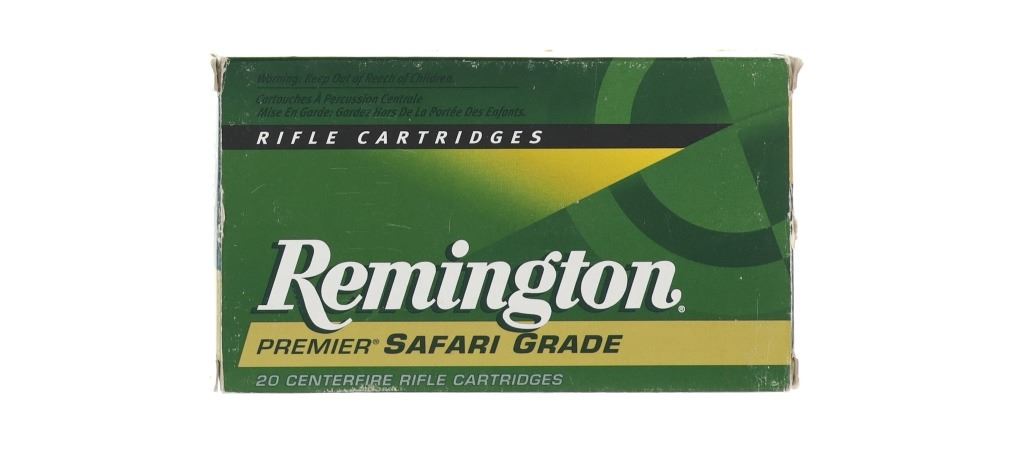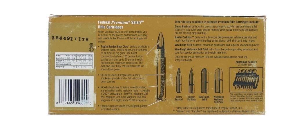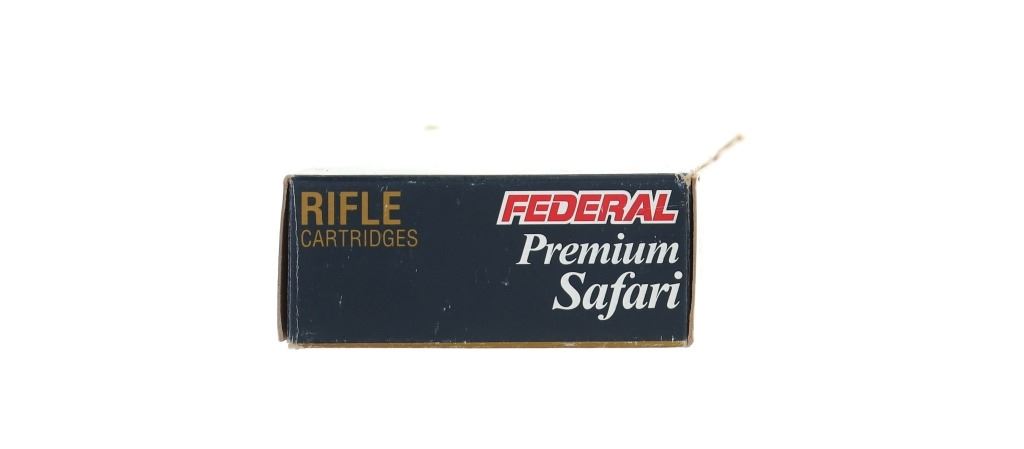 Featured in this lot is this .416 Rigby and Magnum ammunition. There is one box of A-Square .416 Remington monolithic solid ammunition. The next shows a little less than half a box of Norma Primer CCL-250 .416 Rigby rounds of ammunition. There are three full boxes of Federal Premium Safari .416 cartridges. The last is a full box of Remington premier Safari Grade .416 cartridges. The condition of this collection of ammunition and scope shows good condition of the ammunition the .416 CAL Rigby ammo is a little less than half full and one of the .416 CAL Monolithic Solid rounds is missing from the box, with the other three cases complete; the scope looks to be in good condition. The measurements of these ammunition boxes range from 3 3/4" x 6 1/8" x 1 3/8" to 8 3/8" x 3 3/4" x 1 1/2" and the scope measures 13 3/4" x 2 1/2" x 2 1/2". The collective weight of this collection is 12lb 2oz.