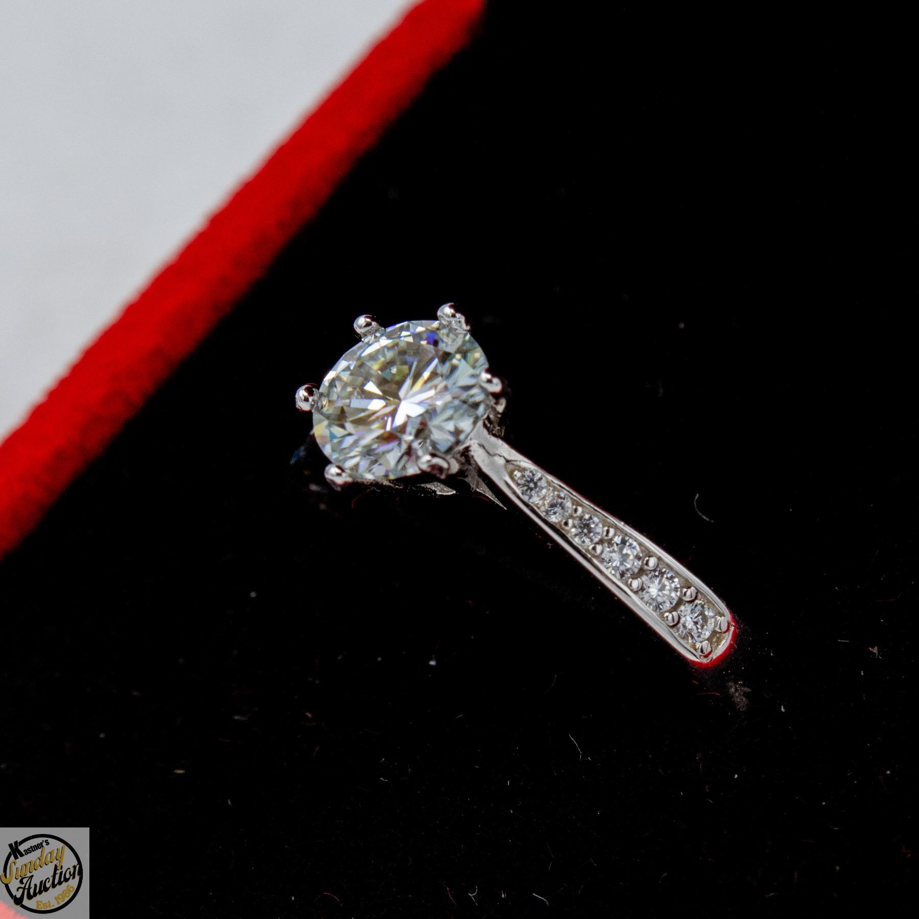 BRILLIANT CUT MOISSANITE STONE VVS D COLOR WITH 12 ROUND BRILLIANT CUT CUBIC ZIRCONIA STONES SET IN SHANKS SET IN 925 SILVER RING SIZE 8 **ALL ITEMS MUST BE REMOVED BY 5PM SATURDAY, APRIL 25TH 2026. ALL REMAINING ITEMS WILL BE SUBJECT TO A $6.00 PER DAY STORAGE CHARGE. ANY ITEMS REMAINING AFTER MONDAY, MAY 11TH 2026 WILL BE CONSIDERED FORFEITED. NO REFUNDS WILL BE ISSUED FOR FORFEITED ITEMS. TO SCHEDULE A PICK UP APPOINTMENT CLICK HERE