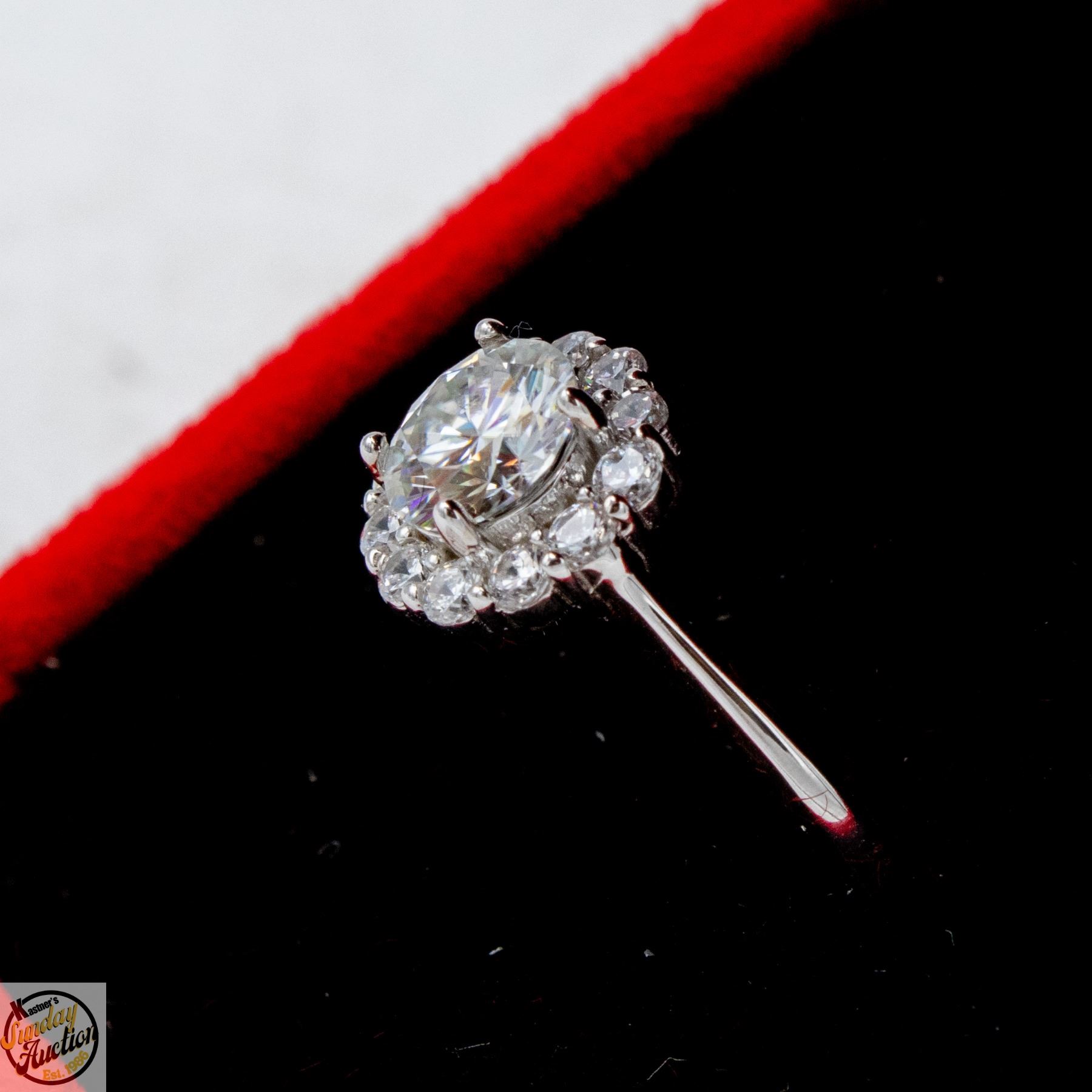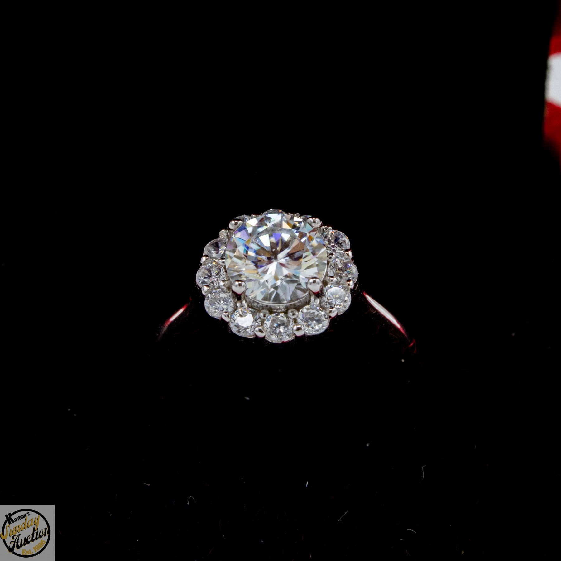 BRILLIANT CUT MOISSANITE STONE VVS D COLOR WITH 12 ROUND BRILLIANT CUT CUBIC ZIRCONIA STONES SET IN ROUND HALO SET IN 925 SILVER RING SIZE ADJUSTABLE **ALL ITEMS MUST BE REMOVED BY 5PM SATURDAY, APRIL 25TH 2026. ALL REMAINING ITEMS WILL BE SUBJECT TO A $6.00 PER DAY STORAGE CHARGE. ANY ITEMS REMAINING AFTER MONDAY, MAY 11TH 2026 WILL BE CONSIDERED FORFEITED. NO REFUNDS WILL BE ISSUED FOR FORFEITED ITEMS. TO SCHEDULE A PICK UP APPOINTMENT CLICK HERE