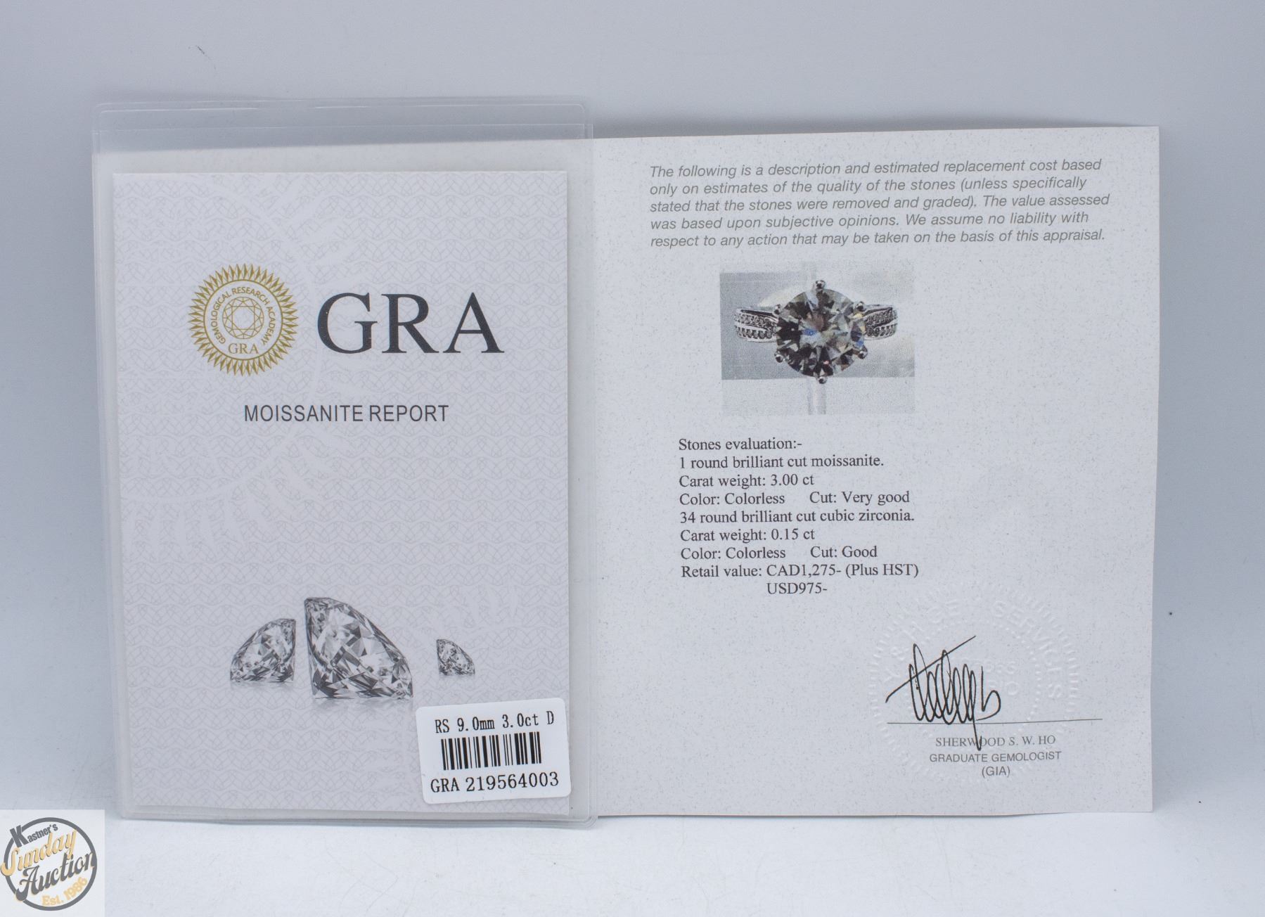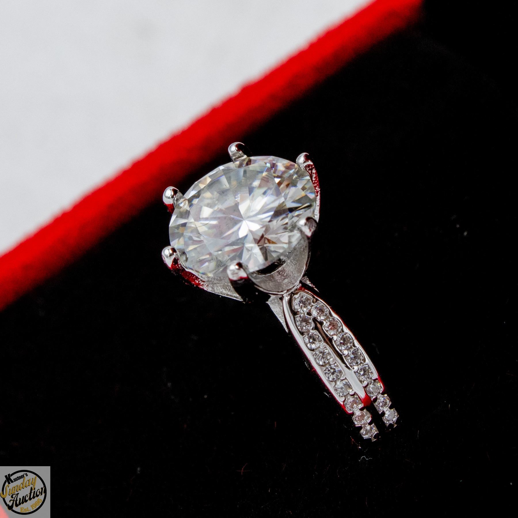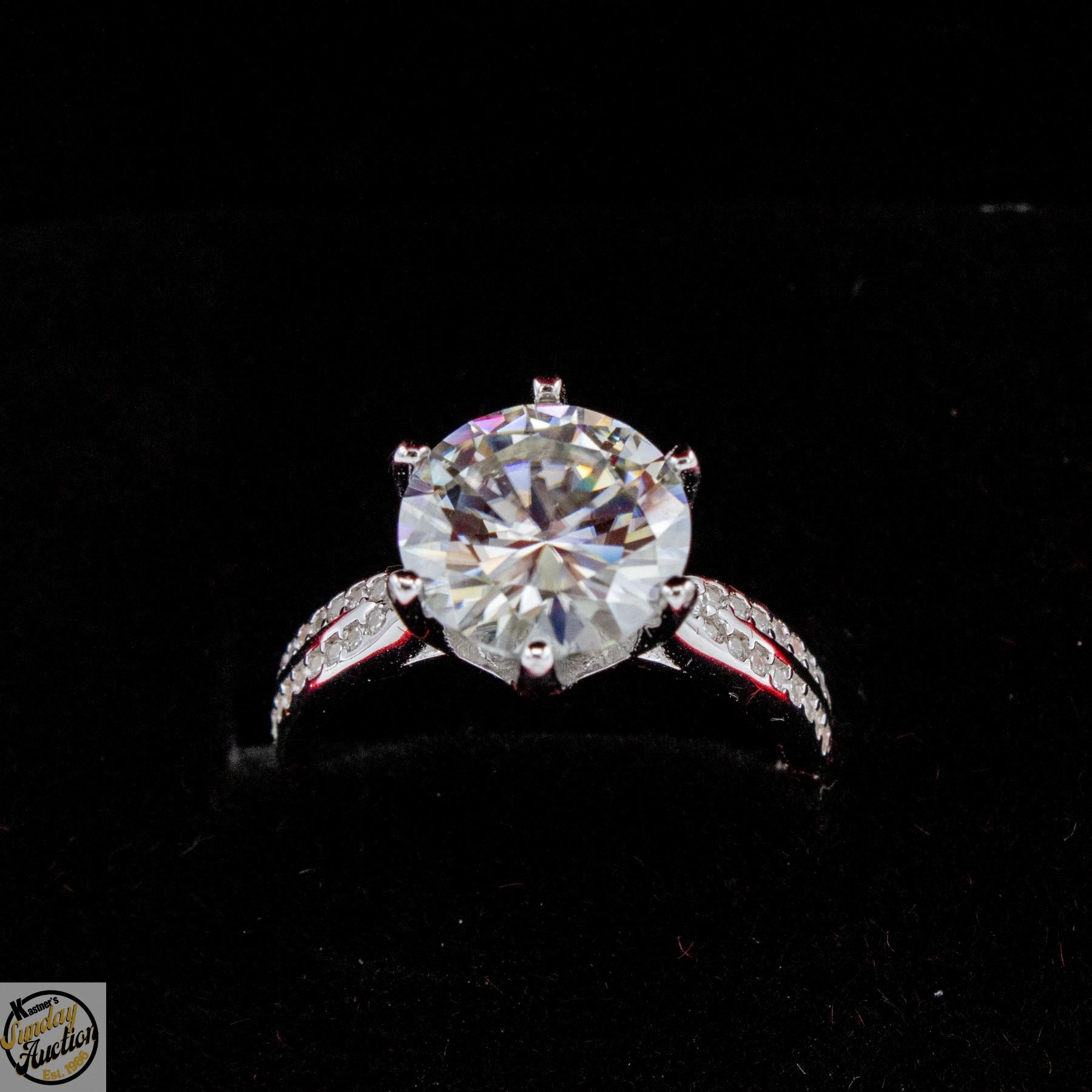 BRILLIANT CUT MOISSANITE STONE VVS D COLOR WITH 34 ROUND BRILLIANT CUT CUBIC ZIRCONIA SET IN DUAL ROWS IN SHANKS SET IN 925 SILVER RING SIZE 5 RETAIL VALUE $1,275.00 **ALL ITEMS MUST BE REMOVED BY 5PM SATURDAY, APRIL 25TH 2026. ALL REMAINING ITEMS WILL BE SUBJECT TO A $6.00 PER DAY STORAGE CHARGE. ANY ITEMS REMAINING AFTER MONDAY, MAY 11TH 2026 WILL BE CONSIDERED FORFEITED. NO REFUNDS WILL BE ISSUED FOR FORFEITED ITEMS. TO SCHEDULE A PICK UP APPOINTMENT CLICK HERE