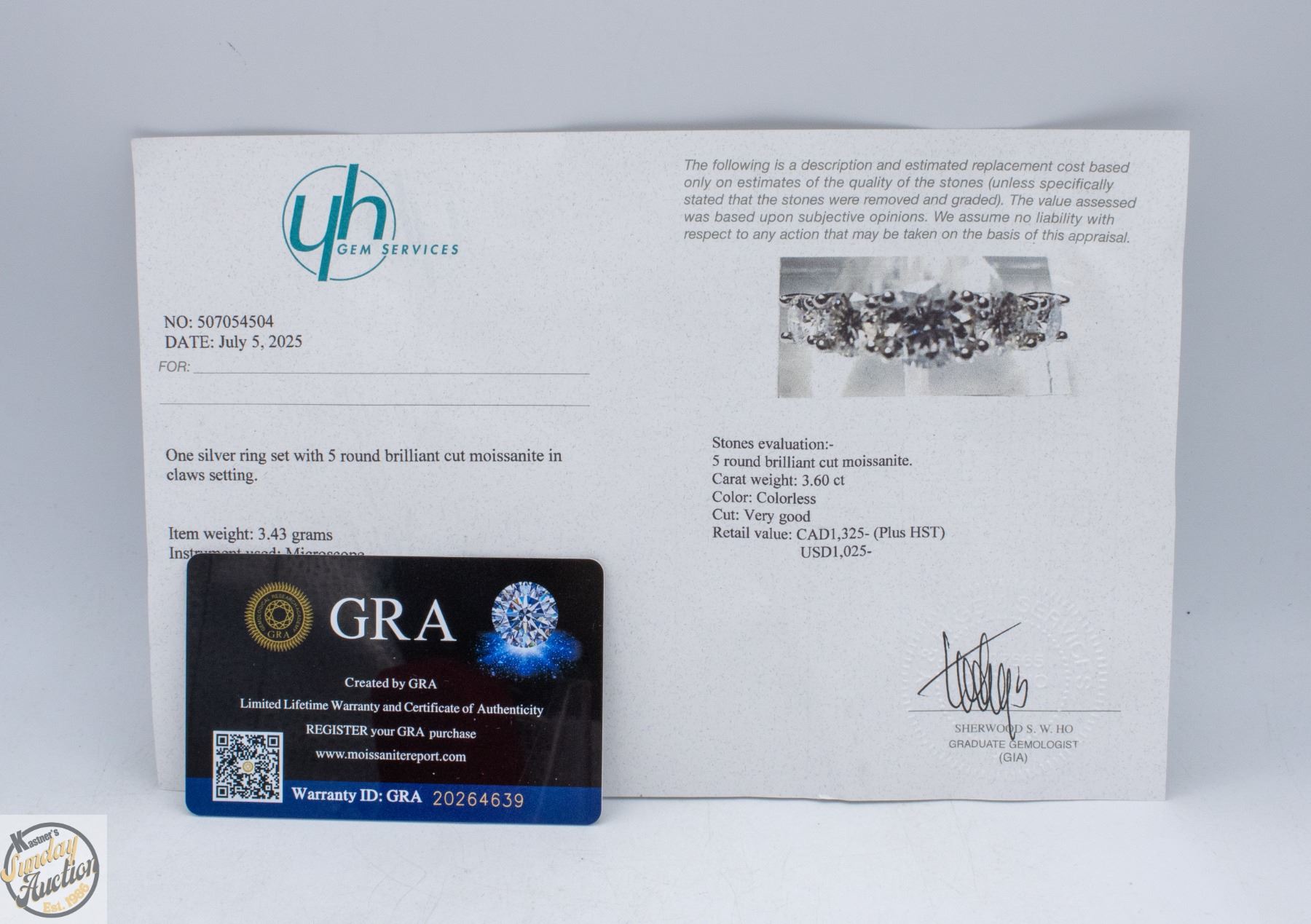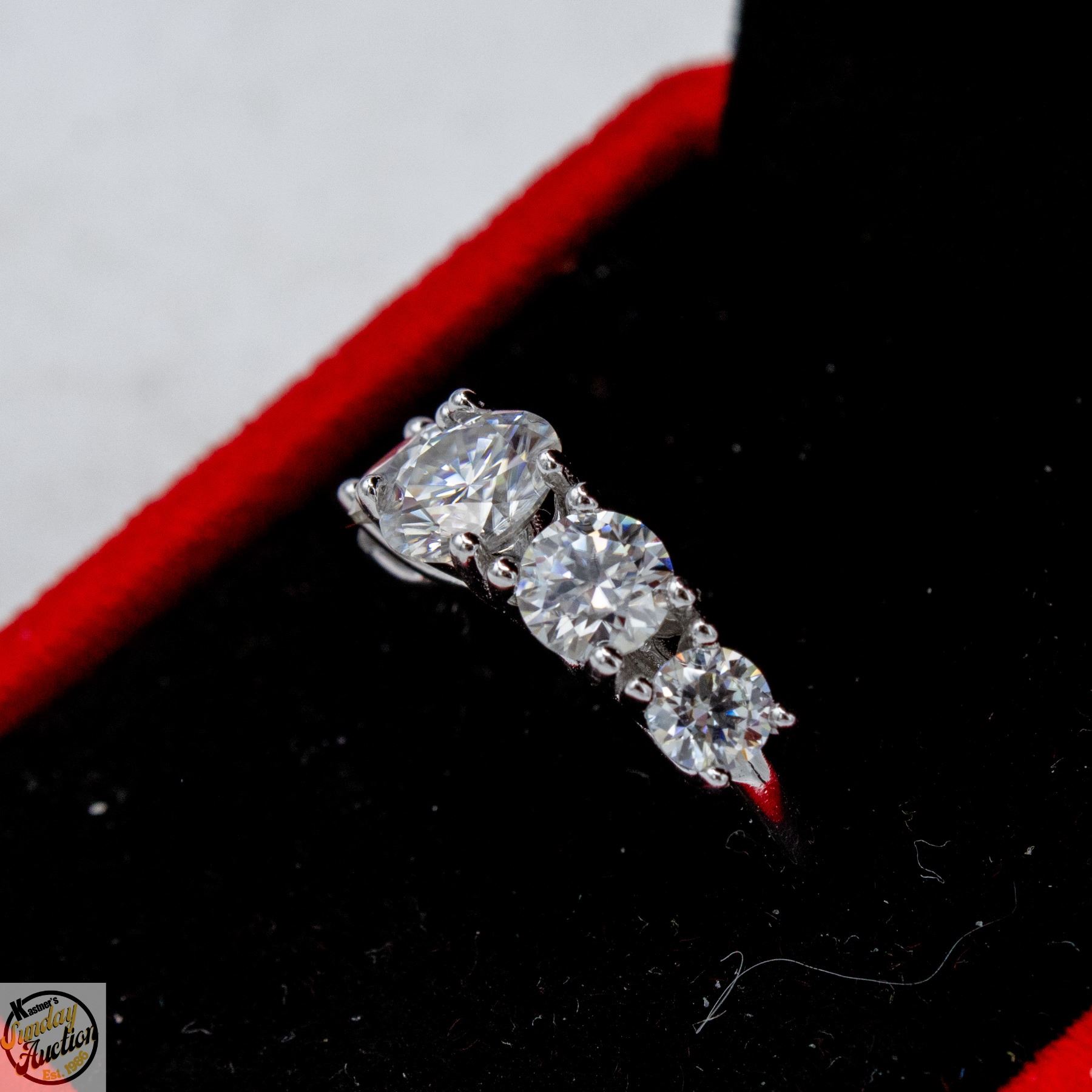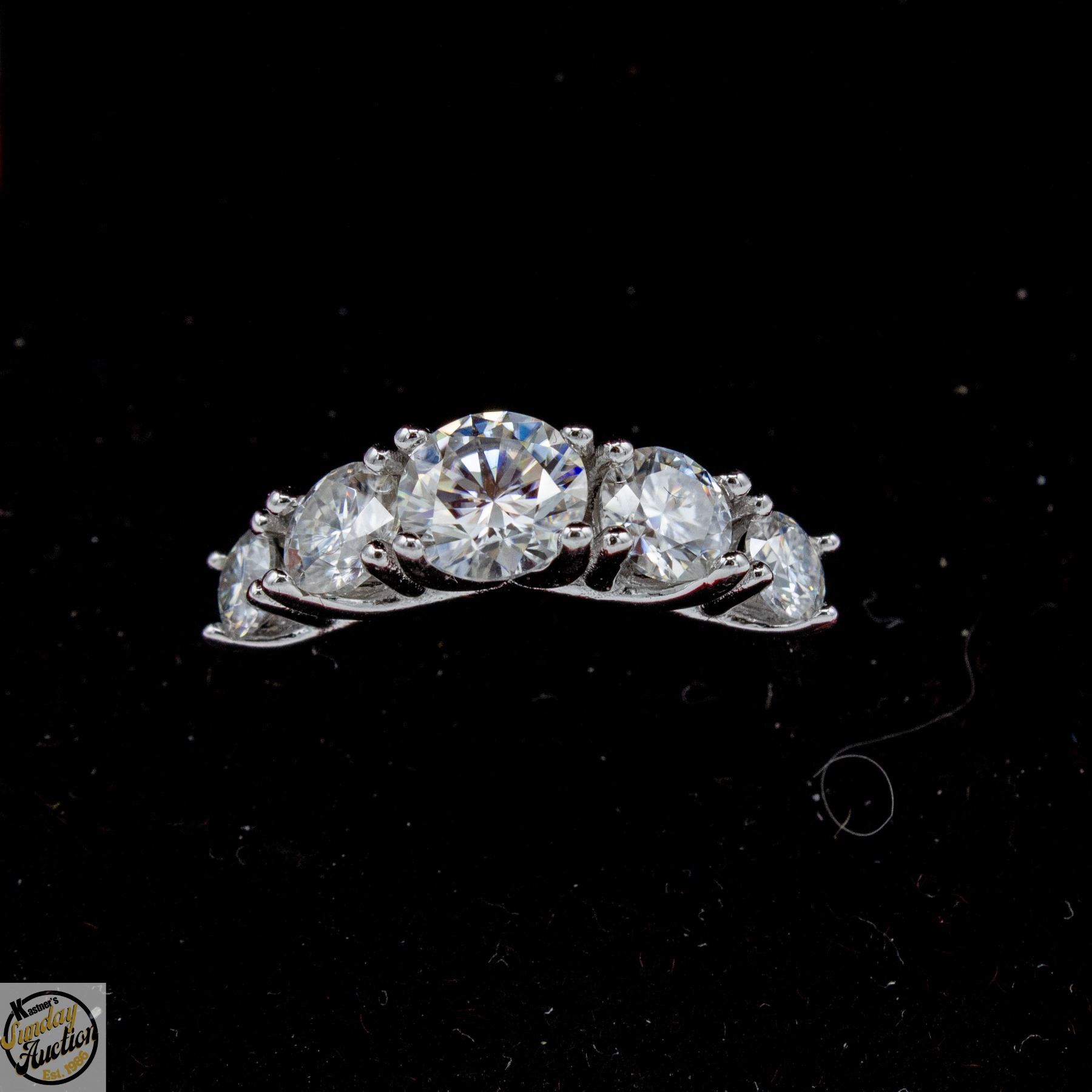 BRILLIANT CUT MOISSANITE STONE VVS D COLOR WITH THE 5 MOISSANITE STONES SET GRADUATING DOWN IN SIZE FROM CENTER SET IN 925 SILVER RING SIZE 6 RETAIL VALUE $1,325.00 **ALL ITEMS MUST BE REMOVED BY 5PM SATURDAY, APRIL 25TH 2026. ALL REMAINING ITEMS WILL BE SUBJECT TO A $6.00 PER DAY STORAGE CHARGE. ANY ITEMS REMAINING AFTER MONDAY, MAY 11TH 2026 WILL BE CONSIDERED FORFEITED. NO REFUNDS WILL BE ISSUED FOR FORFEITED ITEMS. TO SCHEDULE A PICK UP APPOINTMENT CLICK HERE