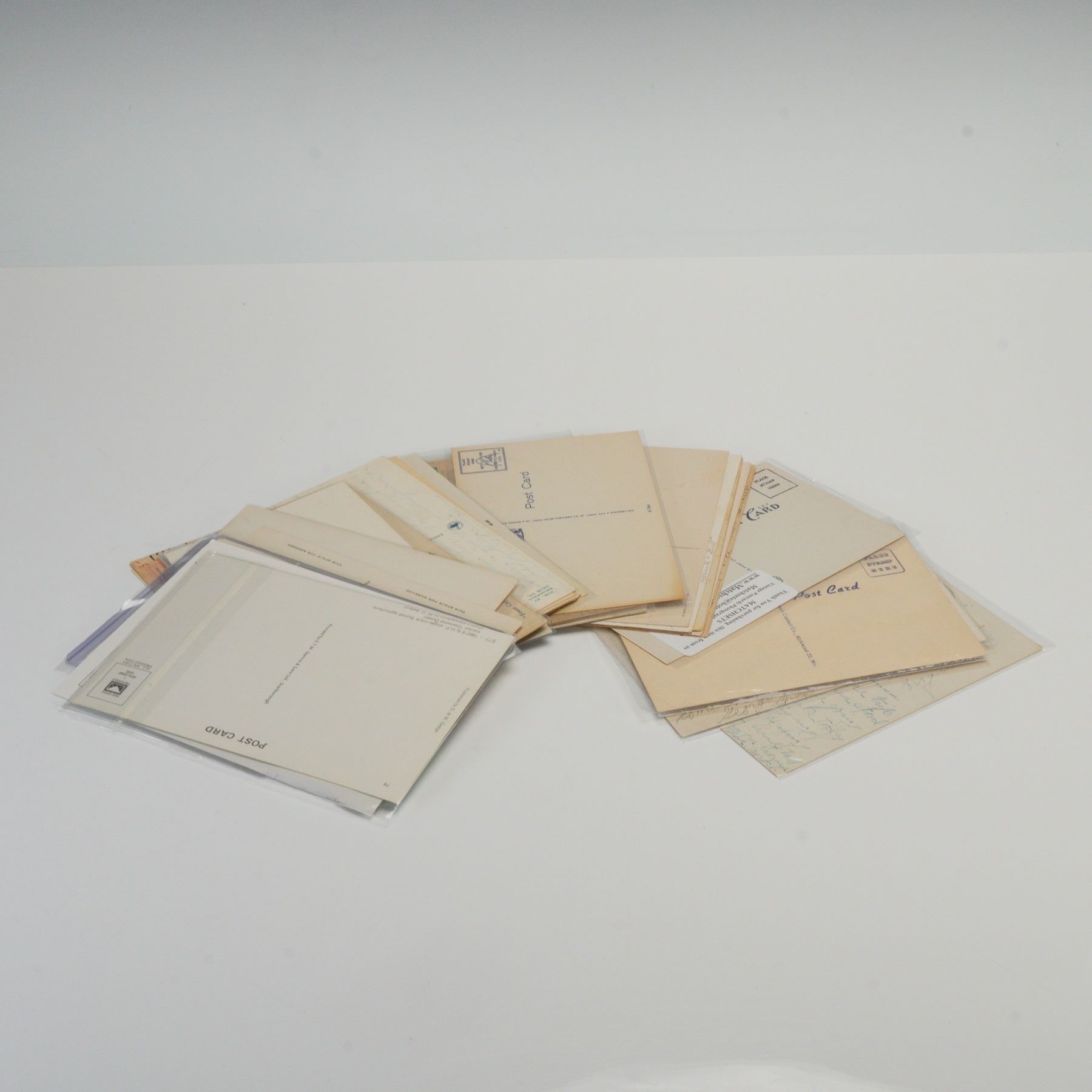 A diverse array of printed and photographic imagery including architectural landmarks, scenic vistas, and notable public buildings from various U.S. states such as Missouri, Florida, South Carolina, New Mexico, and more. Included black and white and color tint illustrations. Some cards bear a handwritten correspondence and postal markings.