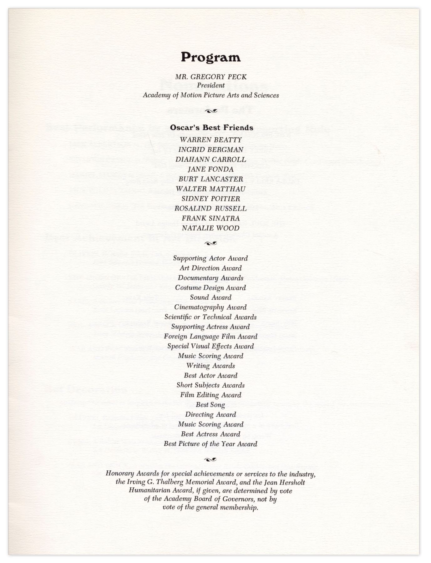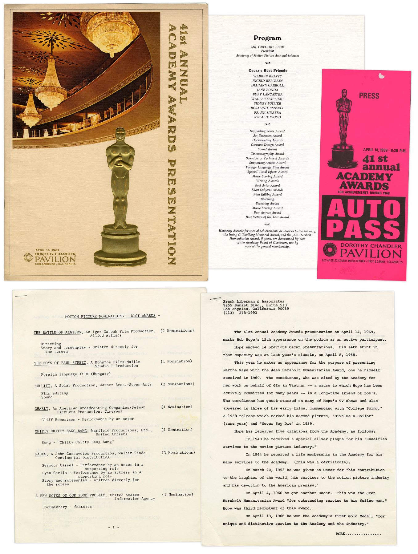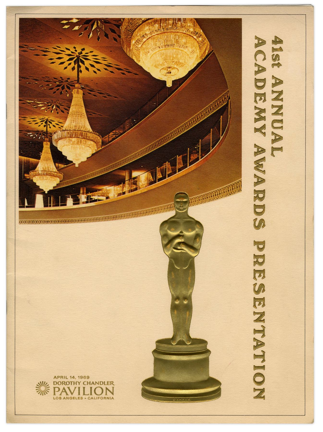 Program for the 41st Academy Awards held on 14 April 1969 at the Dorothy Chandler Music Center Pavilion. 16 page program lists nominations, staff and sponsors, with the iconic Oscar statue in raised gold on cover. ''Oliver!'' took home 6 awards, including Best Picture and Best Director. Comes with parking pass, printed list of nominations and 2 page write-up on Bob Hope. Program cover measures 9'' x 12'' and pages measure 8.5'' x 11''. Minor creasing to right edges, in overall near fine condition.