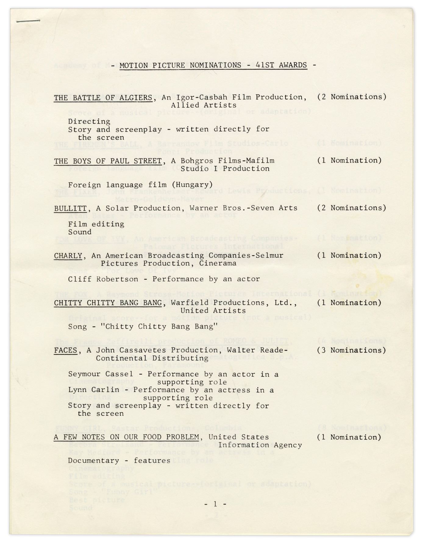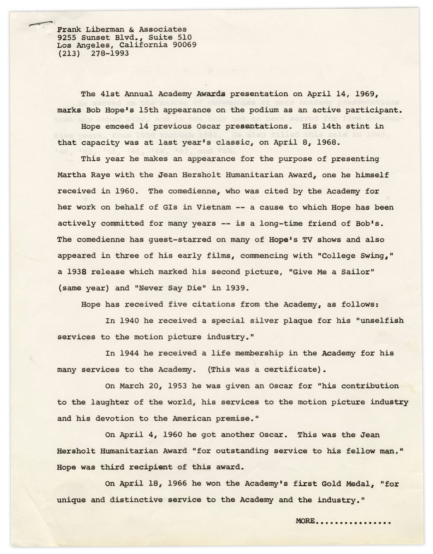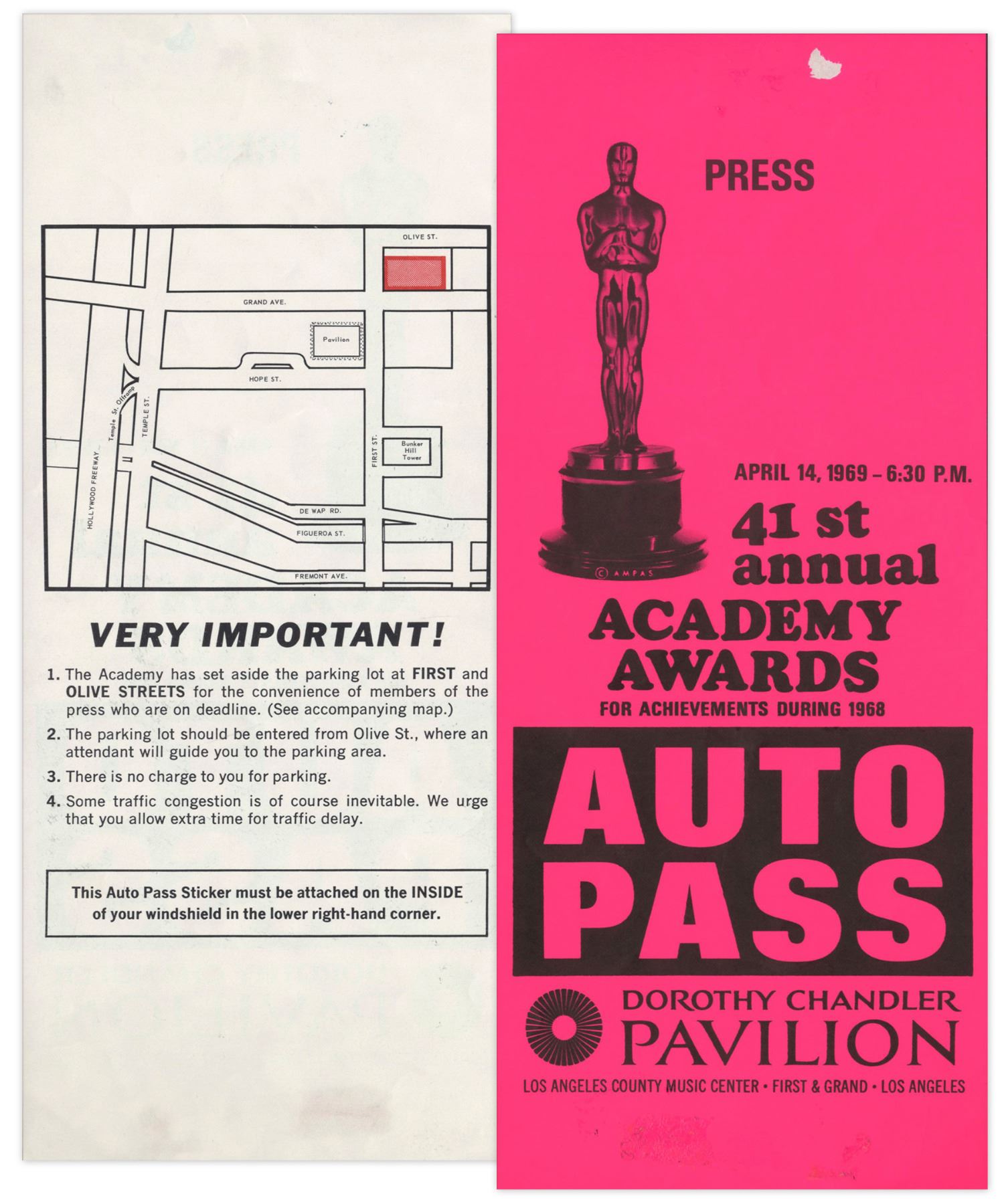 Program for the 41st Academy Awards held on 14 April 1969 at the Dorothy Chandler Music Center Pavilion. 16 page program lists nominations, staff and sponsors, with the iconic Oscar statue in raised gold on cover. ''Oliver!'' took home 6 awards, including Best Picture and Best Director. Comes with parking pass, printed list of nominations and 2 page write-up on Bob Hope. Program cover measures 9'' x 12'' and pages measure 8.5'' x 11''. Minor creasing to right edges, in overall near fine condition.