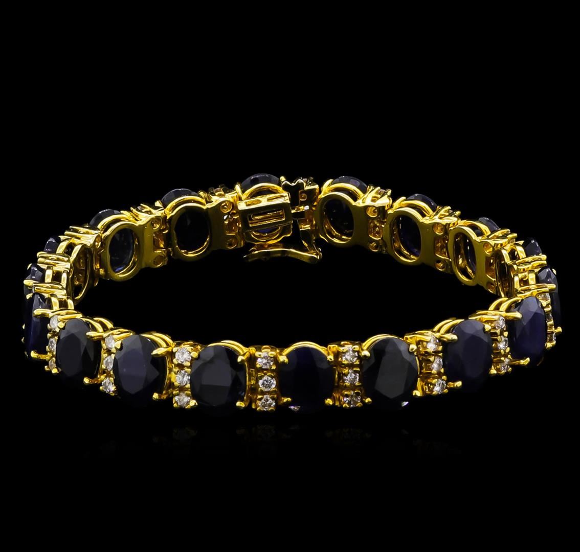 One electronically tested 14KT yellow gold ladies cast & assembled sapphire and diamond bracelet with a bright polish finish. Condition is good. Seven and one-quarter inch length bracelet features a flexible sapphire and diamond ribbon, terminating in a concealed clasp with safety. Identified with markings of "14K". Containing: Eighteen prong set oval mixed cut natural blue sapphires, measuring 9.00 x 7.00 x 4.40mm, approximate total weight of 42.04ct., clarity is heavily included, type II, dark, very slightly grayish, blue color, (GIA B 7/3), cut is good. Transmitting light somewhat diffusely, transparent to translucent. Naturally occurring internal & external characteristics are present. Measurements & the color grade are an average for the group. Graded in the setting. Fifty-four prong set round brilliant cut diamonds, measuring 2.10 - 2.00 x 1.23mm (depth est.) approximate total weight of 54 Stones = 1.80ct. Graded in the setting. Clarity: I-1 to I-2. Color: F - H. Total Weight of Colored Stones 42.04ct. Total Weight of Diamonds 1.80ct. Total Weight of Bracelet 32.38 grams. AIG Appraised at $23,435.00.