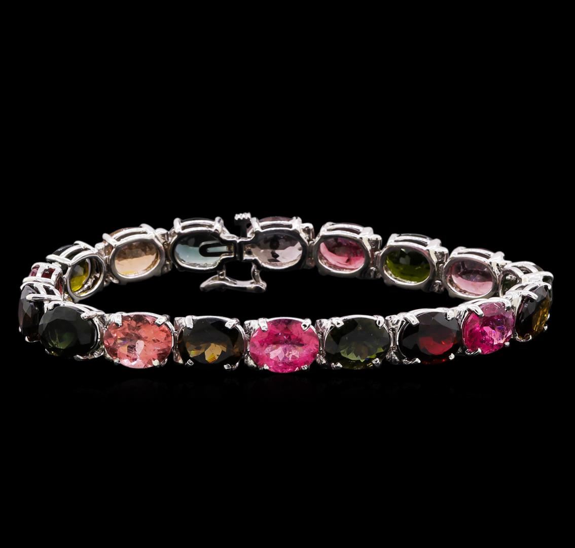 One electronically tested 14KT white gold lady's combination cast & assembled fashion straight line bracelet with a tongue clasp with foldover safety with a bright polish finish. The featured lady's fashion bracelet measures 7.5 inches in length. Identified with markings of "14K". Condition is new, good workmanship. Containing: Sixteen prong set oval modified brilliant cut natural multi-color tourmalines, measuring 9.90 x 8.00 x 4.80mm, (depth est.) approximate total weight of 42.06ct., clarity is eye clean, cut is very good. The featured lady's bracelet has tourmaline ranging in color from green to orange to pink to brown. Transmitting light with a minimum of distortion, transparent. Colored gemstones are presumed to have been subjected to commonly used enhancement processes. Graded in the setting. Total Weight of Colored Stones 42.06ct. Total Weight of Bracelet 25.80gm. GAS Appraised at $4,725.00.