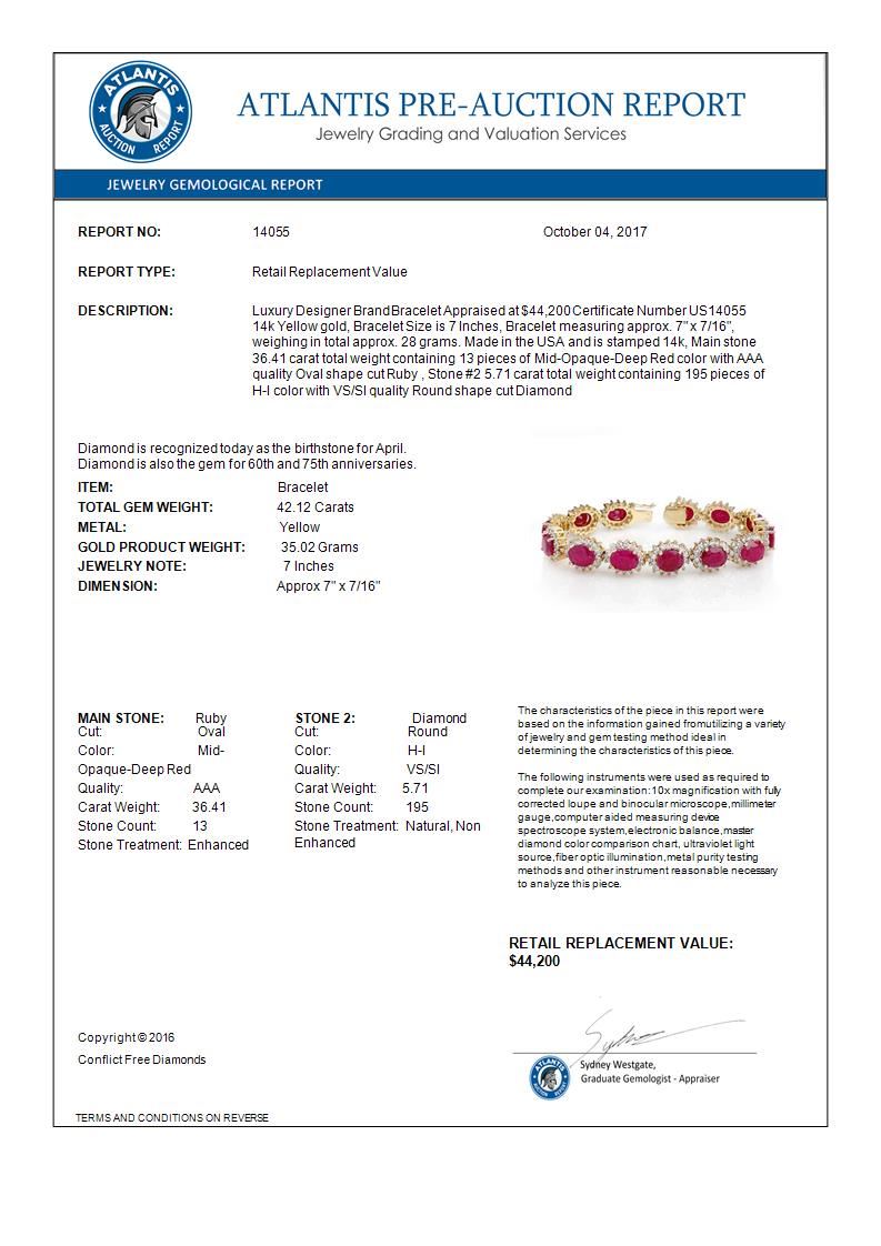 14055 - REF-618K2W ---- 42.12 CTW Ruby & Diamond Bracelet 14K Yellow Gold ---- Luxury Designer Brand Bracelet Appraised at $44,200 Certificate Number US14055 14k Yellow gold, Bracelet Size is 7 Inches, Bracelet measuring approx. 7" x 7/16", weighing in total approx. 28 grams. Made in the USA and is stamped 14k, Main stone 36.41 carat total weight containing 13 pieces of Mid-Opaque-Deep Red color with AAA quality Oval shape cut Ruby , Stone #2 5.71 carat total weight containing 195 pieces of H-I color with VS/SI quality Round shape cut Diamond