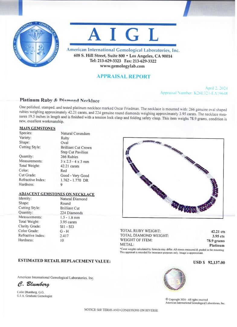 One polished. stamped. and tested platinum necklace marked Oscar Friedman. The necklace is mounted with: 266 genuine oval shaped rubies weighing approximately 42.21 carats, and 224 genuine round diamonds weighing approximately 3.95 carats. The necklace measures 19.5 inches in length and is finished with a tension lock clasp and folding safety clasp. This item weighs 78.9 grams. condition is new. excellent workmanship. #MAIN GEMSTONES# Species: Natural Corundum Variety: Ruby Shape: Oval Cutting Style: Brilliant Cut Crown, Step Cut Pavilion Quantity: 266 Rubies Measurements: 3 x 2.5 - 4 x 3mm Total Weight: 42.21 carats Color: Red Cut Grade: Good - Very Good Refractive Index: 1.762 - 1.770 DR Hardness: 9 #ADJACENT GEMSTONES ON NECKLACE# Identity: Natural Diamond Shape: Round Cutting Style: Brilliant Cut Quantity: 224 Diamonds Measurements: 1.5 - 1.8mm Total Weight: 3.95 carats Clarity Grade: SI1-SI3 Color Grade: G-H Refractive Index: 2.417 Hardness: 10 TOTAL RUBY WEIGHT: 42.21 cts TOTAL DIAMOND WEIGHT: 3.95 cts WEIGHT OF ITEM: 78.9 grams METAL: Platinum Size: 19 1/2