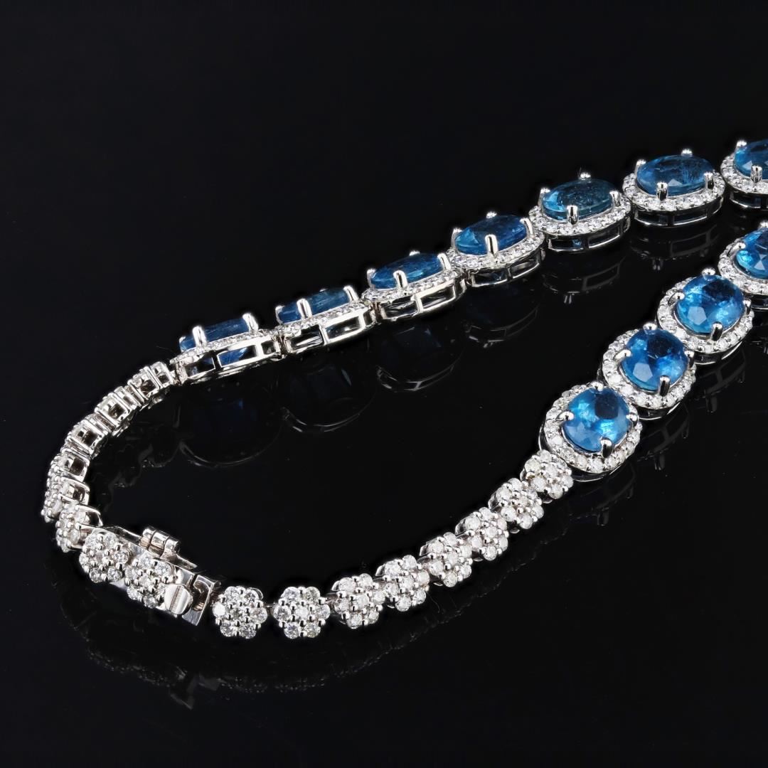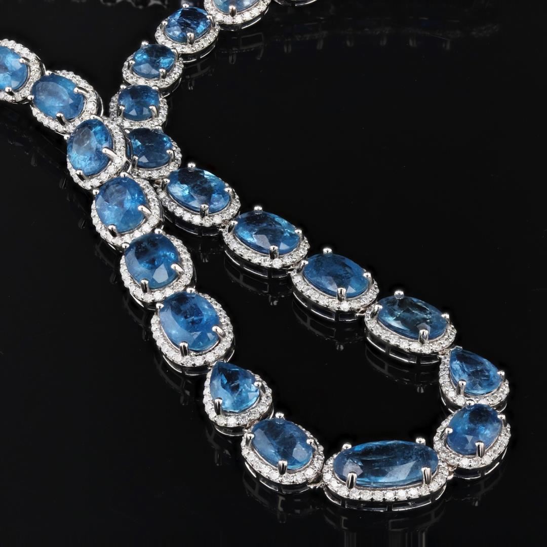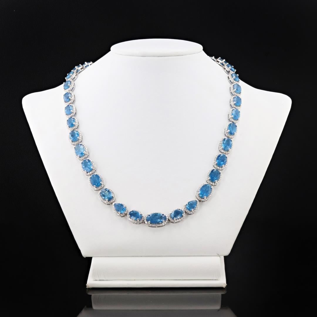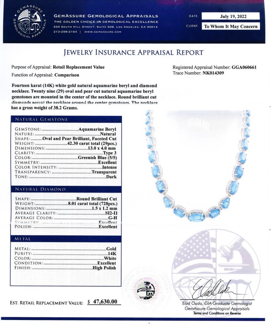 Fourteen karat (14K) white gold natural aquamarine beryl and diamond necklace. Twenty nine (29) oval and pear cut natural aquamarine beryl gemstones are mounted in the center of the necklace. Round brilliant cut diamond accent the necklace around the center gemstones. The necklace has a gross weight of 38.2 Grams. NATURAL GEMSTONE: GEMSTONE: Aquamarine Beryl NATURE: Natural SHAPE: Oval and Pear Brilliant, Faceted Cut WEIGHT: 42.30 carat total (29pcs.) DIMENSIONS: 13.0 x 4.0mm CLARITY: Type 3 COLOR: Greenish Blue (5/5) SYMMETRY: Excellent COLOR INTENSITY: Intense TRANSPARENCY: Transparent TONE: Dark NATURAL DIAMOND SHAPE: .Round Brilliant Cut WEIGHT: .8.01 carat total (728pcs.) DIMENSIONS: 1.5 x 1.2mm AVERAGE CLARITY: SI2 to I1 AVERAGE COLOR: G - H SYMMETRY: Excellent POLISH: Excellent METAL : Gold PURITY: .14K COLOR: White CONDITION: Excellent FINISH: High Polish #LREF-19115