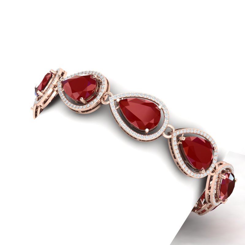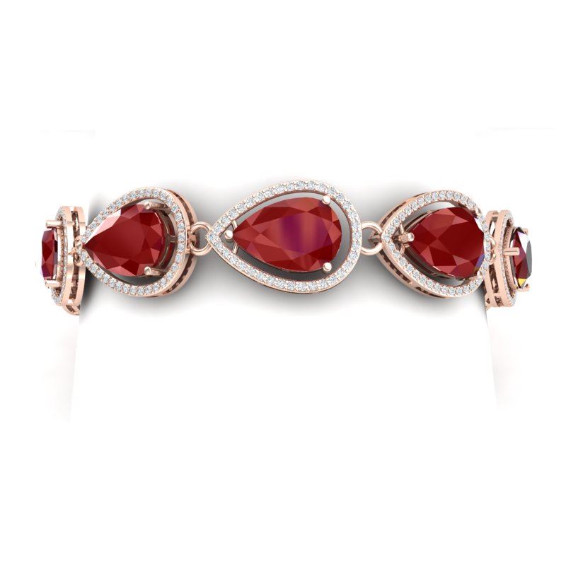 42.47 CTW Royalty Ruby & VS Diamond Bracelet 18K Rose Gold ---- Luxury Designer Brand Bracelet Appraised Retail Price at $50,400 ---- SKU Number US39559 18K Rose gold Bracelet Size is 7 Inches, Can custom fit length, Bracelet measuring approx. 1/2 x 7 Inches, weighing in total approx. 24 grams. Made in the USA and is stamped 18K, Main stone 39.59 carat total weight containing 10 pieces of Intense Mid-Opaque Red color with AAA quality Pear shape cut Ruby , Stone #2 2.88 carat total weight containing 360 pieces of G-H color with VS/SI quality Round shape cut