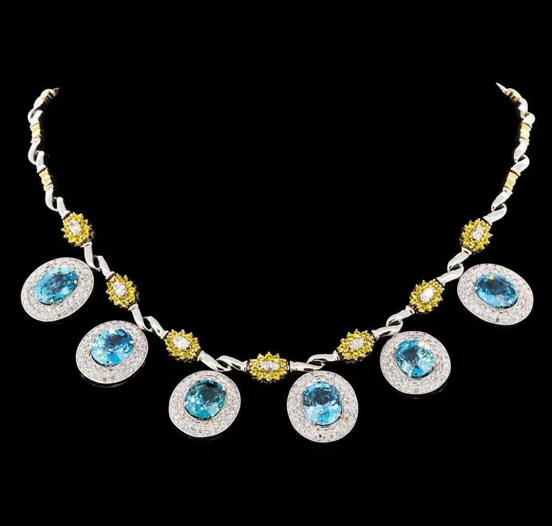 One electronically tested 14-18KT white and yellow gold lady's combination cast & assembled fashion necklace with a tongue clasp with foldover safety with a bright polish finish. The featured lady's necklace is cast from 14KT white and yellow gold and measures approximately seventeen inches in length. The necklace contains seven yellow sapphire and diamond starburst motifs and six blue zircons set in dangling drop double halo motifs. The dangling double halo motifs are cast from 18KT white gold. Condition is new, good workmanship. Containing: Six prong set oval modified mixed cut natural blue zircons, measuring 11.70 x 9.30 x 6.30mm, (depth est.) approximate total weight of 41.88ct., clarity is eye clean, medium, moderately strong, very strongly greenish blue color, (GIA vstgB 5/4), cut is very good. Transmitting light with no distortion, transparent. Colored gemstones are presumed to have been subjected to commonly used enhancement processes. Graded in the setting. Seventy prong set round modified brilliant cut natural yellow sapphires, measuring 1.80 - 1.40 x 1.04 mm, (depth est.) approximate total weight of 2.10ct., clarity is slightly included, medium, moderately strong, yellow color, (GIA Y 5/4), cut is good. Transmitting light with a minimum of distortion, transparent. Colored gemstones are presumed to have been subjected to commonly used enhancement processes. Graded in the setting. Seven prong set marquise shaped cut diamonds, measuring 4.70 x 2.80 x 1.76mm (depth est.) approximate total weight of 7 Stones = 0.94ct. Graded in the setting. Color G - H Clarity SI-1 to SI-2 Cut Good Two Hundred Forty bead set round brilliant cut diamonds, measuring 1.70 - 1.60 x 1.02mm (depth est.) approximate total weight of 240 Stones = 4.05ct. Graded in the setting. Color G - I Clarity VS-2 to SI-2 Cut Good. Total Weight of Colored Stones 43.98ct.. Total Weight of Diamonds 4.99ct.. Total Weight of Necklace 66.30gm GAS Appraised at $35,905.00.