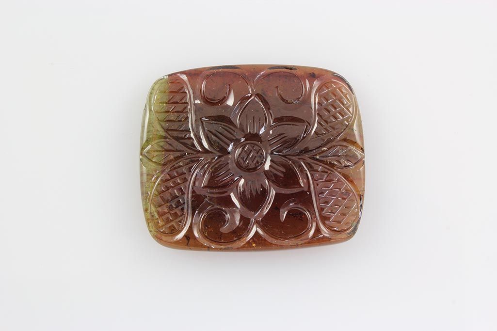 42.84ctw Multi-ColorTourmaline w/ FlowerCarvedDesign **|**|** 31.24x26.18x4.29mm Hand Carving Flower Design in Natural Multi-Color Tourmaline Rectangular Shape ; MSRP: $100