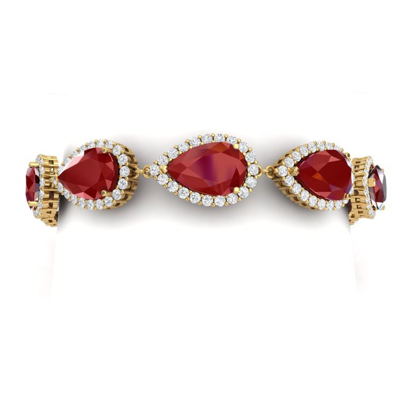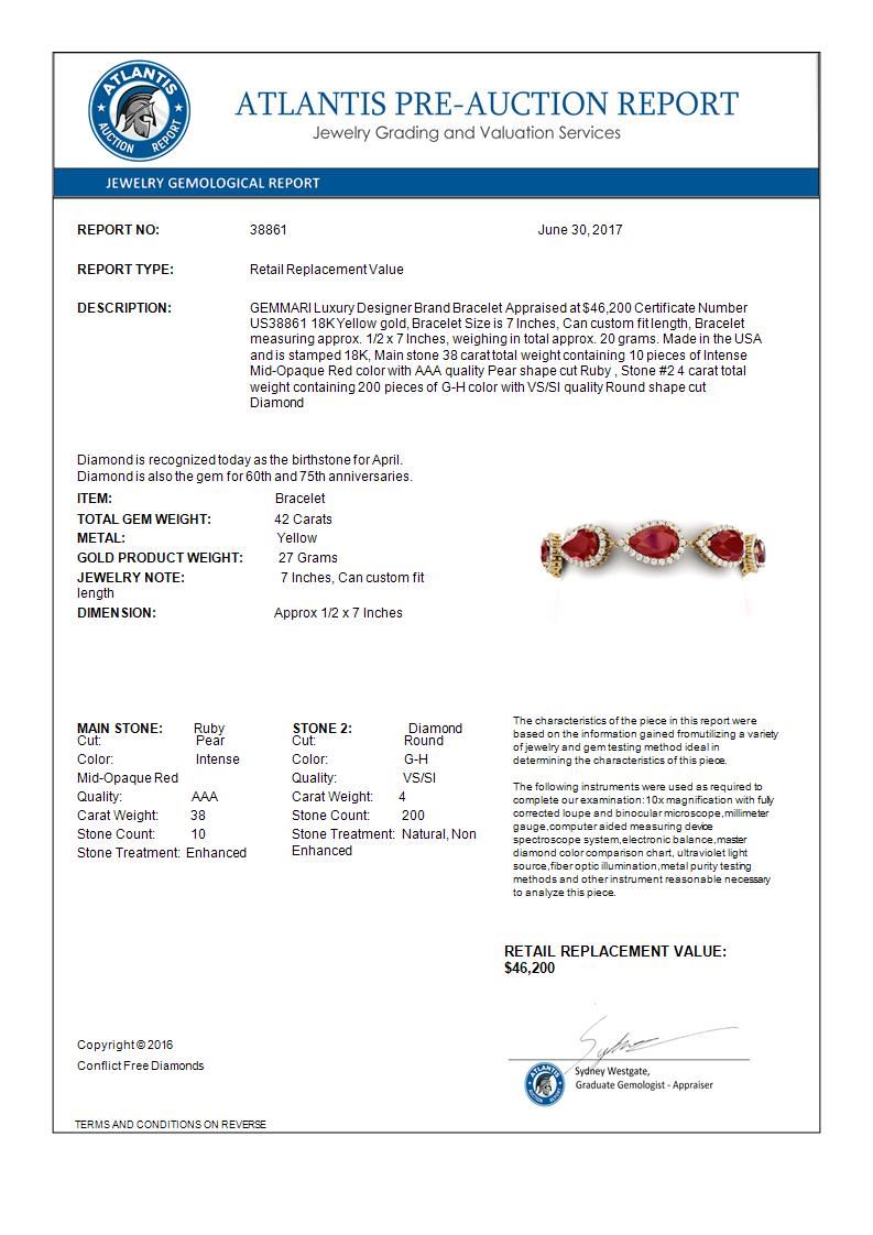 42 CTW Royalty Designer Ruby & VS Diamond Bracelet 18K Yellow Gold ---- Luxury Designer Brand Bracelet Appraised Retail Price at $46,200 ---- SKU Number US38861 18K Yellow gold Bracelet Size is 7 Inches, Can custom fit length, Bracelet measuring approx. 1/2 x 7 Inches, weighing in total approx. 20 grams. Made in the USA and is stamped 18K, Main stone 38 carat total weight containing 10 pieces of Intense Mid-Opaque Red color with AAA quality Pear shape cut Ruby , Stone #2 4 carat total weight containing 200 pieces of G-H color with VS/SI quality Round shape cut