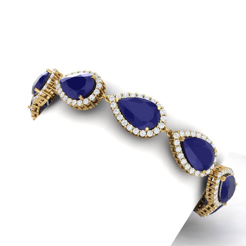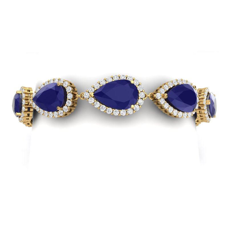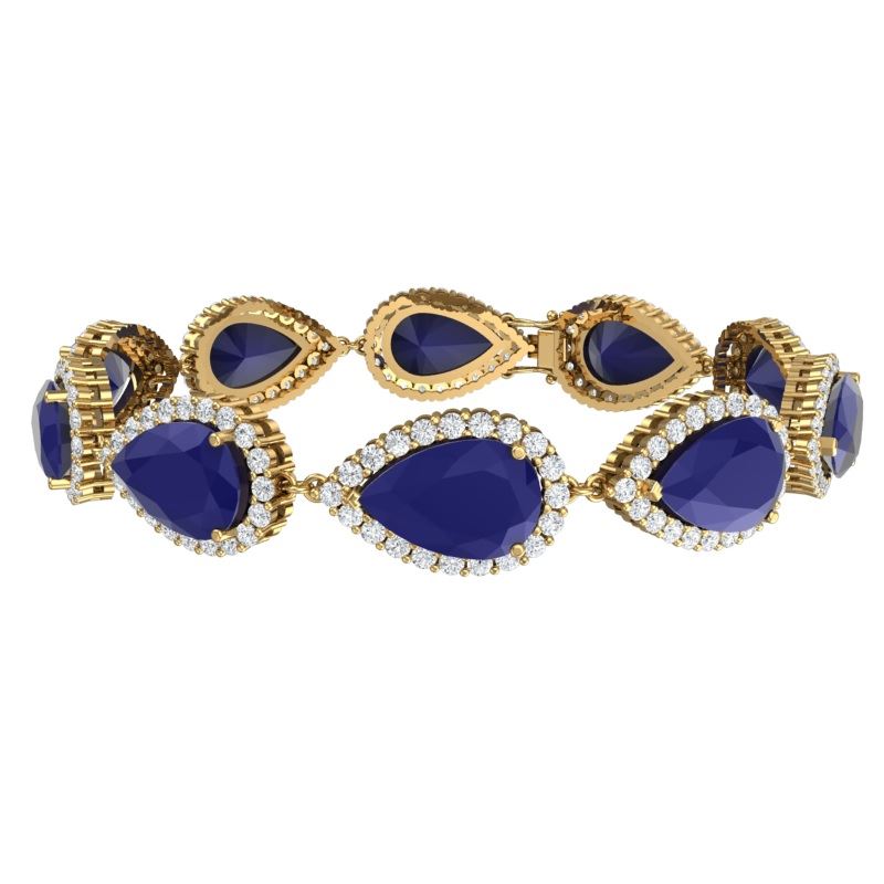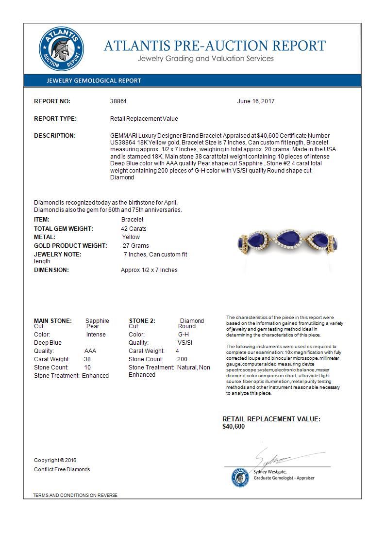42 CTW Royalty Sapphire & VS Diamond Bracelet 18K Yellow Gold ---- Luxury Designer Brand Bracelet Appraised Retail Price at $40,600 ---- SKU Number US38864 18K Yellow gold Bracelet Size is 7 Inches, Can custom fit length, Bracelet measuring approx. 1/2 x 7 Inches, weighing in total approx. 20 grams. Made in the USA and is stamped 18K, Main stone 38 carat total weight containing 10 pieces of Intense Deep Blue color with AAA quality Pear shape cut Sapphire , Stone #2 4 carat total weight containing 200 pieces of G-H color with VS/SI quality Round shape cut