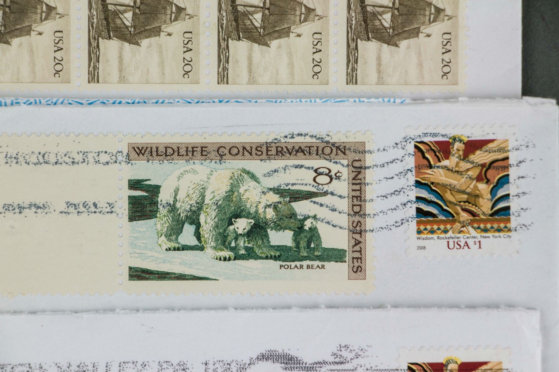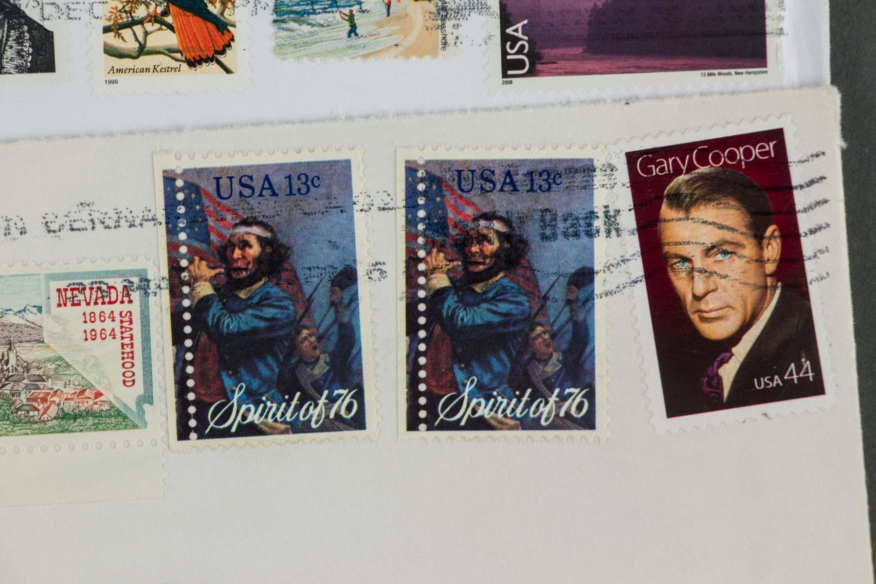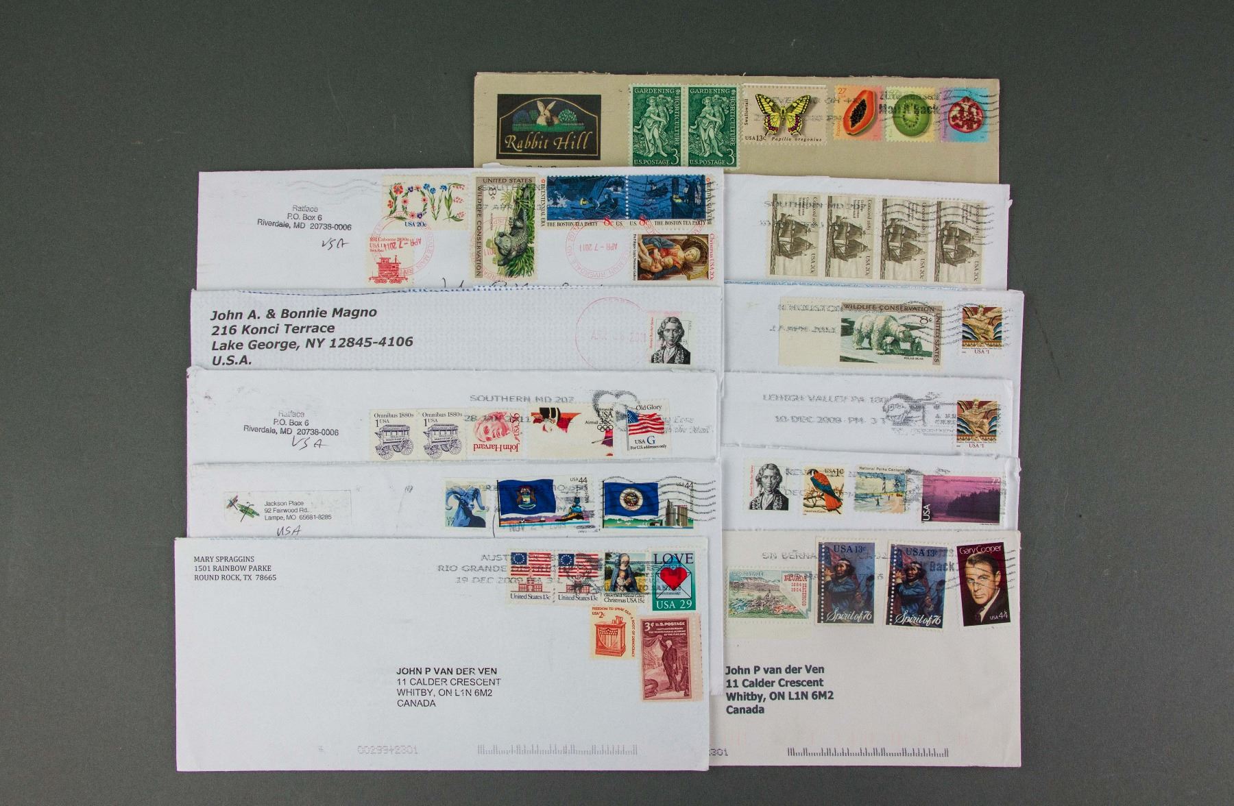 42 pieces of assorted United States stamps; with 11 pieces of envelopes; 10.5 cm x 24 cm