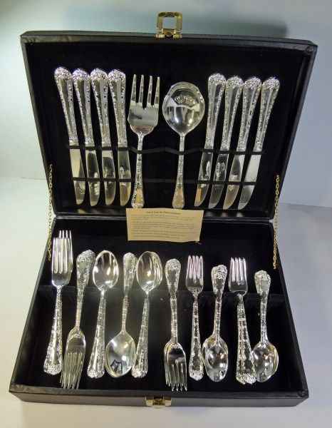 42 PIECE WM ROGERS AND SON "ENCHANTED ROSE" COLLECTION SILVER PLATED FLATWARE SET WITH CASE AND CARE INSTRUCTIONS