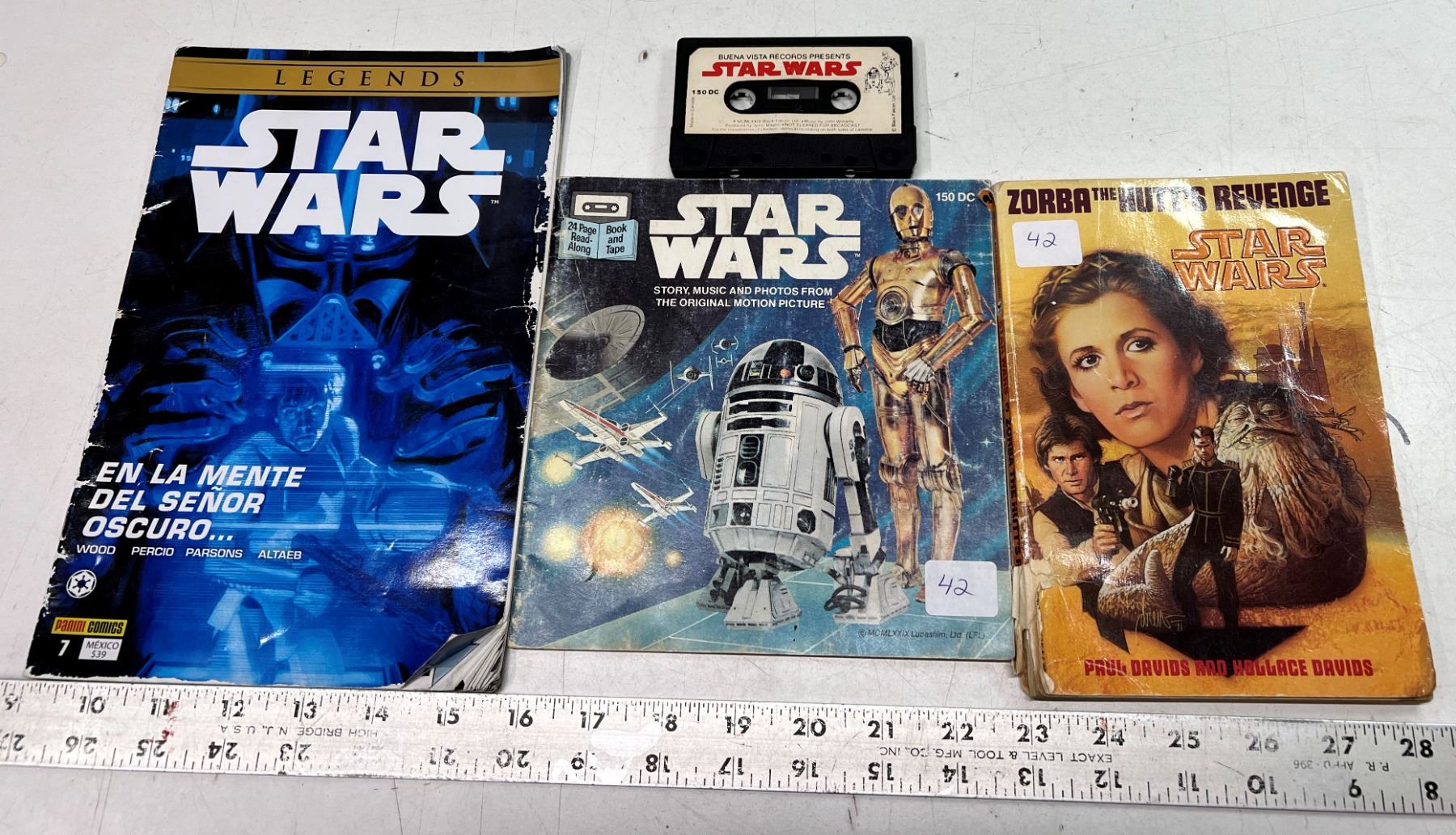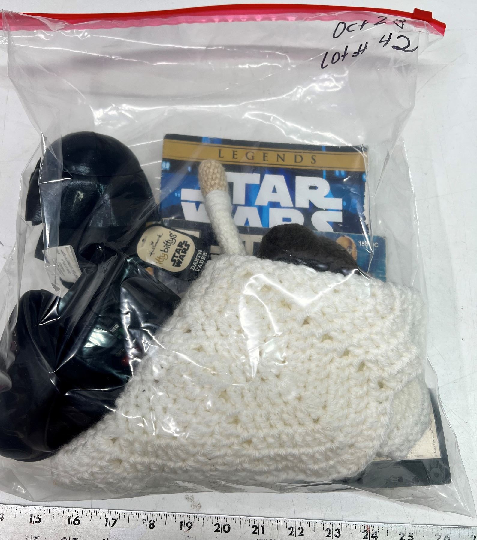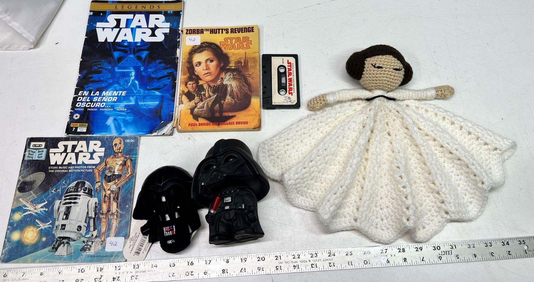 42. “Star wars” Lot – Vintage Novel, Comic and Read Along book with Cassette Tape, Darth Vader Plush and Coin Bank, Crochet Princess Leia Doll