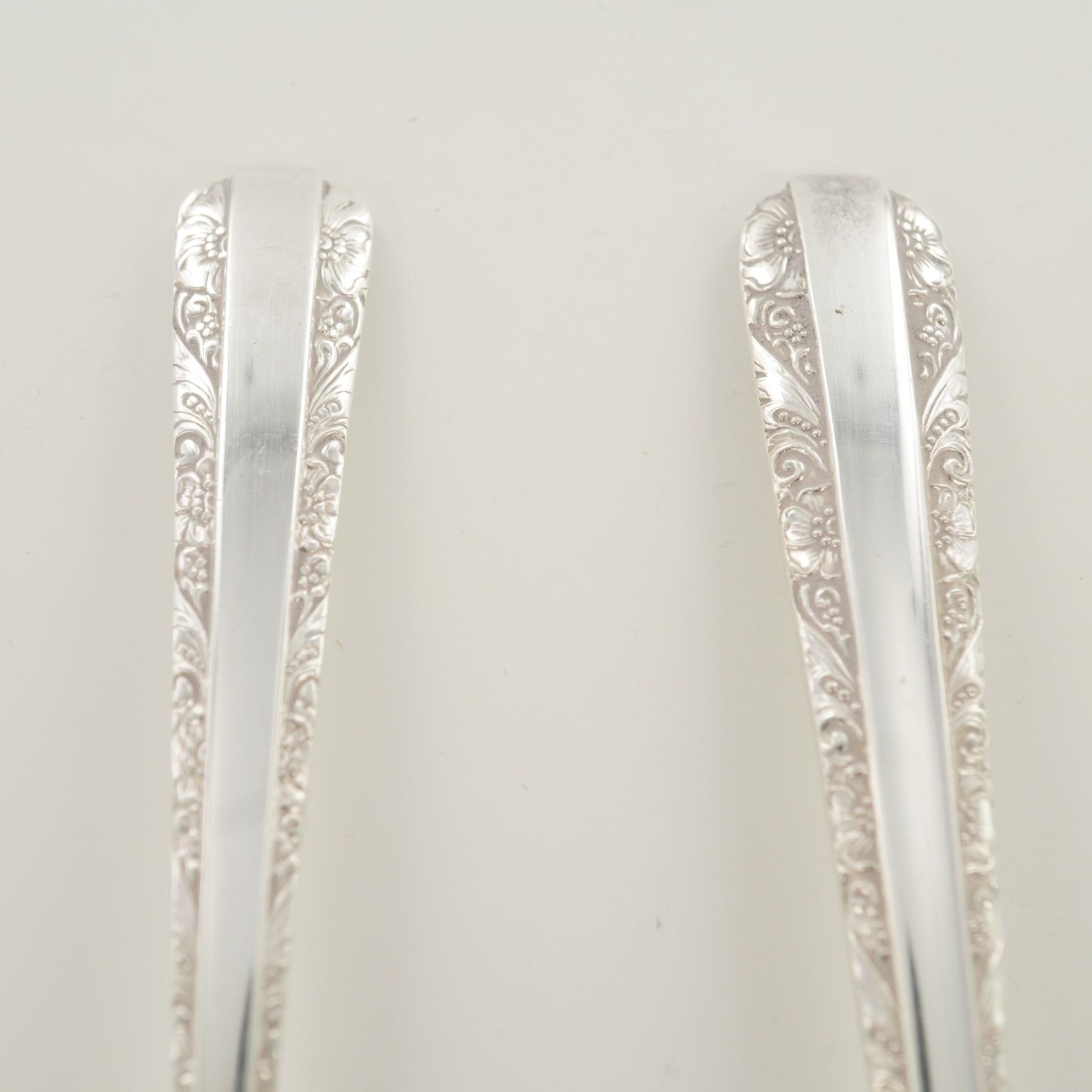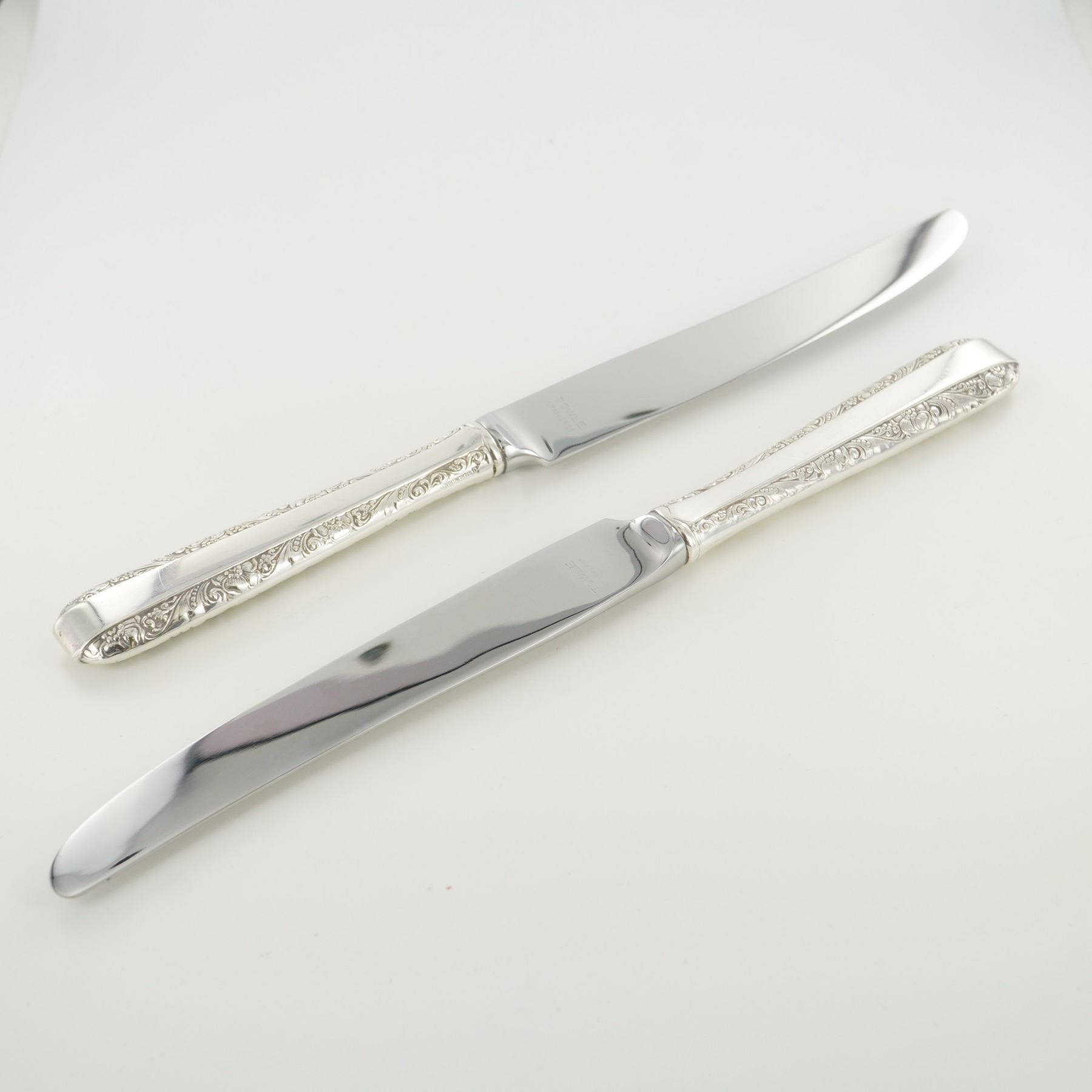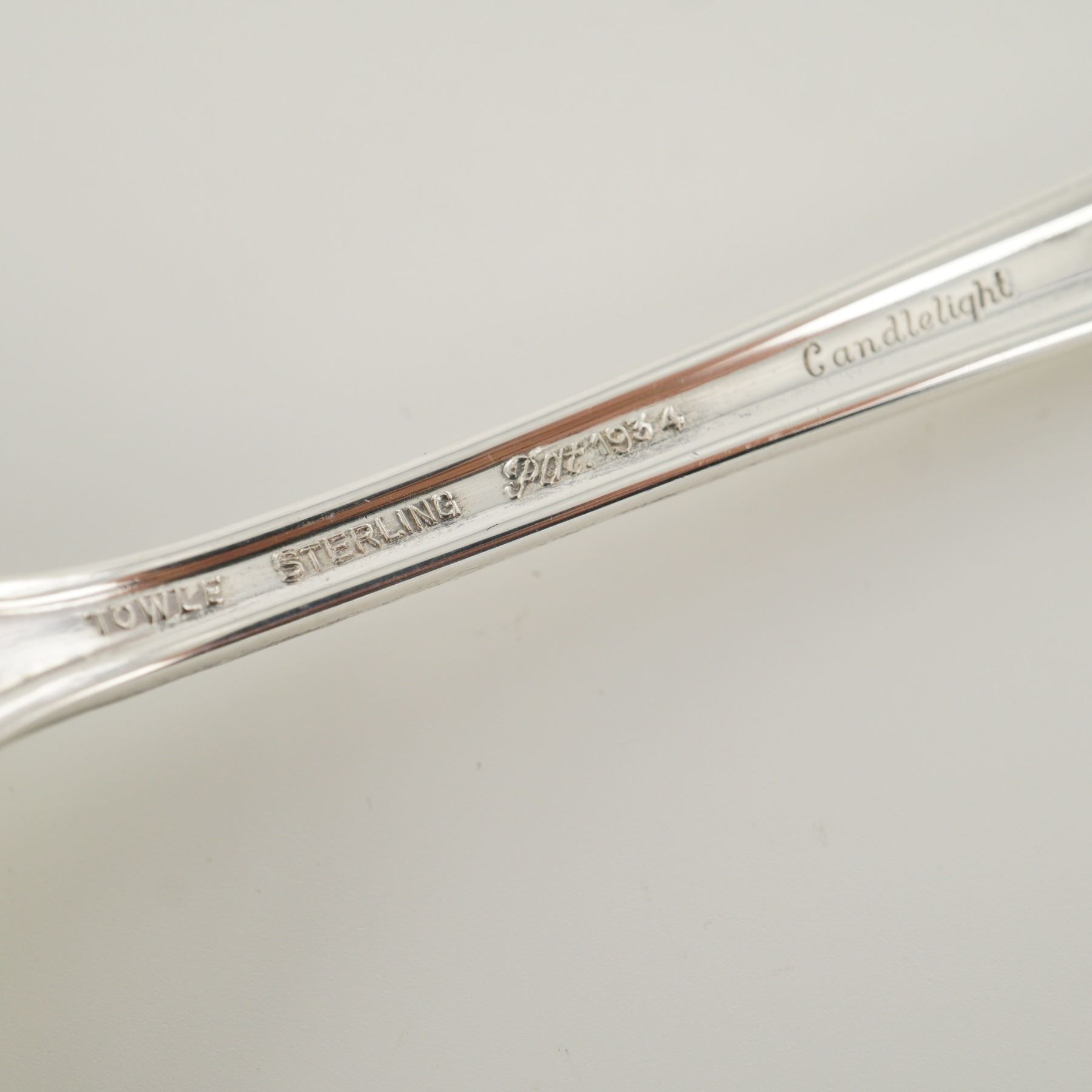Elegant 42-piece Towle Sterling Silver flatware set in the Candlelight pattern, featuring ornate floral scroll detailing along the handles. Each piece is marked Towle Sterling Candlelight, with knives bearing Towle Stainless blades and sterling handles. The set includes 8 dinner knives, 8 dinner forks, 8 salad forks, 8 soup spoons, 8 tea spoons, 1 serving spoon and 1 serving fork. Dinner knives gross weight 18 oz; Dinner forks Net Silver 11.20 troy oz. Salad forks Net Silver 8.95 troy oz. Teaspoons Net Silver 6.55 troy oz. Soup spoons Net Silver 9.30 troy oz. Spoon and fork serving set Net Silver 3 troy oz. Gross weight 60.78 oz.