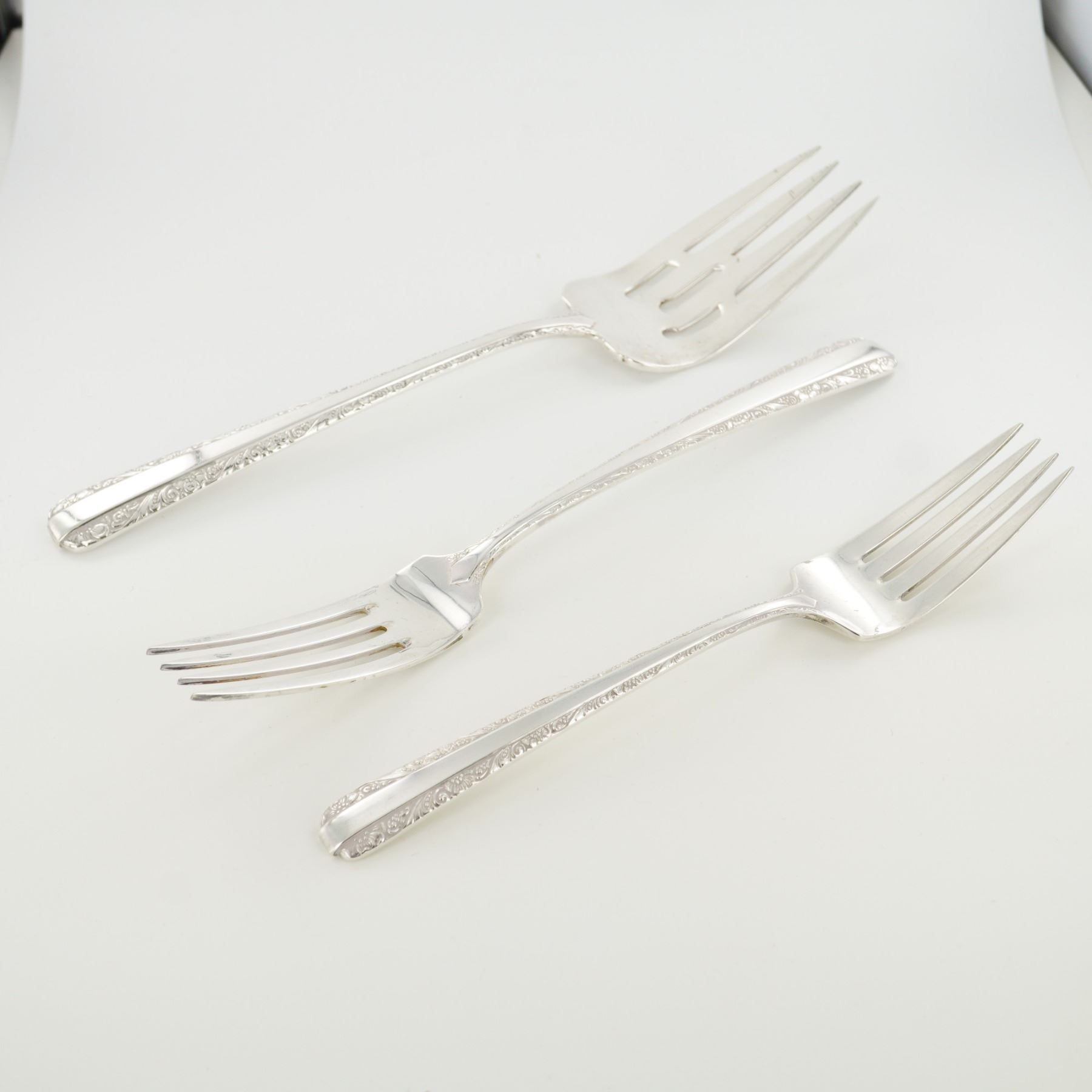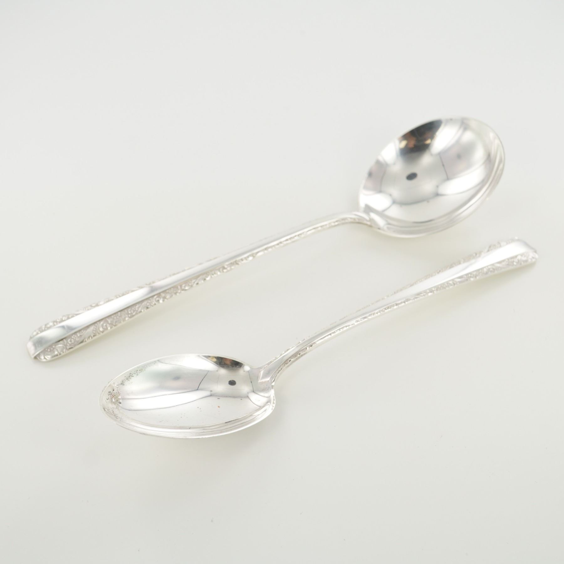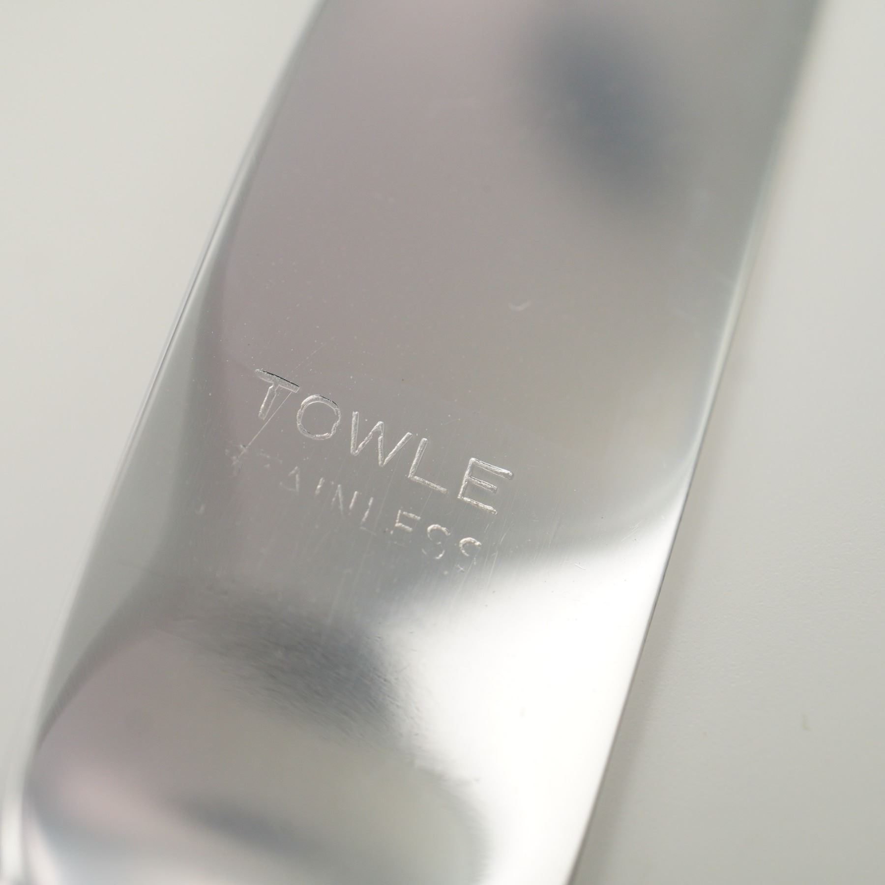 Elegant 42-piece Towle Sterling Silver flatware set in the Candlelight pattern, featuring ornate floral scroll detailing along the handles. Each piece is marked Towle Sterling Candlelight, with knives bearing Towle Stainless blades and sterling handles. The set includes 8 dinner knives, 8 dinner forks, 8 salad forks, 8 soup spoons, 8 tea spoons, 1 serving spoon and 1 serving fork. Dinner knives gross weight 18 oz; Dinner forks Net Silver 11.20 troy oz. Salad forks Net Silver 8.95 troy oz. Teaspoons Net Silver 6.55 troy oz. Soup spoons Net Silver 9.30 troy oz. Spoon and fork serving set Net Silver 3 troy oz. Gross weight 60.78 oz.