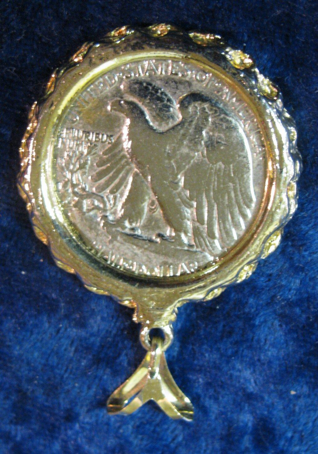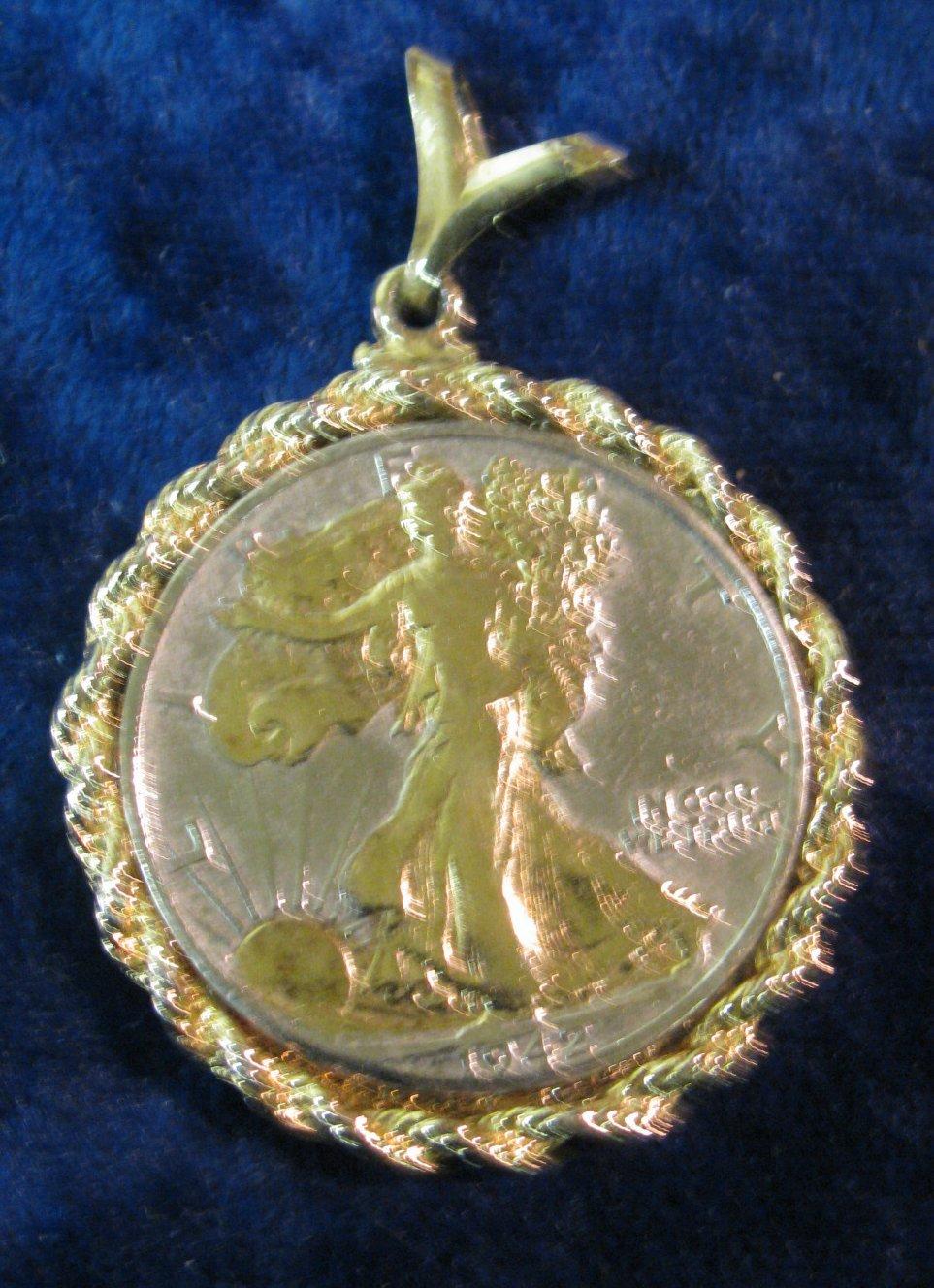 420. 1942 World War II Walking Liberty Half Dollar highlighted in 24K Gold-plated and mounted in a rope bezel. Ready to be suspended from a necklace.