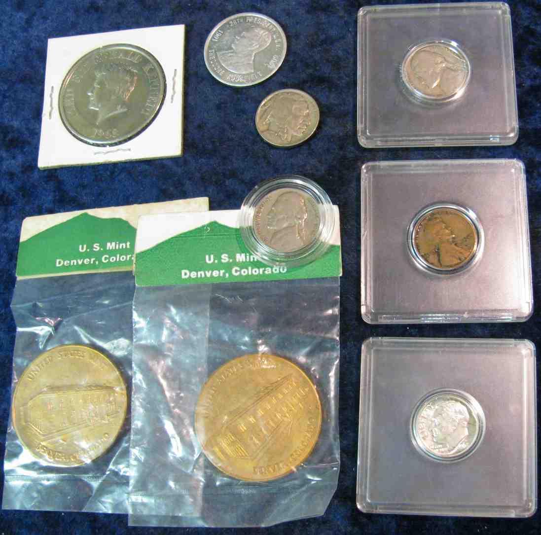 420. Buffalo Nickel; (2) Jefferson Nickels; 1944 Shell Case Cent; 1962 P Proof Dime; Theodore Roosevelt medal; (2) Denver Mint Medals; and a 39mm John Kennedy Medal.
