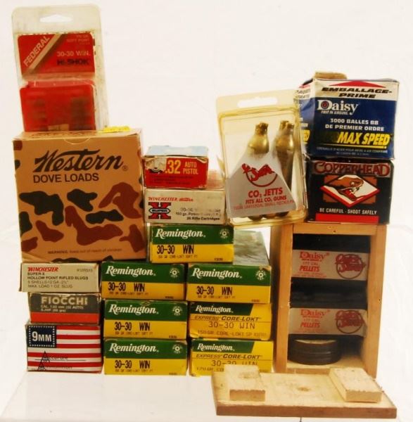 50 rds of Winchester 30-30; 350 rds of Remington 30-30; 20 rds of Federal 30-30; Wooden box of BB's and pellets 5500 .177 BB's, 15 rds of Assorted Calibers 4 Co2 Cartridges; 5 rds of 7.65mm; 5 rds of