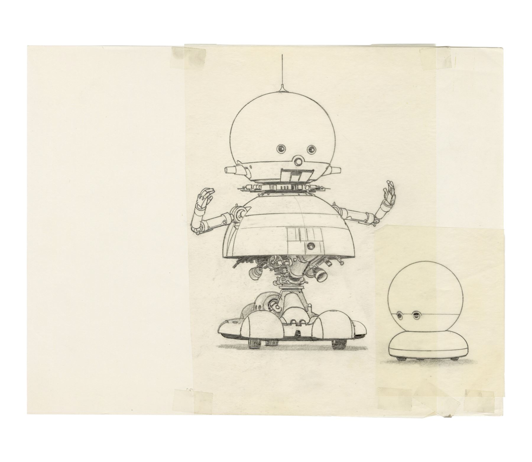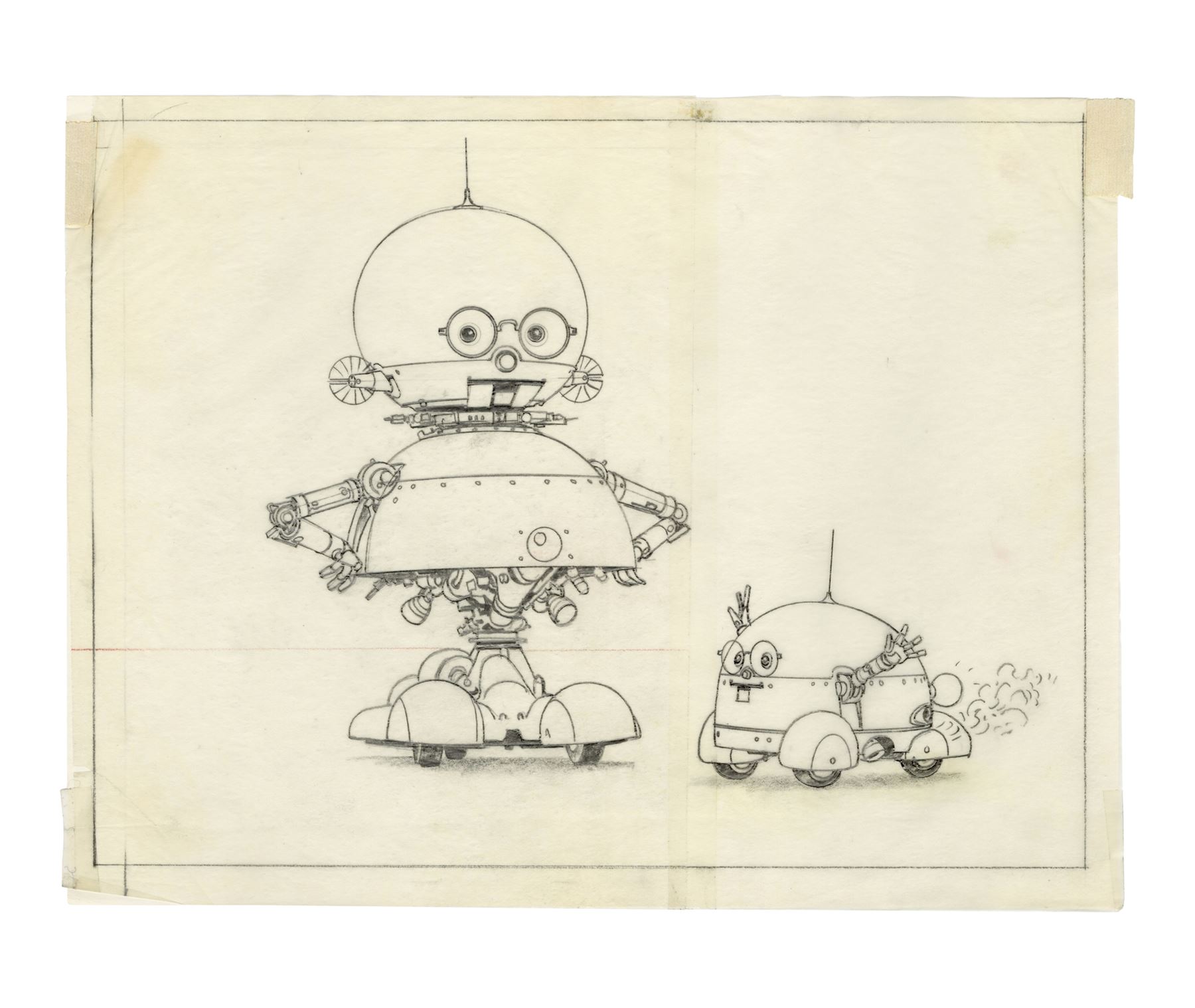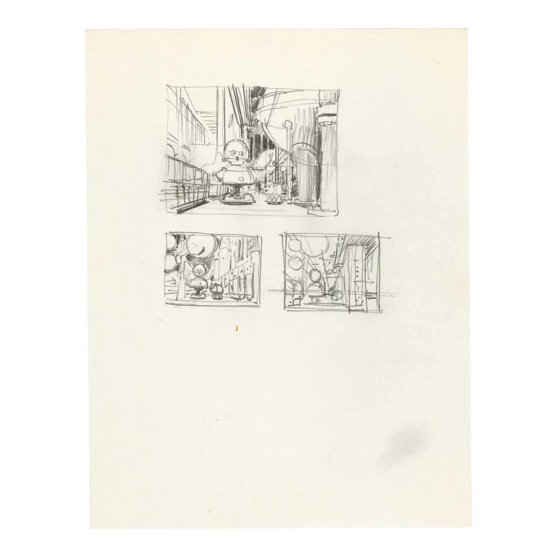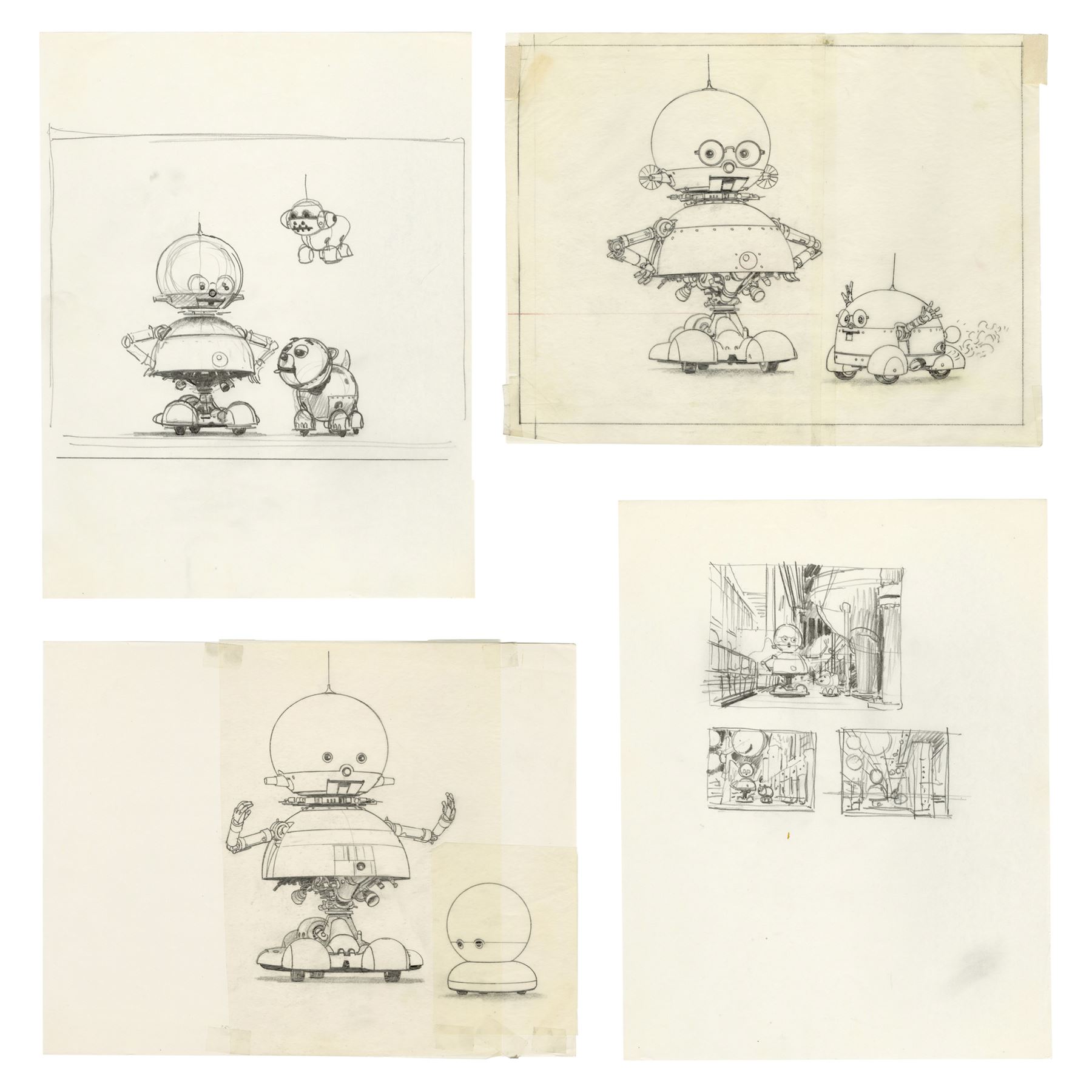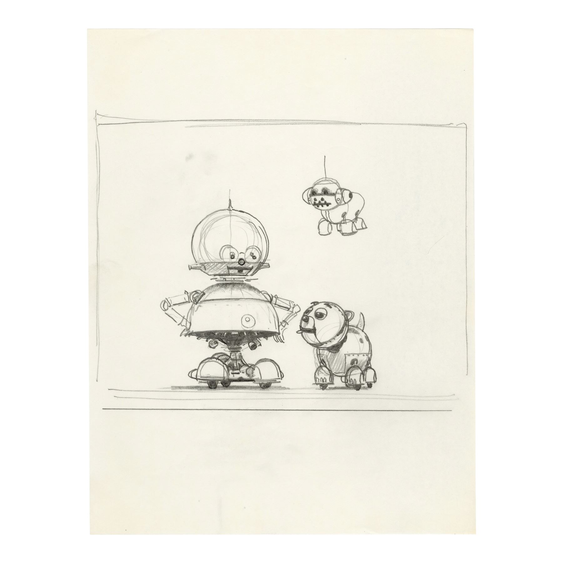 These prelims for a production painting depicting Sparky with a smaller dog-like robot known as Speedo are rendered in graphite, two on tissue paper and two on vellum. One drawing with a primitive version of the dog-bot is taped to vellum backing. The set exhibits graphite smudging and some tearing along the sheets' edges. Dimensions: (each) 8.5" x 11" (21.75 cm x 28 cm)