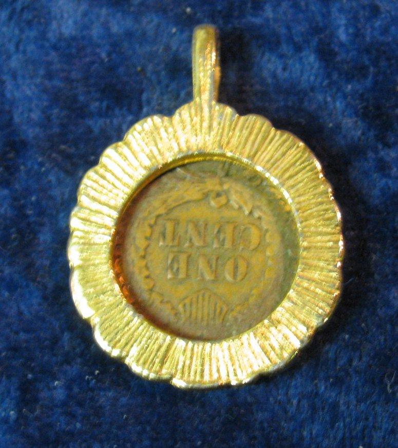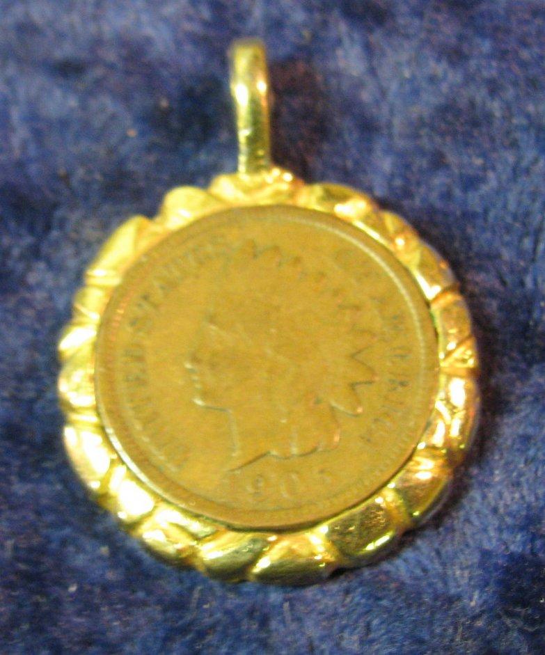 421. 1905 Indian Head Cent in 24K Gold-plated rope bezel. Ready to be suspended from a necklace.