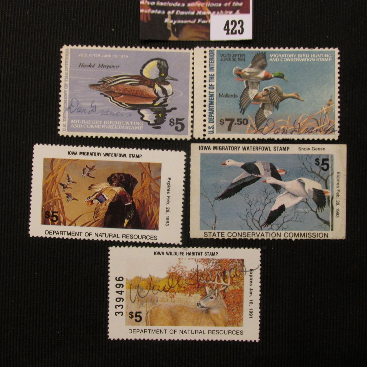 423.1978 RW45, 1980 RW47 U.S. Migratory Bird hunting Stamps, both signed; 1982 & 92 Iowa Migratory Waterfowl Stamps, both signed; & 1990 Iowa Wildlife Habitat Stamp, signed.