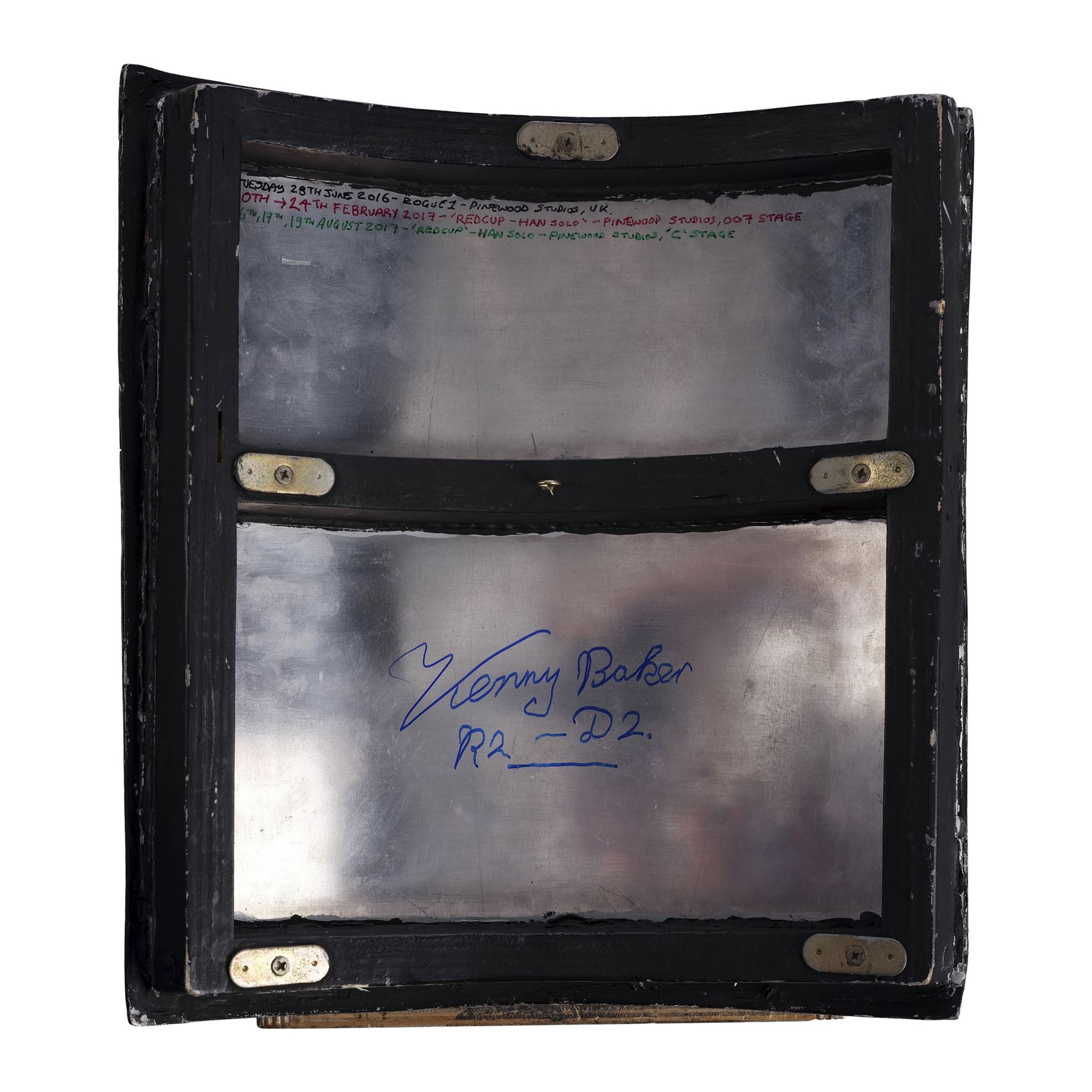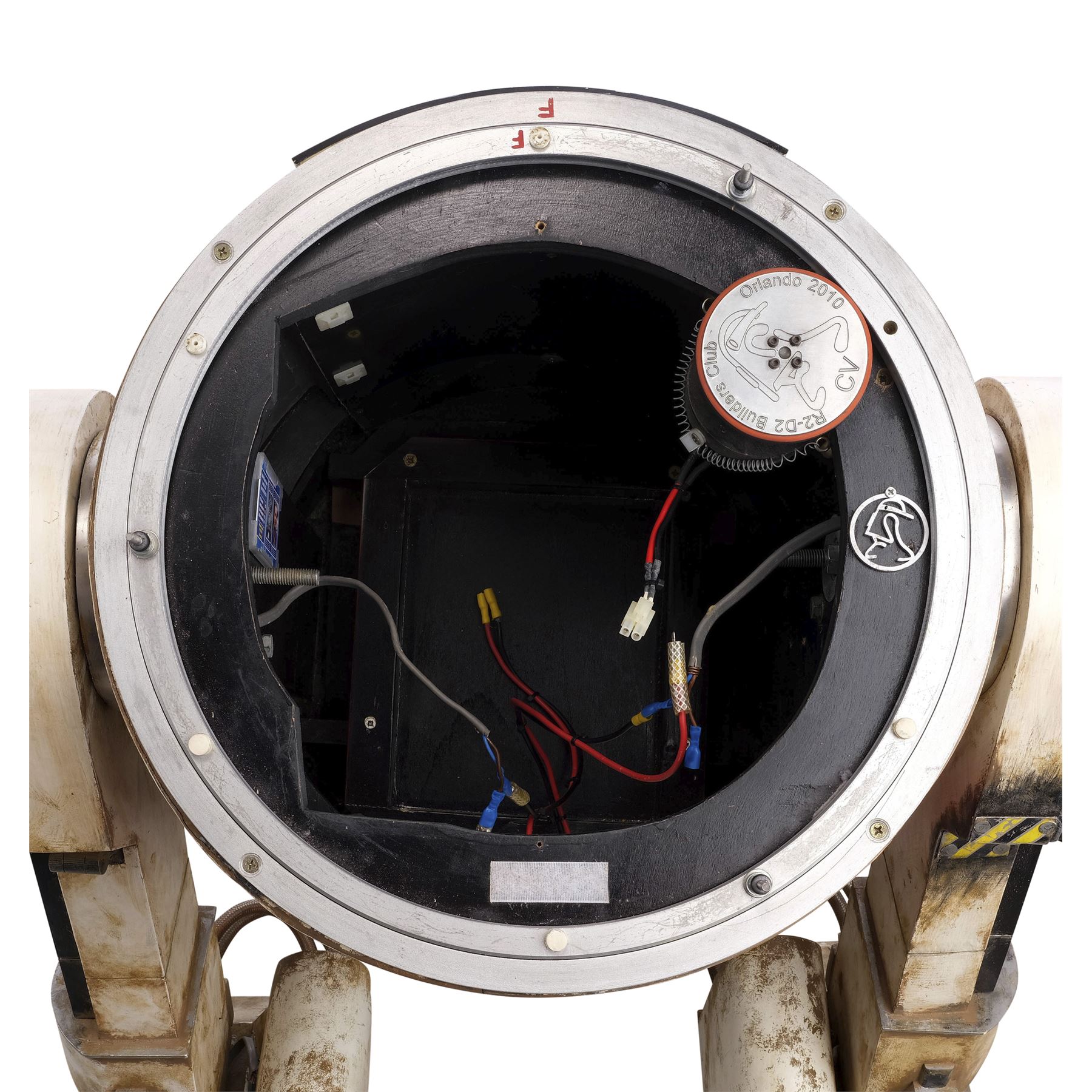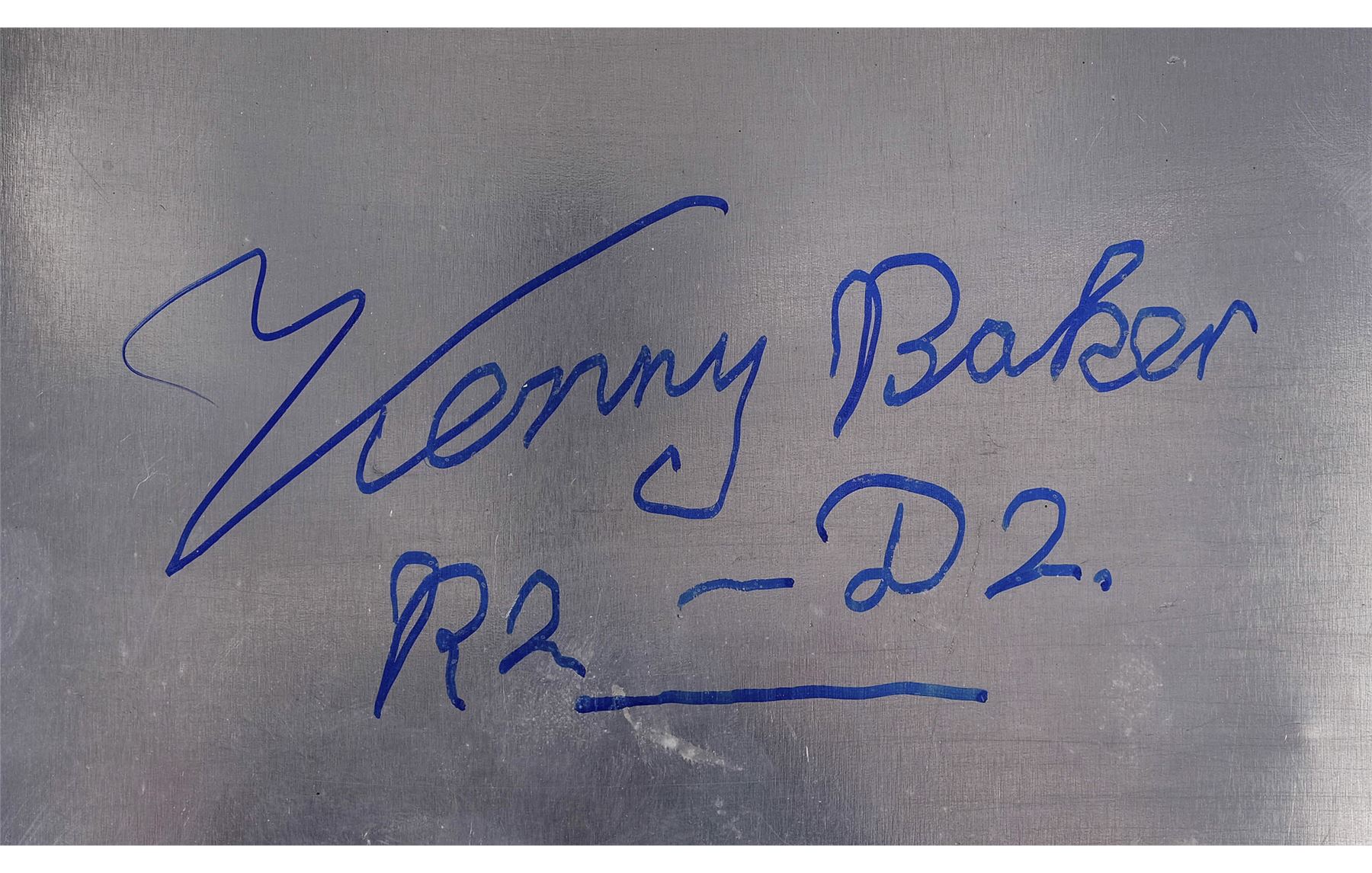 R2-S8 can be driven by remote control with a rotating dome and light effects, powered by battery. The removable back panel is autographed in blue pen by R2-D2 performer Kenny Baker. Also written on the panel are three sets of dates and locations, indicating when the droid was used for filming. Bone's "UK R2D2 Builders Pass" is clipped inside the chassis, along with badges for the "Astromech Droid Collection" and the "R2-D2 Builders Club."