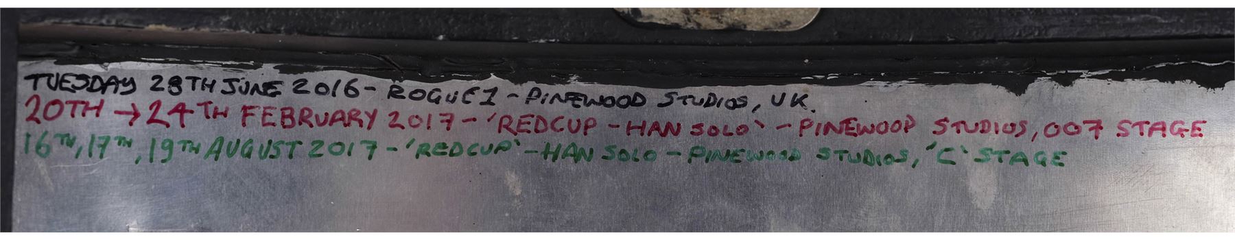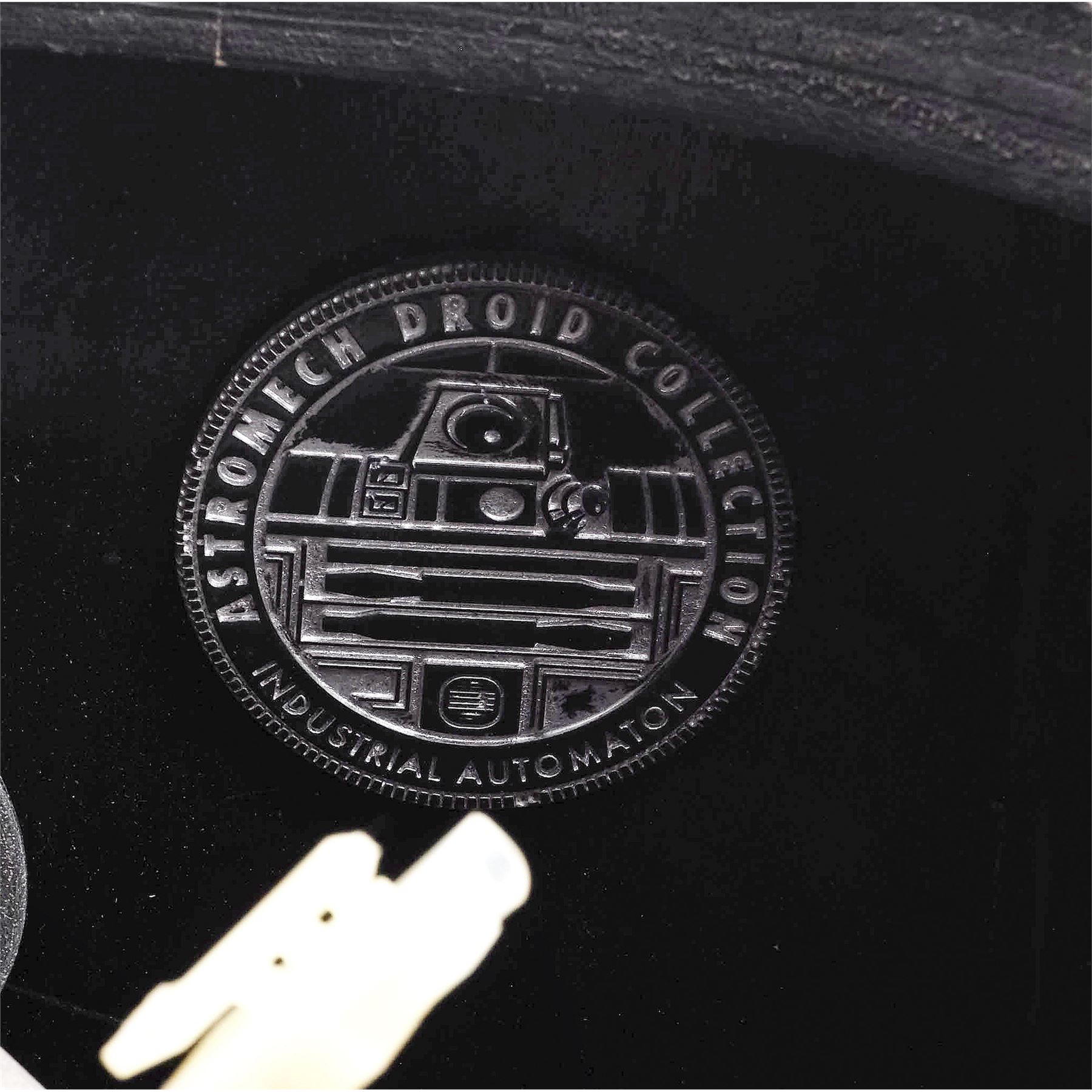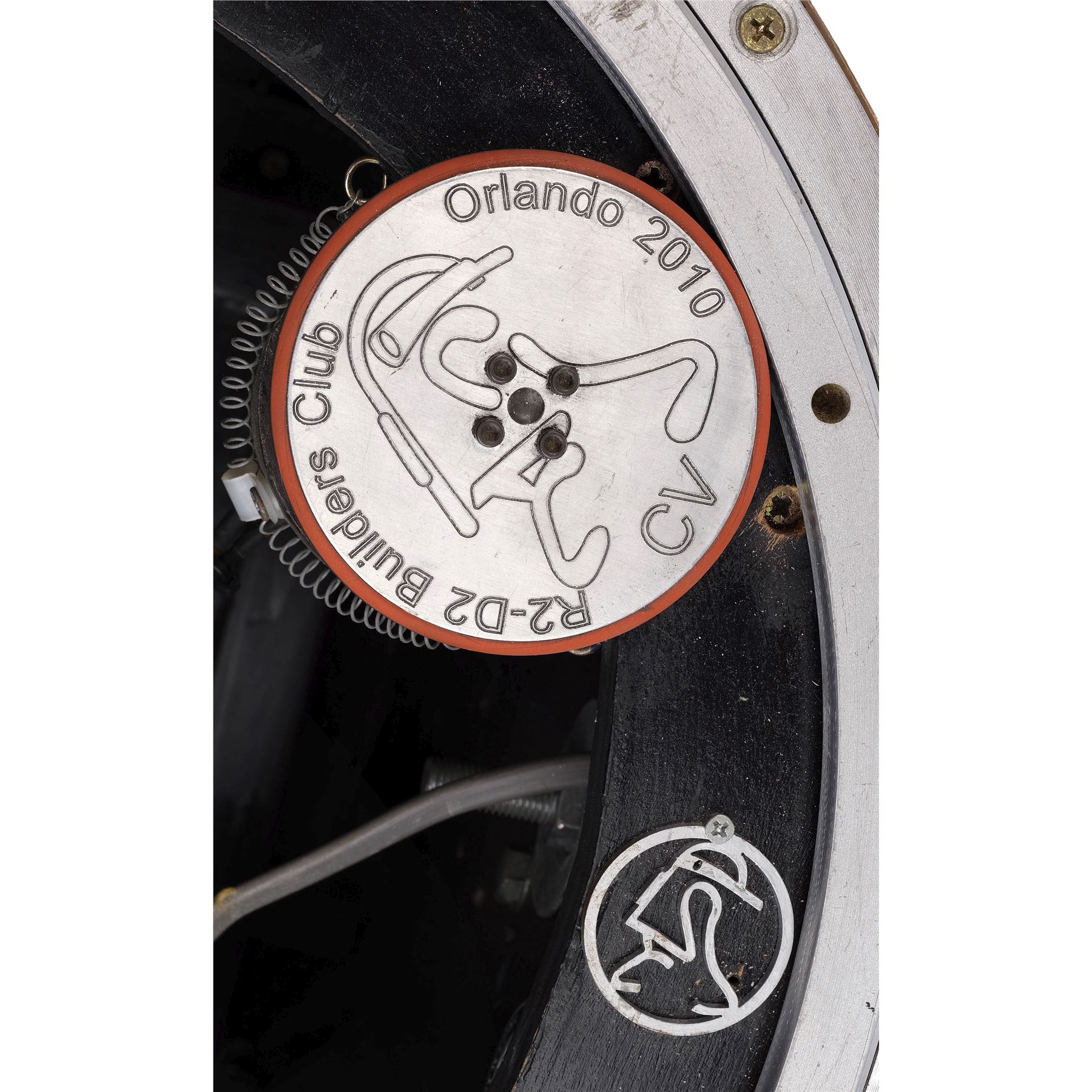 R2-S8 can be driven by remote control with a rotating dome and light effects, powered by battery. The removable back panel is autographed in blue pen by R2-D2 performer Kenny Baker. Also written on the panel are three sets of dates and locations, indicating when the droid was used for filming. Bone's "UK R2D2 Builders Pass" is clipped inside the chassis, along with badges for the "Astromech Droid Collection" and the "R2-D2 Builders Club."