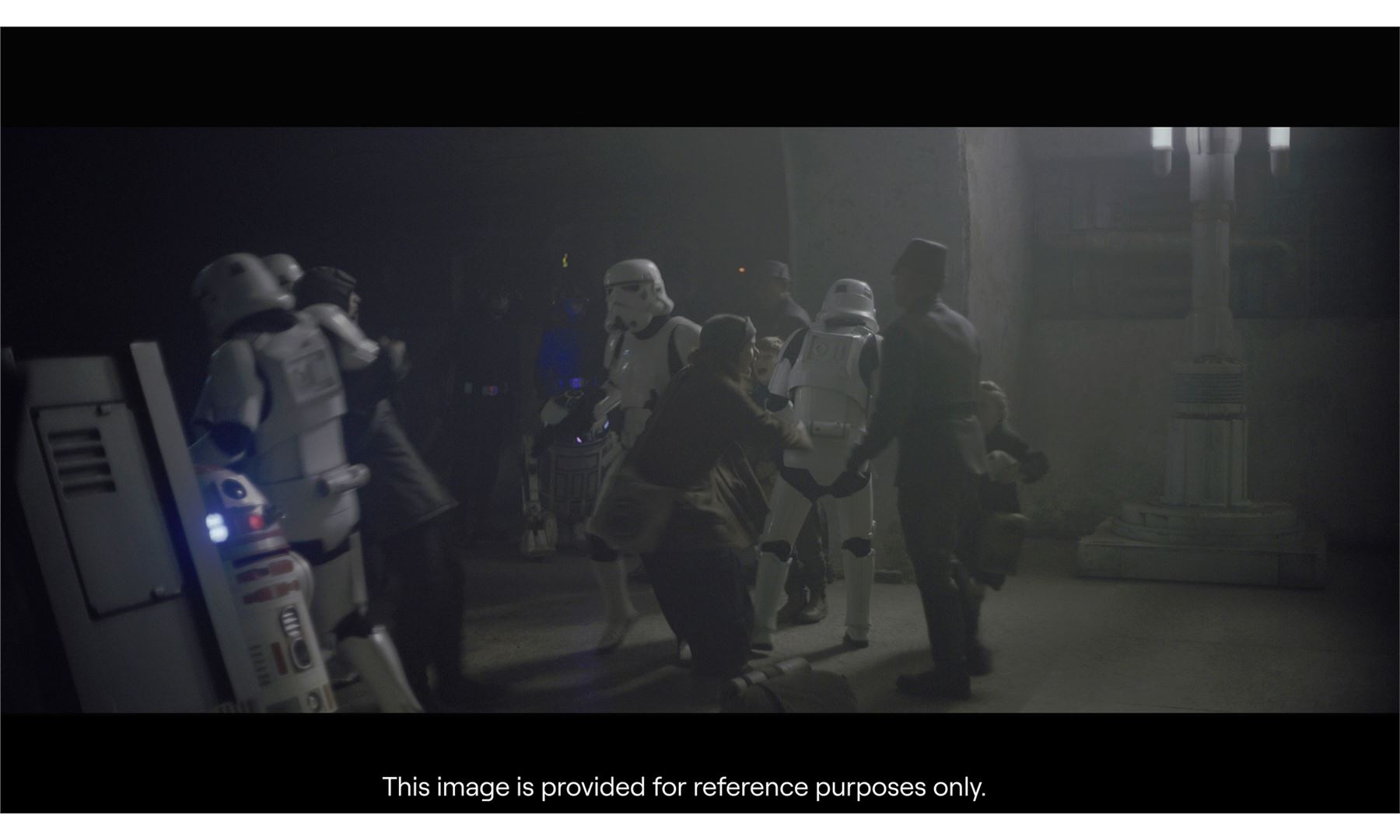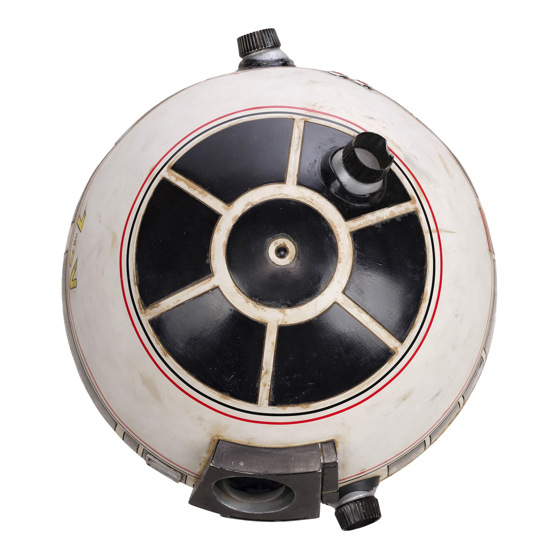 Constructed by Stuart Bone, this droid was originally built for use on Rogue One: A Star Wars Story, although its scene was cut from the final film. It has a plywood frame and legs, with a fiberglass dome and a hand-cut aluminum outer skin. Its hand-painted finish is predominantly white, black, and red, and the droid is intentionally distressed to look dusty, dirtied and well-used during its life at the spaceport.