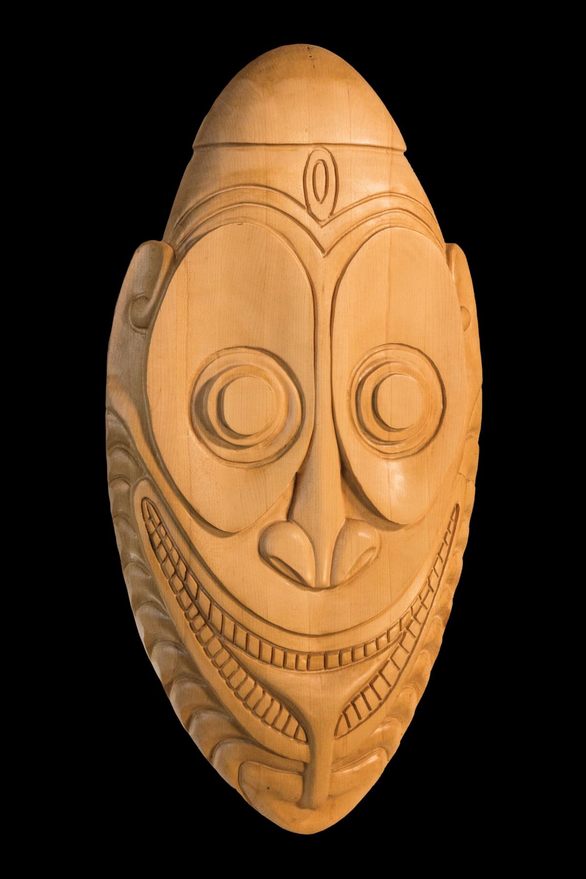 (2000s) This is one of the most famous OA designs and one of Bob and LeRoy's favorites. This style was used throughout the commercial Polynesian Pop industry with repeated use at Disney theme parks and resorts. In fact, Disney has used this creation in a good deal of themed merchandising. Here is an original. This is a modern master pattern of the largest version of the mask, used in the past decade or so to create stock that have been sold during that period. No stain or paint treatment, the sharp carving features a nice wax patina. 36"x18". VG+.