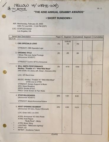 42nd annual Grammy awards script - This is an original short rundown script for "The 42nd Annual Grammy Awards" that David Defino used when he worked on the lighting for the show. Comes with a letter of provenance from David Defino who is an Academy Award winning effects artist and Emmy winning lighting technician. He was the foreman at Gene Young Effects and worked on many amazing, iconic movies and commercials as well as special government projects and private industry and museums. (9x11)