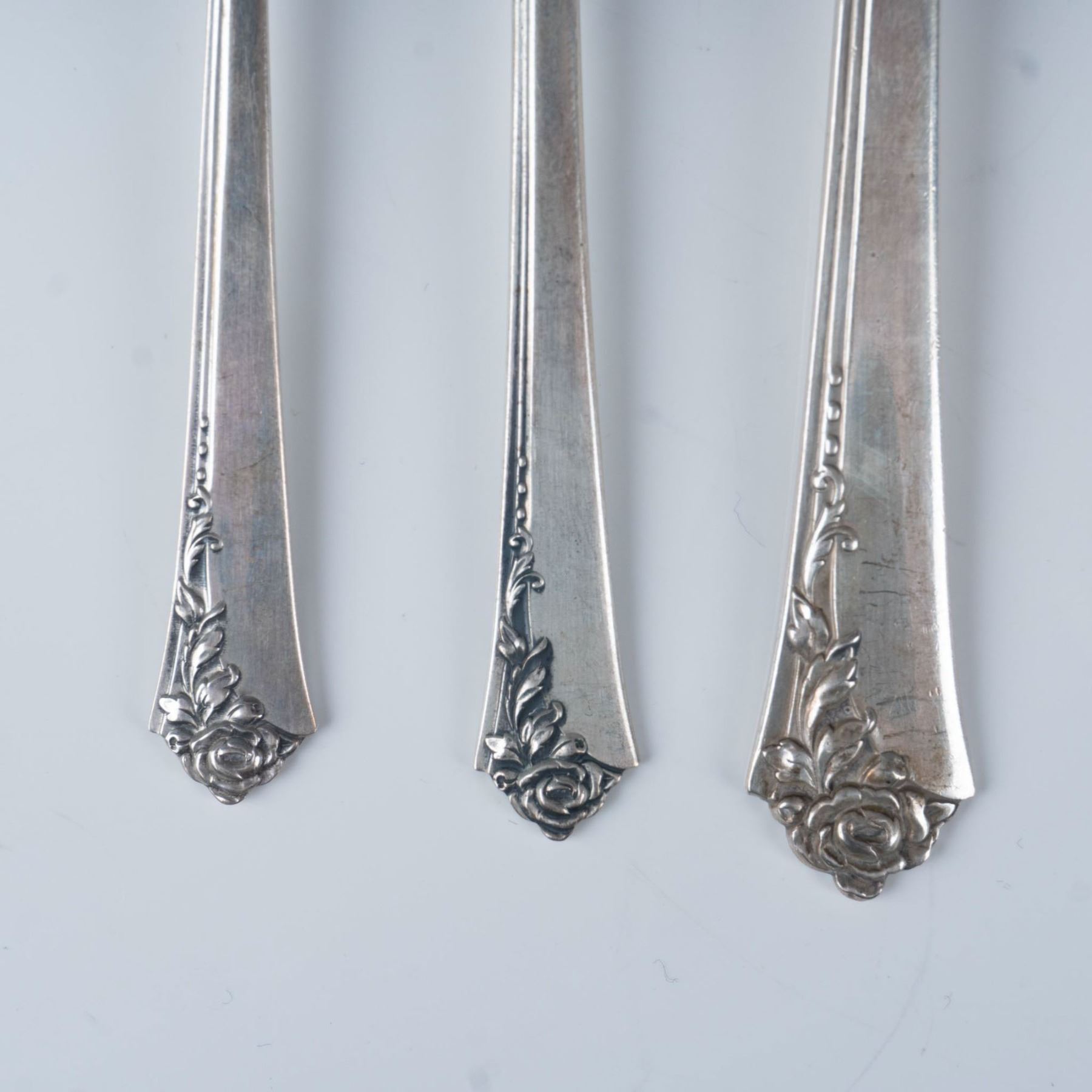 This gorgeous set includes six dinner forks (7.25"L), six salad forks (6.75"L), six spoons (6.25"L), five soup spoons (6.25"L), four serving spoons (8.25"L), one gravy ladle (6.25"L), one olive fork (5.5"L), six demitasse spoons (4.25"L), one cheese knife (6.5"L), and six cocktail forks (5.5"L). Each piece is marked Heirloom Sterling on the back. The total weight, with the cheese spade's stainless blade included, is 1404g.